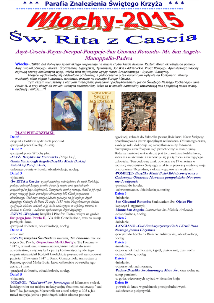 *** Parafia Znalezienia Świętego Krzyża *** ************************************************************************ Asyż-Cascia-Rzym-Neapol-Pompeje-San Giovani Rotondo- Mt. San AngeloManoppello-Padwa Włochy–Italia; But Półwyspu Apenińskiego rozpoznaje na mapie chyba każde dziecko. Kształt Włoch określają od północy Alpy i wokół półwyspu morza: Śródziemne, Liguryjskie, Tyrreńskie, Jońskie i Adriatyckie. Prócz Półwyspu Apenińskiego Włochy zajmują szereg okolicznych wysp, wśród nich największe wyspy Morza Śródziemnego - Sycylię i Sardynię. Miejsce wydawałoby się oddzielone od Europy, a jednocześnie o tak ogromnym wpływie na kontynent. Włochy wycisnęły silne piętno kulturowe, naukowe, prawne na rozwoju Europy i świata. Tym razem wyruszamy z różnymi intencjami; prośbami i podziękowaniami już do Świętego-Naszego Kochanego- Jana Pawla II, a przy okazji do innych ważnych sanktuariów, które to w sposób namacalny utwierdzają nas i pogłębią nasza wiarę, nadzieję i miłość...!!! PLAN PIELGRZYMKI: Dzień 1 -wyjazd z Polski w godzinach popołud. -przejazd przez Czechy, Austrię. Dzień 2 -przejazd przez Włochy płn. -ASYŻ- Bazylika św.Franciszka /Msza Św./, -Santa Maria degli Angeli-Bazylika Matki Boskiej Anielskiej-Porcjunkula, -zakwaterowanie w hotelu, obiadokolacja, nocleg. Dzień 3 -śniadanie -Św.RITA z Cascia- z racji wielkiego nabożeństwa do męki Pańskiej, podczas adoracji krzyża prosiła Pana by mogła choć symbolicznie uczestniczyć w Jego cierpieniach. Otrzymała cierń z korony, tkwił w jej czole przez resztę jej życia, powodując nieustanny ból. Cierń pozostawał niewidoczny. Ślad rany można jednak zobaczyć na jej czole po dzień dzisiejszy. Odeszła do Pana 22 maja 1457 roku. Natychmiast po śmierci zasłynęła wieloma cudami, a jej ciało umieszczono w szklanej trumnie w kościele w Cascia – cudownie zachowane po dzień dzisiejszy. -RZYM –Watykan; Bazylika i Plac Św. Piotra, wizyta na grobie Świętego Jana Pawła II, Via della Conciliazione, czas na zakup pamiątek i inne. -przejazd do hotelu, obiadokolacja, nocleg. Dzień 4 -śniadanie -RZYM; Bazylika Św.Pawła za murami, Tre Fontane- miejsce ścięcia Św. Pawła, Objawienia Matki Bożej w Tre Fontane w 1947 r, rzymskiemu tramwajarzowi, który należał do sekty adwentystów, związany był z partią komunistyczną i do tego stopnia nienawidził Kościół katolicki, że postanowił zamordować papieża. 12 kwietnia 1947 r. Bruno Comacchiola, tramwajarz z Rzymu, spotkał Matkę Bożą, która całkowicie odwróciła jego życie..., i inne. -przejazd do hotelu, obiadokolacja, nocleg. Dzień 5 -śniadanie -NEAPOL- "Cud krwi" św. Januarego; od kilkunastu stuleci, każdego roku ma miejsce nadzwyczajny fenomen, tak zwany "cud krwi" św. Januarego. Męczennik ten został ścięty w 305 r. Jak mówi tradycja, jedna z pobożnych kobiet obecna podczas egzekucji, zebrała do flakonika pewną ilość krwi. Krew Świętego przechowywana jest w specjalnym relikwiarzu. Od tamtego czasu, każdego roku dokonuje się niewytłumaczalny fenomen. Skrzepnięta krew "ożywia się" przechodząc w stan płynny. Badania naukowe wykazały, że jest to prawdziwa ludzka krew, która ma właściwości i zachowuje się jak tętnicza krew żyjącego człowieka. Ten cudowny znak powtarza się 19 września w rocznicę męczeństwa Świętego, a także w pierwszą niedzielę maja oraz czasami 16 grudnia, z okazji wyjątkowych wydarzeń. -POMPEJE- Bazylika Matki Bożej Różańcowej wraz z Cudownym Obrazem; Nowenna pompejańska-Nowenna nie do odparcia -przejazd do hotelu, -zakwaterowanie, obiadokolacja, nocleg. Dzień 6 -śniadanie, -San Giovanni Rotondo; Sanktuarium Św. Ojciec Piokapucyn i stygmatyk, -Monte San Angelo-Sanktuarium Św. Michała Archanioła, -obiadokolacja, nocleg. Dzień 7 -śniadanie, -LANCIANO -Cud Eucharystyczny Ciała i Krwii Pana Naszego Jezusa Chrystusa -przejazd do hotelu na Riwierze Adriatyckiej, obiadokolacja, nocleg. Dzień 8 -śniadanie, -odpoczynek nad morzem; kąpiel, plażowanie, czas wolny -obiadokolacja, nocleg. Dzień 9 -śniadanie, -odpoczynek nad morzem, -Padwa-Bazylika Św.Antoniego, Msza Św., czas wolny na zakup pamiątek. -w godz. wieczornych wyjazd w kierunku kraju Dzień 10 -powrót do kraju w godzinach przedpołudniowych, -zakończenie pielgrzymki. TERMIN: 6-15.09. 2015 CENA: 1999 PLN (min 45 uczestników) Cena:2049 Pln; 30-44 uczest., Cena: 2099 zł; 17-29 uczest. Świadczenia: Uwagi: - przejazdy autokarem (klimatyzacja, video, wc, barek) - noclegi w hotelach (pokoje 2,3-osobowe z łazienkami) - śniadania i obiadokolacje (bez napoi) w miejscach noclegów - pilot na trasie - ubezpieczenie KL+NW -Bilety wstępu, opłaty turystyczne, klimatyczne, tax-y, lokalni przewodnicy, sluchawki, itp- pokrywa uczestnik=75 € /obligatoryjnie/ - Program ma charakter ramowy, kolejność może ulec zmianie. Program jest ramowy, kolejność zwiedzania może ulec zmianie! Zgłoszenia przyjmuje: Ks. Krzysztof KLAJMON, tel. 33/853 24 16 Przy zapisie na pielgrzymkę wpłacamy zaliczkę w wysokości 400 zł. W przypadku rezygnacji z uczestnictwa nie można otrzymać zwrotu wpłaconej kwoty –należy znaleźć zastępstwo- inną osobę. Pielgrzymka jest czasem zbliżania się do Boga i drugiego człowieka. Niech czyste sumienie pozwoli każdego dnia przyjmować Komunię Św. „Przechodzić przez świat jak pielgrzym, który myśl swoją ciągle kieruje do celu -do Boga” - św. Urszula Ledochowska www.PielgrzymkiDoMiejscSwietych.com