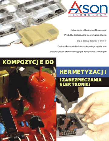 T E C H N O L O G Y Laboratorium Badawczo-Rozwojowe Produkty dostosowane do wymagań klienta Duże doświadczenie w branży Doskonały serwis techniczny i obsługa logistyczna Wysoka jakość elektroizolacyjnych kompozycji żywicznych KOMPOZYCJE DO HERMETYZACJI I ZABEZPIECZANIA ELEK TRONIKI SZEROKA GAMA ŻYWIC ELEKTROIZOLACYJNYCH Dysponując 70-letnim doświadczeniem Axson Technologies znajduje się w ścisłej czołówce światowej producentów wysoko technologicznych żywic epoksydowych i poliuretanowych. Oferujemy klientom nasze doświadczenie i pomoc w doborze odpowiednich produktów w zależności od postawionych wymagań. Nasze produkty nie zawierają rozpuszczalników i spełniają Dyrektywę ROHS. Nasze formuły żywic elektroizolacyjnych są w stanie zadowolić najbardziej wymagających klientów zarówno pod względem parametrów technicznych jak i technologicznego przystosowania do maszyny dozującej. Kompozycje posiadają szeroki zakres lepkości, twardości, parametrów wytrzymałościowych i proporcji mieszania. Naszą siłą jest możliwość obsługi firm mających swoje centra produkcyjne na całym świecie... Posiadając 12 bezpośrednich przedstawicielstw, 6 ośrodków rozwoju, 6 fabryk produkcyjnych oraz 30 wyłącznych dystrybutorów na całym świecie jesteśmy wiodącym producentem technicznych żywic na świecie. Nasze fabryki zlokalizowane są we Francji (Saint Ouen L Aumone), Słowacji (Złote Morawce), Japonii (Nagoya), USA (Detroit), Chinach (Szanghaj), Indie (Pune). Nasi klienci mogą być pewni, że używają najnowszych formuł technologicznych. Mając szerokie doświadczenie w formułowaniu kompozycji żywicznych rozszerzyliśmy naszą działalność na dziedziny kompozytów, klejów strukturalnych, żywic do wzorców i prototypów. Jakość i śr odowisko Axson Technologies jest jedną z pierwszych firm z tej branży, która uzyskała certyfikat jakości ISO 9001. Od 1991 roku konsekwentnie wprowadzamy system Jakości Całkowitej w naszej wewnętrznej organizacji. Naszym nadrzędnym celem jest zapewnienie całkowitej satysfakcji z używania produktów Axson-a. Rozpoczynając od bazowych materiałów stosowanych do produkcji a na gotowym wyrobie kończąc, prowadzimy ścisłą kontrolę jakościową całego procesu wytwarzania. Nasze służby zajmujące się ochroną środowiska oraz BHP mają za zadanie w sposób ciągły dostosowywać warunki produkcji do standardów wymaganych przez odpowiednie przepisy. W sposób ciągły redukujemy wpływ naszej działalności poddając się ścisłym kontrolom naszych odpadów przemysłowych jak również zmniejszamy zużycie wody i energii elektrycznej przez modernizację procesów produkcyjnych. Kierując się odpowiedzialnością zaprzestaliśmy produkcji kompozycji zawierających rozpuszczalniki. 2 ŻYWICE WYSOKIEJ TECHNOLOGII DLA INNOWACYJNYCH ZASTOSOWAŃ DO ZASTOSOWAŃ PRZEMYSŁOWYCH T E C H N O L O G Y Pomagamy klientom proponując specjalne formuły dostosowane do indywidualnych potrzeb i wymagań. Rozwijanie i wytwarzanie kompozycji redukujących koszty produkcji, szczególnie dla skomplikowanych projektów jest podstawową działalnością naszej firmy. Zapewnienie odpowiednich parametrów technicznych żywicy jest naszym podstawowym celem uzyskiwanym w trakcie ścisłej współpracy ze służbami technicznymi klienta. Kompozycja jest przygotowywana pod kątem użycia jej w odpowiednim urządzeniu dozującym oraz dostosowana do cyklu produkcyjnego. Dodatkowo możemy służyć pomocą w doborze odpowiedniej maszyny dozującej oraz podczas jej instalacji. Nasi specjaliści towarzyszą klientowi podczas procesu wdrożenia aż do momentu rozpoczęcia produkcji. Podczas tworzenia odpowiedniej formuły brane są pod uwagę 3 podstawowe kryteria: szybkość stworzenia kompozycji, skala późniejszej produkcji oraz bezpieczeństwo pracy operatora i użytkownika. Pracując wspólnie analizujemy problem aby znaleźć optymalne rozwiązanie. Dobór produktu, testowanie materiału i procesu, techniczna analiza odbywająca się zarówno w siedzibie klienta jak i w naszym laboratorium. Taki sposób współdziałania wiodący od pomysłu przez rozwiązanie prototypowe aż do gotowego produktu pozwala na maksymalne skrócenie okresu oczekiwania na końcowe rozwiązanie. Szeroka baza naszych lokalnych przedstawicielstw służących pomocą techniczną klientom jest bardzo ważnym czynnikiem decydującym o powodzeniu na rynku. Szybkość reakcji oraz kompetencja personelu pozwalają na zdobycie trwałego zaufania i powierzania coraz to nowych, bardziej zaawansowanych problemów technicznych. Rozwój i usprawnienie działania naszej sieci pomocy technicznej jest obecnie jednym z podstawowych celów firmy Axson. INFORMACJE TECHNICZNE DOSTĘPNE SĄ NA WWW.AMOD.PL 3 Formuły naszych żywic spełniają najwyższe wymagania dotycz ochronnych w bardzo wielu gałęziach przemysłu (artykuły gosp Żywice dla: Wykrywacze dymu i czujniki w gospodarstwie domowym Kondensatory Karty elektroniczne Przekaźniki Cewki Transformatory Filtry Czujniki Przerywacze Karta elektroniczna Specjalne formuły żywic Axson-a są używane do zabezpieczania, ochrony i zamaskowania układów elektronicznych zarówno w przypadku niskich jak i wysokich napięć. Czujnik w samochodowych skrzyniach biegów Nasze produkty są szeroko używane w przemyśle motoryzacyjnym, gdzie niezawodność oraz wymagania bezpieczeństwa stale wzrastają. Nasza szeroka gama produktów jest w stanie od razu dać rozwiązanie dla wielu problemów technicznych. Cewki zapłonowe Czujniki w siedzeniach samochodowych Czujnik poduszek powietrznych Żywice wyskiej technologii dla innowacyjnych rozwiązań zące właściwości elektroizolacyjnych, zabezpieczających oraz podarstwa domowego, motoryzacja, lotnictwo, ...) Niektóre zastosowania Lotnictwo Przemysł Motoryzacja Oświetlenie Kable i łączniki Kolejnictwo Urządzenia AGD Telekomunikacja Elementy elektrotechniczne Przesyłan