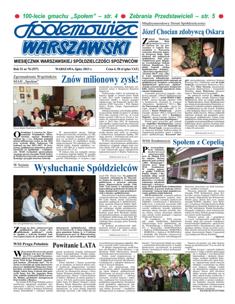l 100-lecie gmachu „Społem” – str. 4 l Zebrania Przedstawicieli – str. 5 l Międzynarodowy Dzień Spółdzielczości Józef Chocian zdobywcą Oskara Z MIESIĘCZNIK WARSZAWSKIEJ SPÓŁDZIELCZOŚCI SPOŻYWCÓW Rok 51 nr 76 (557) WARSZAWA, lipiec 2013 r. Zgromadzenie Wspólników MAH „Społem” Znów milionowy zysk! Nowa Rada Nadzorcza MAH. O bradujące 3 czerwca br. Zgromadzenie Wspólników Mazowieckiej Agencji Handlowej Społem Sp. z o.o. dokonało podziału ponad milionowego zysku za rok 2012 oraz wybrało Radę Nadzorczą VII kadencji na lata 2013–2017. W przyjaznej, spółdzielczej atmosferze przedstawiciele 22 Spółdzielni – Udziałowców MAH wysłuchali sprawozdania rocznego prezes Zarządu MAH Jadwigi Wójtowicz-Garwoła, przeprowadzili dyskusję i przyjęli stosowne uchwały. W Sejmie W sprawozdaniu prezes Jadwiga Wójtowicz-Garwoła stwierdziła, że Mazowiecka Agencja Handlowa „Społem” sp.z o.o. na dzień 31 grudnia 2012 roku była własnością 24 wspólników dyspo nujących łącznie 788 udziałami po 2 500 złotych każdy. Kapitał zakładowy wy nosił 1 970 000 zł, a kapitał rezerwowy wynosił 82 651,71 zł. W trakcie roku nie nastąpiły zmiany w strukturze kapitału Spółki. W związku z rezygnacją jednego z członków RN Zbigniewa Chacińskiego, w związku z jego przejściem na emeryturę, dokonano sto sownych zmian w Krajowym Rejestrze Sądowym. Niekorzystny wpływ na potencjał zakupowy Spółki w ramach umów MAH w roku 2012 miała współpraca kilku właścicieli Spółki z innymi grupami zakupowymi, jak Partnerski Serwis Detaliczny (PSS Garwolin i PSS Radzyń Podl.), Polska Grupa Supermarketów (PSS Płock). Jednakże pomimo tych działań global ne przychody Spółki na dzień 31 grudnia 2012 roku wyniosły 2.627 tys. zł, a zysk brutto wyniósł 1.004 tys.zł. Zwrot w stosunku do zaangażowanego kapitału wyniósł w 2012 roku 50%. W minionym roku Spółka wypracowała dla właścicieli wysoką wartość dywidendy do podziału tj. 807.350 złotych. Zatrudnienie na koniec 2012 roku wy nosiło łącznie pięć osób, co świadczy o efektywnym zarządzaniu Spółką. Obsługa prawna i informatyczna była prowadzona w systemie outsourcing. W 2012 roku na bazie 64 umów z producentami i dystrybutorami spółdzielnieudziałowcy osiągnęły zakupy netto wartości blisko 248 mln zł. Blisko 80 proc. z nich realizowało pięciu udziałowców reprezentowanych w Radzie Nadzorczej. Dokończenie na str. 3 Wysłuchanie Spółdzielców Na sali społemowcy warszawscy. Z uwagi na duże zainteresowanie spółdzielców, tak zwane „Wysłuchanie publiczne”, zwołane zgodnie z uchwałą Komisji Nadzwyczajnej Sejmu ds. projektów ustaw WSS Praga Południe W Cena 4, 50 zł (plus VAT) dotyczących spółdzielczości, odbyło się 24 czerwca br. w dużo większej sali poza gmachem Sejmu, tj. w Centrum Kongresowym przy ul. Bobrowieckiej. Otworzył je przewodniczący Komisji Powitanie lata czwartek 20 czerwca br. przed sklepem Lux przy ul. Patriotów 172 w osiedlu Warszawa– Radość odbył się festyn zorganizowany przez WSS Praga Południe „Społem” pod hasłem: „Powitanie lata”. Na festynie wystawiało się wielu dostawców: pieczywa Spółdzielni Piekarsko Ciastkarskiej, wyrobów cukierniczych firmy Bajgle, soków firmy Lubsad, dań gotowych firmy Eat Me, jogurtów firmy Zott, nabiału spółdzielni OSM Garwolin, Białuty, produktów ekologicznych firm Symbio, i Bionica. Na stoisku WSS Pragi Południe oprócz możliwości zakupienia artykułów ekologicznych i zdrowej żywności, można było kupić książki o tematyce kulinarnej znanej dziennikarki i wybitnej autorki ponad trzydziestu książek kulinarnych Hanny Szymanderskiej. Pisarka opatrywała książki dedykacjami, odpowiadała na pytania klientów i udzielała porad kulinarnych. Firmy Sokołów i Taurus wystawiały się ze stoiskami, na których klienci mieli możliwość degustowania wyrobów z grilla i pierogów. Dużym powodzeniem cieszyły się ekologiczne pierogi z firmy Taurus. Klientom umilał czas ludowy zespół muzyczny „Morsy” z Domu Kultury w Dębicy. Młodzież ze szkoły podstawowej nr. 116 była zachwycona degustacją lodów firmy Ice Mastry. Ekspert z firmy Bionica Teresa Majewska opowiedziała dzieciakom jak produkuje się produkty ekologiczne, na czym polega piramida zdrowego żywienia i jak ważne dla nas poseł PSL Marek Gos. Na podstawie wniosków wniesionych do Marszałka Sejmu do udziału w wysłuchaniu publicznym, z prawem zabrania głosu, dopuszczonych zostało 1346 osób. Tym razem, w odróżnieniu od poprzedniego posiedzenia Komisji 28 maja, dominowali w nim przedstawiciele i obrońcy spółdzielczości. Jako pierwsza w dyskusji zabrała głos wiceprzewodnicząca Komisji, posłanka PO Lidia Staroń, słynna rzeczniczka projektów godzących w spółdzielczość, która zarzuciła Krajowej Radzie Spółdzielczej, że ona jest organizatorem tak szerokiego udziału przedstawicieli spółdzielców. Wiceprzewodniczący Komisji poseł SLD Romuald Ajchler przypomniał posłance, że organizatorem wysłuchania publicznego jest Sejm RP i że odbywa się ono na wniosek posła SP Andrzeja Dery, przyjęty przez Komisję jednogłośnie. W dyskusji przedstawiciele spółdzielców mówili o poważnym zaniepokojeniu i obawach jakie wywołał Dokończenie na str. 3 wszystkich jest segregacja odpadów, dbanie o czystość lasów i powietrza itp.. W sklepie zorganizowany został konkurs dla klientów. Troje klientów, z rąk dyrektora WSS Mieczysława Szumiło otrzymało duże kosze prezentowe. Festyn został zorganizowany w celu propagowania sklepów „Społem” i dodatkowych korzyści dla klientów wynikających z zakupów dokonywanych w naszych sklepach. Poza tym eksponowane były mocne strony, jakimi charakteryzuje się oferta sklepów spółdzielczych. Wyróżniamy się przecież ofertą produktów ekologicznych i zdrowej żywności, świeżym mięsem i nabiałem, wędlin