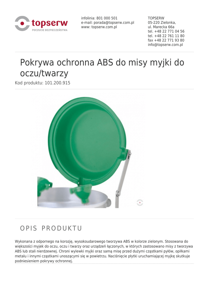 infolinia: 801 000 501 e-mail: [email protected] www: topserw.com.pl TOPSERW 05-220 Zielonka, ul. Marecka 66a tel. +48 22 771 04 56 tel. +48 22 761 11 80 fax +48 22 771 93 80 [email protected] Pokrywa ochronna ABS do misy myjki do oczu/twarzy Kod produktu: 101.200.915 OPIS PRODUKTU Wykonana z odpornego na korozję, wysokoudarowego tworzywa ABS w kolorze zielonym. Stosowana do większości myjek do oczu, oczu i twarzy oraz urządzeń łączonych, w których zastosowano misy z tworzywa ABS lub stali nierdzewnej. Chroni wylewki myjki oraz samą misę przed dużymi cząstkami pyłów, opiłkami metalu i innymi cząstkami unoszącymi się w powietrzu. Naciśnięcie płytki uruchamiającej myjkę skutkuje podniesieniem pokrywy ochronnej. DANE TECHNICZNE