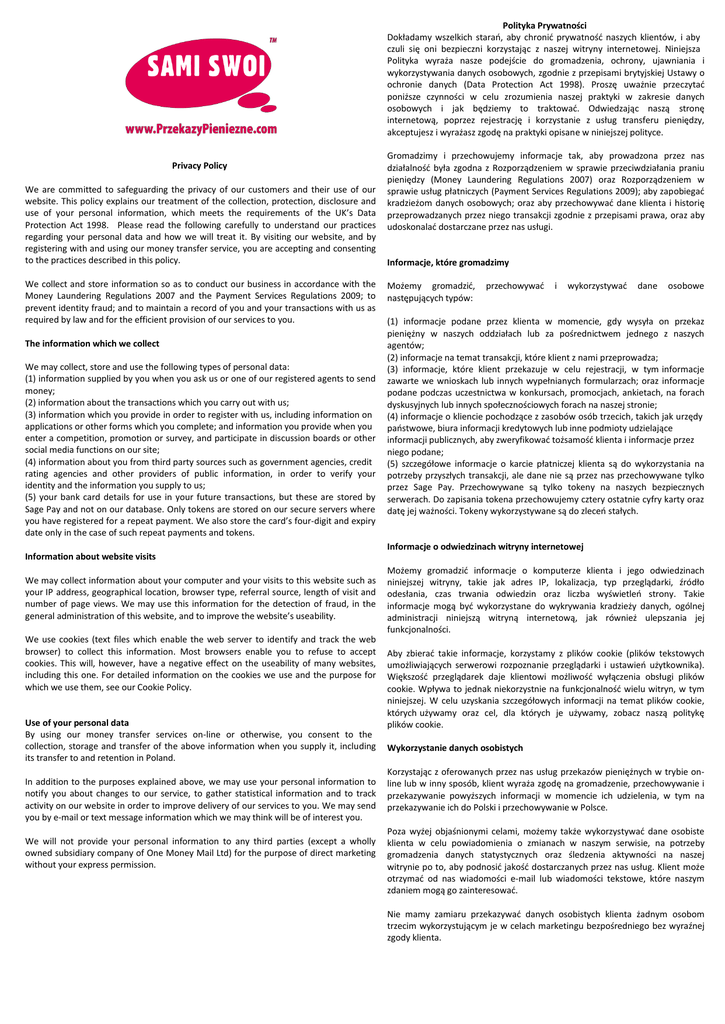 Polityka Prywatności Dokładamy wszelkich starań, aby chronić prywatność naszych klientów, i aby czuli się oni bezpieczni korzystając z naszej witryny internetowej. Niniejsza Polityka wyraża nasze podejście do gromadzenia, ochrony, ujawniania i wykorzystywania danych osobowych, zgodnie z przepisami brytyjskiej Ustawy o ochronie danych (Data Protection Act 1998). Proszę uważnie przeczytać poniższe czynności w celu zrozumienia naszej praktyki w zakresie danych osobowych i jak będziemy to traktować. Odwiedzając naszą stronę internetową, poprzez rejestrację i korzystanie z usług transferu pieniędzy, akceptujesz i wyrażasz zgodę na praktyki opisane w niniejszej polityce. Privacy Policy We are committed to safeguarding the privacy of our customers and their use of our website. This policy explains our treatment of the collection, protection, disclosure and use of your personal information, which meets the requirements of the UK’s Data Protection Act 1998. Please read the following carefully to understand our practices regarding your personal data and how we will treat it. By visiting our website, and by registering with and using our money transfer service, you are accepting and consenting to the practices described in this policy. We collect and store information so as to conduct our business in accordance with the Money Laundering Regulations 2007 and the Payment Services Regulations 2009; to prevent identity fraud; and to maintain a record of you and your transactions with us as required by law and for the efficient provision of our services to you. The information which we collect We may collect, store and use the following types of personal data: (1) information supplied by you when you ask us or one of our registered agents to send money; (2) information about the transactions which you carry out with us; (3) information which you provide in order to register with us, including information on applications or other forms which you complete; and information you provide when you enter a competition, promotion or survey, and participate in discussion boards or other social media functions on our site; (4) information about you from third party sources such as government agencies, credit rating agencies and other providers of public information, in order to verify your identity and the information you supply to us; (5) your bank card details for use in your future transactions, but these are stored by Sage Pay and not on our database. Only tokens are stored on our secure servers where you have registered for a repeat payment. We also store the card’s four-digit and expiry date only in the case of such repeat payments and tokens. Gromadzimy i przechowujemy informacje tak, aby prowadzona przez nas działalność była zgodna z Rozporządzeniem w sprawie przeciwdziałania praniu pieniędzy (Money Laundering Regulations 2007) oraz Rozporządzeniem w sprawie usług płatniczych (Payment Services Regulations 2009); aby zapobiegać kradzieżom danych osobowych; oraz aby przechowywać dane klienta i historię przeprowadzanych przez niego transakcji zgodnie z przepisami prawa, oraz aby udoskonalać dostarczane przez nas usługi. Informacje, które gromadzimy Możemy gromadzić, następujących typów: przechowywać i wykorzystywać dane osobowe (1) informacje podane przez klienta w momencie, gdy wysyła on przekaz pieniężny w naszych oddziałach lub za pośrednictwem jednego z naszych agentów; (2) informacje na temat transakcji, które klient z nami przeprowadza; (3) informacje, które klient przekazuje w celu rejestracji, w tym informacje zawarte we wnioskach lub innych wypełnianych formularzach; oraz informacje podane podczas uczestnictwa w konkursach, promocjach, ankietach, na forach dyskusyjnych lub innych społecznościowych forach na naszej stronie; (4) informacje o kliencie pochodzące z zasobów osób trzecich, takich jak urzędy państwowe, biura informacji kredytowych lub inne podmioty udzielające informacji publicznych, aby zweryfikować tożsamość klienta i informacje przez niego podane; (5) szczegółowe informacje o karcie płatniczej klienta są do wykorzystania na potrzeby przyszłych transakcji, ale dane nie są przez nas przechowywane tylko przez Sage Pay. Przechowywane są tylko tokeny na naszych bezpiecznych serwerach. Do zapisania tokena przechowujemy cztery ostatnie cyfry karty oraz datę jej ważności. Tokeny wykorzystywane są do zleceń stałych. Informacje o odwiedzinach witryny internetowej Information about website visits We may collect information about your computer and your visits to this website such as your IP address, geographical location, browser type, referral source, length of visit and number of page views. We may use this information for the detection of fraud, in the general administration of this website, and to improve the website’s useability. We use cookies (text files which enable the web server to identify and track the web browser) to collect this information. Most browsers enable you to refuse to accept cookies. This will, however, have a negative effect on the useability of many websites, including this one. For detailed information on the cookies we use and the purpose for which we use them, see our Cookie Policy. Use of your personal data By using our money transfer services on-line or otherwise, you consent to the collection, storage and transfer of the above information when you supply it, including its transfer to and retention in Poland. In addition to the purposes explained above, we may use your personal information to notify you about changes to our service, to gather statistical information and to track activity on our website in order to improve delivery of our services to you. We may send you by e-mail or text message information which we may think will be of interest you. We will not provide your personal information to any third parties (except a wholly owned subsidiary company of One Money Mail Ltd