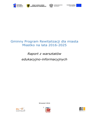 Gminny Program Rewitalizacji dla miasta Miastko na lata 2016-2025 Raport z warsztatów edukacyjno-informacyjnych Wrzesień 2016 1 1. Informacje o spotkaniach Warsztaty edukacyjno-informacyjne z przedstawicielami Urzędu Miejskiego, jednostkami organizacyjnymi, PUP, NGO, przedsiębiorcami: Termin: 30 sierpnia i 6 września 2016 roku o godz. 17.00 Miejsce: Centrum Informacji Turystycznej w Miastku, ul. Dworcowa 29 Uczestnicy: w warsztatach wzięło udział odpowiednio 8 i 9 osób zgodnie z załączonymi listami Warsztaty edukacyjno-informacyjne z mieszkańcami: Termin: 31 sierpnia i 7 września 2016 roku o godz. 17.00 Miejsce: Centrum Informacji Turystycznej w Miastku, ul. Dworcowa 29 Uczestnicy: w warsztatach wzięło udział odpowiednio 13 i 8 osób zgodnie z załączonymi listami Moderator: Michał Majek Przebieg spotkań: Podczas spotkań 30-31.08.2016 r. jego uczestnikom zostały zaprezentowane podstawowe informacje na temat rewitalizacji oraz etapy realizacji projektu. Następnie zostało przedstawione podsumowanie wyników dotychczas przeprowadzonych działań – ankiety CATI (wywiad telefoniczny wspomagany komputerowo) pogłębiającej diagnozę oraz badań gabinetowych będących podstawą jej powstania. Druga część spotkania miała charakter warsztatowy. Uczestnicy pracowali w dwóch grupach: zespół 1. podsystem społeczno-gospodarczy oraz zespół 2. podsystem przestrzenny. Zadaniem uczestników była odpowiedź na pytania pozwalające na zidentyfikowanie problemów i mocnych stron obszaru w danym podsystemie. Celem spotkań 6-7.09.2016 r. była hierarchizacja i priorytetyzacja katalogu zgłoszonych problemów i zjawisk problemowych, a następnie charakterystyka potencjału i aktywności podmiotów działających na obszarze rewitalizacji oraz skuteczność działań mających na celu niwelowanie problemów społecznych. 2. Wyniki prac warsztatowych 2.1. Zlokalizowane na obszarze obiekty/podmioty z punktu widzenia życia społecznego Nazwa Stan i dostępność Park pomiędzy ul. Wybickiego i Szewską Oświetlanie, bezpieczeństwo, więcej miejsc do odpoczynku (np. ławki) Droga dojazdowa ul. Wybickiego przy lokalu 37,38 do ul. Piłsudskiego Wymaga naprawy i uregulowania ruchu Plac przy bloku nr 1 przy ul. Piłsudskiego Od strony „cmentarza” należałoby zrobić parking, oświetlić, poprawić stan bezpieczeństwa 2 ważne Nazwa Stan i dostępność Droga Łąkowa z ul. Konopnickiej Droga alternatywna w razie zakorkowania ul. Wybickiego – wymaga naprawy, zagospodarowania Boisko przy ul. Piłsudskiego Potencjalne miejsce do rekreacji 2.2. Zlokalizowane na obszarze podmioty gospodarcze/ważne dla miasta firmy Lp. 1 Nazwa Tereny poprzemysłowe – Provitus/ Spółdzielnia LAS 2.3. Problemy społeczne, których koncentracja występuje na obszarze z ich przyczyną Problemy w sferze społecznej Przyczyny/uszczegółowienie problemów Zły stan infrastruktury oświetlenia itp. Niewystarczający poziom bezpieczeństwa komunikacyjne drogowej, chodników, Nieprzestrzeganie przepisów [jazda z nadmierną prędkością] oraz remonty dróg i mostu [zwężenia (np. koło młyna, utrudnienia komunikacyjne oraz wypadki na drodze krajowej] Znaczna część chodników jest w bardzo złym stanie [utrudnienia dla osób niepełnosprawnych, starszych np. ul. Szewska] Niewystarczająca liczba miejsc parkingowych [samochody parkujące w różnych miejscach np. pomiędzy blokami nr 52/53, co powoduje brak możliwości dojazdu do budynków] Roszczeniowe podejście - tereny gminne – „podejście typu: gmina zrobi, gmina da” Małe zaangażowanie mieszkańców Mieszkania komunalne bez właścicieli (nie dbają ponieważ nie czują, że mieszkania są ich własnością), brak poczucia własności w mieszkaniach komunalnych, na klatkach, itp. -> dewastacje, najemcy nie dbają o wspólną przestrzeń Brak dbałości o porządek na terenach wspólnych, poza terenami spółdzielni Przyzwyczajenia mieszkańców pomocy od gminy Zdegradowana zabudowa Wybickiego 4,4a 3 do otrzymywania kamieniczna -> Gen. Problemy w sferze społecznej Brak udziału społeczności w życiu kulturalnym (wydarzeniach typu „festyny”) przy wystarczającej ofercie Przyczyny/uszczegółowienie problemów Zaawansowany wiek społeczności lokalnej Zapracowane społeczeństwo Noclegownia znajdująca się na terenie rewitalizacji (osoby bezdomne śpiące na klatkach schodowych, osoby bezdomne zauważalne przy sklepach) Alkoholizm Bezdomni bardzo często nadużywają alkoholu Konieczność zapewnienia możliwości spędzania czasu wolnego (zajęcia dodatkowe) dla dzieci i młodzieży (alternatywą jest spożywania alkoholu i zaczepianie innych ludzi) Zakwaterowanie na terenie rewitalizowanym osób dotkniętych patologiami społecznymi Degradacja społeczna Wszystkie osoby z patologicznych środowisk zlokalizowane są w jednym miejscu (noclegownia, mieszkania komunalne itp.) Brak zajęć dodatkowych i miejsca dla dzieci i młodzieży (świetlicy, zajęć sportowych, rekreacyjnych, dodatkowych (wyrównawczych) lekcji) Konieczność zwiększenia udziału punktów usługowych na terenie obszaru rewitalizowanego Miejsce tzw. Manhattan – „bywalcy” zaczepiają osoby starsze w celu zbierania pieniędzy na alkohol Agresywna młodzież Brak świetlicy osiedlowej dla dzieci i młodzieży Niski poziom poczucia bezpieczeństwa, w szczególności w pobliżu tzw. „Manchatanu” Konieczność zwiększenia liczby i zasięgu patroli policji Zwiększenie zasięgu monitoringu Konieczność zaaranżowania dzieciom czasu wolnego Konieczność zwiększenia świadomości społeczności lokalnej w zakresie osób bezdomnych Konieczność rozdzielenia rodzin „patologicznych” -> zamiast tworzenia „getta” Brak żłobka Powinno rozpatrzyć się utworzenie klubu dziecięcego Brak miejsca dla seniorów [starzejące się społeczeństwo spotęgowane migracją młodych] Potrzebny „dom dziennego pobytu” oraz procesy angażujące i integruj