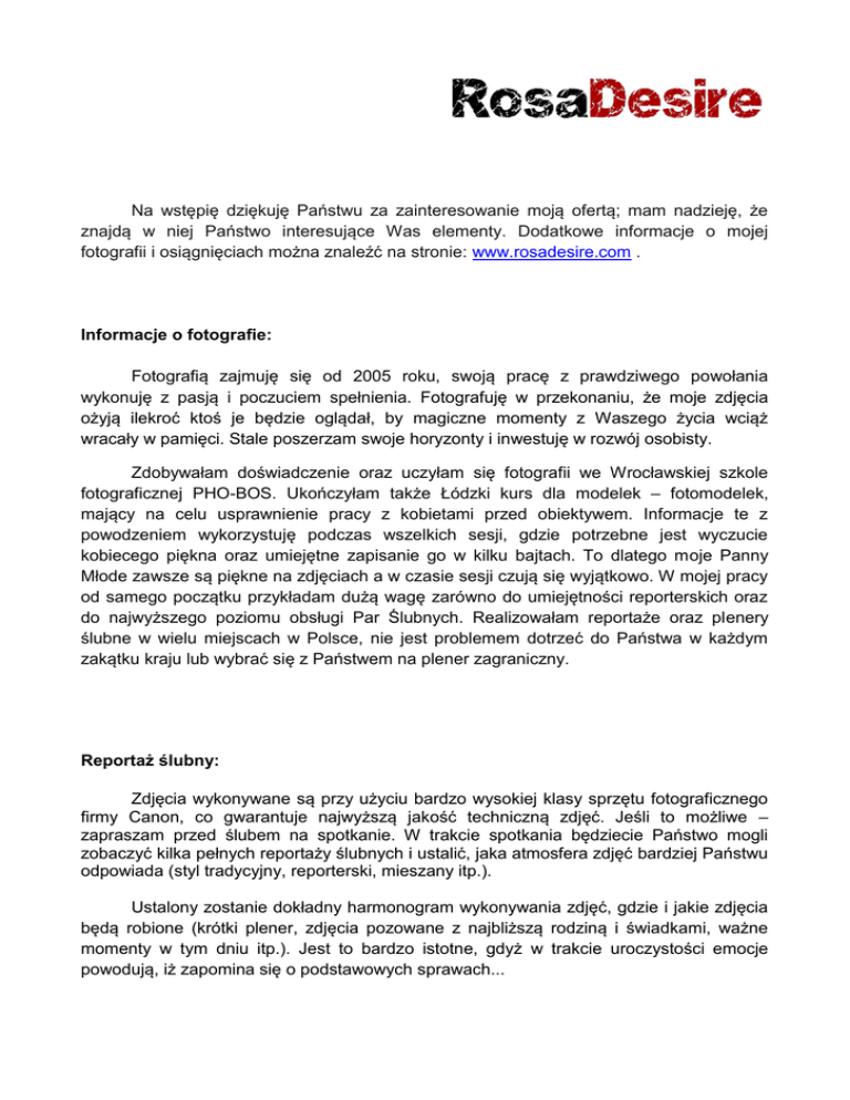 Na wstępię dziękuję Państwu za zainteresowanie moją ofertą; mam nadzieję, że znajdą w niej Państwo interesujące Was elementy. Dodatkowe informacje o mojej fotografii i osiągnięciach można znaleźć na stronie: www.rosadesire.com . Informacje o fotografie: Fotografią zajmuję się od 2005 roku, swoją pracę z prawdziwego powołania wykonuję z pasją i poczuciem spełnienia. Fotografuję w przekonaniu, że moje zdjęcia ożyją ilekroć ktoś je będzie oglądał, by magiczne momenty z Waszego życia wciąż wracały w pamięci. Stale poszerzam swoje horyzonty i inwestuję w rozwój osobisty. Zdobywałam doświadczenie oraz uczyłam się fotografii we Wrocławskiej szkole fotograficznej PHO-BOS. Ukończyłam także Łódzki kurs dla modelek – fotomodelek, mający na celu usprawnienie pracy z kobietami przed obiektywem. Informacje te z powodzeniem wykorzystuję podczas wszelkich sesji, gdzie potrzebne jest wyczucie kobiecego piękna oraz umiejętne zapisanie go w kilku bajtach. To dlatego moje Panny Młode zawsze są piękne na zdjęciach a w czasie sesji czują się wyjątkowo. W mojej pracy od samego początku przykładam dużą wagę zarówno do umiejętności reporterskich oraz do najwyższego poziomu obsługi Par Ślubnych. Realizowałam reportaże oraz plenery ślubne w wielu miejscach w Polsce, nie jest problemem dotrzeć do Państwa w każdym zakątku kraju lub wybrać się z Państwem na plener zagraniczny. Reportaż ślubny: Zdjęcia wykonywane są przy użyciu bardzo wysokiej klasy sprzętu fotograficznego firmy Canon, co gwarantuje najwyższą jakość techniczną zdjęć. Jeśli to możliwe – zapraszam przed ślubem na spotkanie. W trakcie spotkania będziecie Państwo mogli zobaczyć kilka pełnych reportaży ślubnych i ustalić, jaka atmosfera zdjęć bardziej Państwu odpowiada (styl tradycyjny, reporterski, mieszany itp.). Ustalony zostanie dokładny harmonogram wykonywania zdjęć, gdzie i jakie zdjęcia będą robione (krótki plener, zdjęcia pozowane z najbliższą rodziną i świadkami, ważne momenty w tym dniu itp.). Jest to bardzo istotne, gdyż w trakcie uroczystości emocje powodują, iż zapomina się o podstawowych sprawach... Album ślubny Moje Pary Młode w momencie podpisywania umowy dokonują wyboru koloru fotoalbumu. Wielkość albumów: 30cm x 45cm, karty są grube i sztywne, papier jedwabny. Zdjęcia są zawsze specjalnie i bardzo starannie przygotowywane, edytowane oraz retuszowane. Wytyczne co do kolorystyki zdjęć, edycji i retuszu ustalane są z Parą Młodych indywidualnie. W momencie wyboru naszego studio RosaDesire do obsługi fotograficznej tego ważnego dla Państwa wydarzenia – podpisywana jest umowa. Podczas rezerwowania oraz podpisywania umowy, wpłacana jest zaliczka w wysokości 30% wartości wybranego pakietu. Kolejne 30% opłacane jest na tydzień przed wykonaniem reportażu a ostatnie 40% do tygodnia po wykonanym reportażu. W przypadku, gdy Para nie może odebrać materiałów osobiście, studio RosaDesire wysyła materiały paczką priorytetową na koszt klienta. Pakiety zdjęć – ślub oraz plener w Polsce Standard 2500zł Komfort 3500zł w sumie 300 zdjęć w sumie 400 zdjęć obrobionych obrobionych 100 zdjęć wydrukowanych 100 zdjęć wydrukowanych 100 zdjęć wydrukowanych na papierze fotograficznym na papierze fotograficznym na papierze fotograficznym w formacie 15cm x 23cm w formacie 15cm x 23cm w formacie 15cm x 23cm 300 zdjęć 400 zdjęć ok. 1000 zdjęć na pendrivie na pendrivie na pendrivie reportaż: do 12 godzin reportaż: do 12 godzin reportaż: do 12 godzin max. do godz. 01:00 max. do godz. 01:00 max. do godz. 01:00 plener: tego samego dnia plener: 3 godziny innego dnia plener: 3 godziny innego dnia Pendrive oraz wydruki Pendrive oraz wydruki Pendrive oraz wydruki zapakowane w eleganckie zapakowane w eleganckie zapakowane w eleganckie pudełka z ekoskóry pudełka z ekoskóry pudełka z ekoskóry Premium 4500zł wszystkie zdjęcia, ok. 1000 (300 zdjęć obrobionych, reszta w formie naświetlonych jpg.) możliwość przedłużenia pracy fotografa w dniu ślubu; każda kolejna godzina to +150zł do ceny pakietu (w cenie 5 obrobionych zdjęć), nie dotyczy pakietu Premium koszt dojazdu: 1zł za kilometr termin realizacji: 10 tygodni każde dodatkowe wybrane i obrobione ujęcie ponad pakiet – 20zł, klient otrzymuje linki do zamkniętych galerii internetowych, w których ma dostęp do zdjęć z pełnego reportażu ślubnego. Możliwość dokupienia zdjęć reportażowych w formie plików cyfrowych (nie obrobionych) w cenie 5zł za zdjęcie, USŁUGI DODATKOWE Odbitki zdjęć Koszt odbitki w formacie 15cm x 23cm – 5zł Fotoalbum 20cm x 30cm, 30 stron Fotoalbum ze skóry ekologicznej, karty jedwabne usztywnione – 600zł Fotoalbum 30cm x 45cm, 30 stron Fotoalbum ze skóry ekologicznej, karty jedwabne usztywnione – 800zł Fotoalbumy dla rodziców 20cm x 30cm, 30 stron 2 fotoalbumy ze skóry ekologicznej, karty jedwabne usztywnione, ten sam projekt jak w albumie dużym dla Pary Młodej – 800zł. SAM PLENER W KRAJU LUB SAMA CEREMONIA W KOŚCIELE– cena: 1000zł 100 zdjęć wydrukowanych na papierze fotograficznym w formacie 15cm x 23cm 100 plików cyfrowych JPG nagranych w pełnej rozdzielczości na pendrive Pendrive oraz wydruki zapakowane w eleganckie pudełka z ekoskóry czas pracy fotografa: 3 godziny termin realizacji zlecenia: 4 tygodnie każde dodatkowe wybrane ujęcie ponad pakiet – 20zł klient otrzymuje linki do zamkniętych galerii internetowych, w których ma dostęp do zdjęć z pełnego reportażu ślubnego. Możliwość dokupienia zdjęć reportażowych w formie plików cyfrowych (nie obrobionych) w cenie 5zł za zdjęcie, PLENER ZA GRANICĄ – cena: 2000zł 200 zdjęć wydrukowanych na papierze fotograficznym w formacie 15cm x 23cm 200 plików cyfrowych JPG nagranych w pełnej rozdzielczości na pendrive Pendrive oraz wydruki zapakowane w eleganckie pudełka z ekoskóry cz