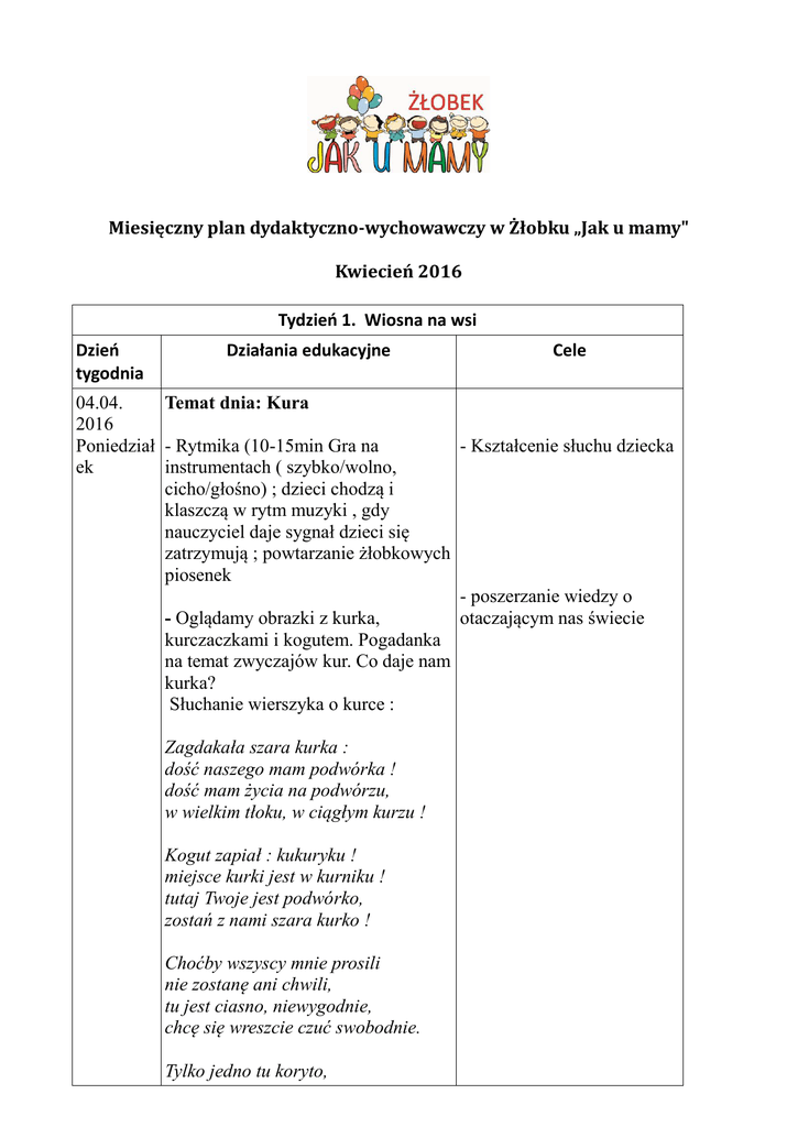 Miesięczny plan dydaktyczno-wychowawczy w Żłobku „Jak u mamy" Kwiecień 2016 Tydzień 1. Wiosna na wsi Dzień tygodnia Działania edukacyjne Cele 04.04. Temat dnia: Kura 2016 Poniedział - Rytmika (10-15min Gra na - Kształcenie słuchu dziecka ek instrumentach ( szybko/wolno, cicho/głośno) ; dzieci chodzą i klaszczą w rytm muzyki , gdy nauczyciel daje sygnał dzieci się zatrzymują ; powtarzanie żłobkowych piosenek - poszerzanie wiedzy o - Oglądamy obrazki z kurka, otaczającym nas świecie kurczaczkami i kogutem. Pogadanka na temat zwyczajów kur. Co daje nam kurka? Słuchanie wierszyka o kurce : Zagdakała szara kurka : dość naszego mam podwórka ! dość mam życia na podwórzu, w wielkim tłoku, w ciągłym kurzu ! Kogut zapiał : kukuryku ! miejsce kurki jest w kurniku ! tutaj Twoje jest podwórko, zostań z nami szara kurko ! Choćby wszyscy mnie prosili nie zostanę ani chwili, tu jest ciasno, niewygodnie, chcę się wreszcie czuć swobodnie. Tylko jedno tu koryto, w nim zaś owies albo żyto, witamina to wątpliwa, gdzie owoce i warzywa ? Ciągłe spory, kłótnie, zwady, nie ma na to innej rady jak zamieszkać na rabatkach w pulchnej trawie, w pięknych kwiatkach. Tam wygodnie będę miała, do południa sobie spała, nie chcę budzić się w kurniku na Twe ku ku kukuryku ! Tak uważasz ? - wielka szkoda, nam tu wszystkim się podoba, gospodarze o nas dbają, kurnik wietrzą i sprzątają. To przesada kurko mała będziesz jeszcze żałowała, tu wygoda i dostatek, towarzystwo na dodatek. Kurka go nie posłuchała, na rabatkach noc przespała, niezbyt dobrze jej się spało no bo grzędy brakowało. Jak myślicie - co zrobiła ? wnet koguta przeprosiła, że docenić nie umiała tego, co od dawna miała. Już wesoła na podwórzu "grzebie" w ziemi, biega w kurzu i z jednego je koryta i o drugie już nie pyta. Przypominamy liczenie do pięciu – liczymy kurze jajka Zabawy integracyjne z chustą . - Kolorowanka - kura 05.04.201 Temat dnia: Krowa 6 Wtorek - Gimnastyka (10-15 min) Zestaw zabaw ruchowych z wykorzystaniem gazet i obręczy. Zabawy skoczne, - rozwijanie sprawności bieżne i rzutne. ruchowej - Zabawy ruchowe : Pingwin, Kółko graniaste, Balonik - Oglądamy obrazki z krówka i małymi cielaczkami. Nauka - wzbogacenie słownictwa rozróżniania duży-mały ; Pogadanka na temat tego co lubi jeść krówka , gdzie śpi, gdzie możemy ją spotkać. Naśladujemy dźwięki jakie wydaje zwierzę. Skąd się bierze mleko? - Praca plastyczna- wyklejankakrowa 06.04.201 Temat dnia: Koń 6 środa J. Angielski- zajęcia prowadzone przez lektora - Jesteśmy konikami!: dzieci chodzą swobodnie po sali. N mówi, że są teraz końmi, które wypasają się na łące. W zależności od podanej przez N komendy, dzieci poruszają się w odpowiedni sposób: wesoły koń, smutny koń, młody źrebaczek, stary koń, energiczny koń, zmęczony koń. -Zabawy z chustą animacyjną - Kolorowanka- Konik - reakcja na polecenia nauczyciela, okazywanie uczuć 07.04.201 Temat dnia : Świnki 6 Czwartek Rytmika: śpiewamy piosenkę o wiośnie; Zabawa na przerwę w muzyce „martwe figurki” ; Zabawa „samochody” – czerwone światło stój!, zielone światło idź! - nauka naśladowania Zajęcia dydaktyczne : Oglądamy dźwięków wydawanych obrazki ze świnką i małymi przez zwierzęta prosiaczkami. Pogadanka na temat świnki : jakiego jest to koloru, co lubi jeść, gdzie możemy ją spotkać. Dzieci losują ilustracje zwierząt, następnie ich zadaniem jest wydanie odgłosu jaki wydaje wylosowany przez nich zwierzak Praca plastyczna : Świnka z talerzyka papierowego Temat dnia : Kaczka 08.04.201 6 piątek Gimnastyka (10-15 min ćwiczenia usprawniające J. Angielski- zajęcia prowadzone przez lektora - Co potrafi kaczuszka? – nauczycielka wydaje dzieciom polecenia: „Pokażcie, jak dotykacie skrzydełkami głowy, brzuszka, pleców, nóżek, dzióbka”, „Pokażcie, jak kaczuszka zgina nóżki”, „Pokażcie, jak kaczuszka siedzi, leży na brzuszku, leży na plecach”, „Pokażcie, jak kaczuszka chodzi”; Kaczuszki chwytają się za ręce i kołyszą się w rytm muzyki. Praca plastyczna- kaczuszka z kółek orgiami Tydzień 2: Co w trawie piszczy?? 11.04.201 Temat dnia: Gąsienica 6 -Interpretacja ruchowa do utworu rozwój dużej motoryki, rozwijanie, sprawności ruchowej - kształtowanie świadomości własnego ciała - adaptacja ruchów własnych do ruchów partnera lub grupy Poniedział Vivaldiego „Cztery pory roku „ ek słuchanie nagrania z płyty CD - Zabawa ruchowo- matematyczna „Kwiaty i trawka” do muzyki Vivaldiego – doskonalenie przeliczania, rozwijanie wrażliwości muzycznej. - Zabawa ruchowa przy muzyce „Gąsienice, motyle” – reagowanie ruchem na dźwięki wysokie i niskie. N. przyjmuje rolę marca czarodzieja. Bierze czarodziejską różdżkę i czaruje: Czary – mary, dwie słonice, zmieniam chłopców w gąsienice. Czary – mary, dwa goryle, wszystkie dziewczynki to motyle. - rozwijanie słuchu muzycznego - kształcenie koordynacji ruchowej i słuchowej - rozwój dużej motoryki -Praca plastyczna- kolorowanka gąsienica 12.04.201 Temat dnia: Biedronka 6 Wtorek Gimnastyka (10-15 sensoryczny tor przeszkód. Chodzenie na paluszkach/ piętach. Chodzenie jak kotki, węże, bieganie i machanie rączkami jak ptaszki. - rozwój motoryki dużej, ogólne usprawnianie i zwiększanie wydolności organizmu dziecka - Przypominamy liczenie do trzech – liczymy kropki na biedronkach - Zabawa w grupie – kółko graniaste, - dobra zabawa , integracja balonik grupy - Śpiewamy piosenkę „ Tylko biedronka nie ma ogonka” - Biedronka – praca plastyczna - rozwijanie umiejętności plastycznych , rozwój wyobraźni 13.04.201 Temat dnia: Konik polny 6 środa J. Angielski- zajęcia prowadzone przez lektora Ćwiczenia oddechowe- dmuchamy kolorowe piórka - ćwiczenie prawidłowego oddechu Konik polny – dzieci przykucają i udają grę na skrzypcach, śp