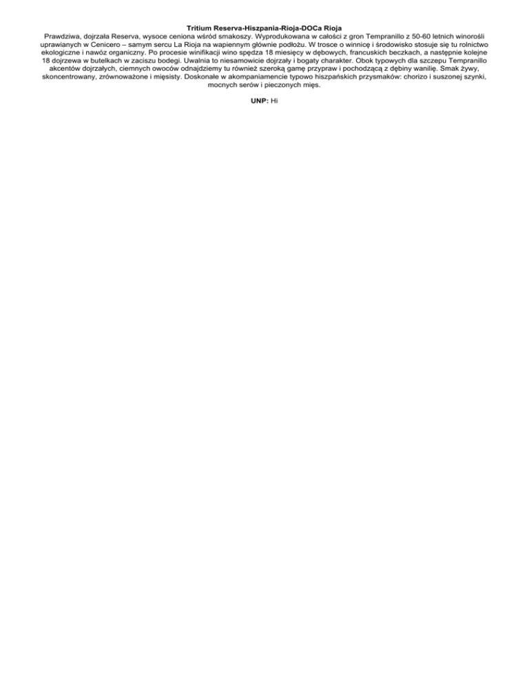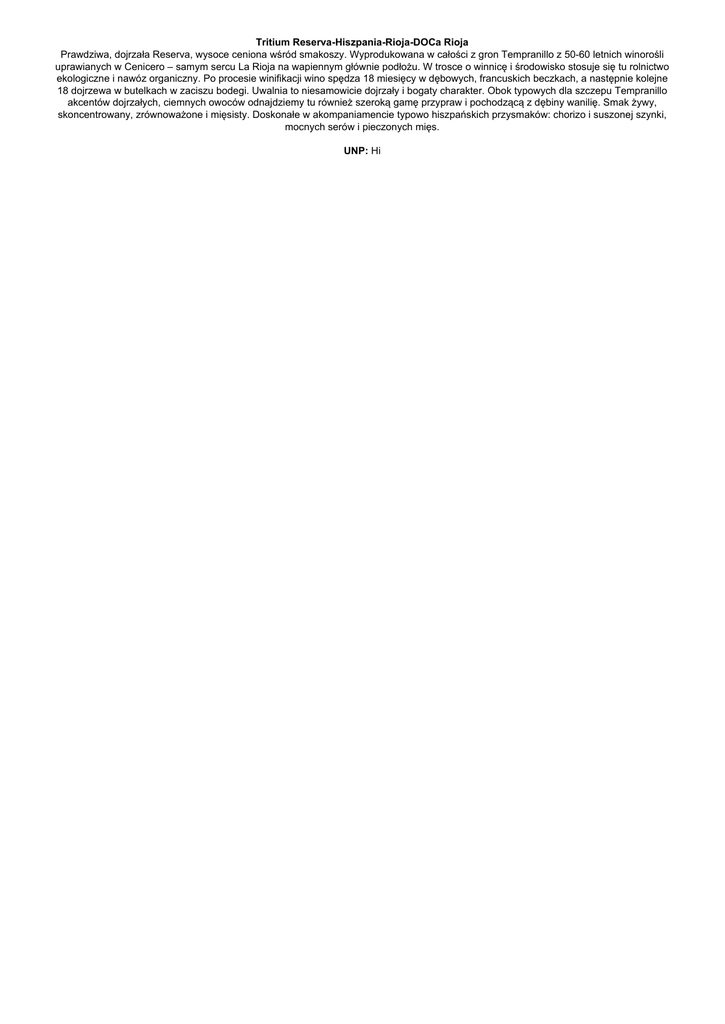 Tritium Reserva-Hiszpania-Rioja-DOCa Rioja Prawdziwa, dojrzała Reserva, wysoce ceniona wśród smakoszy. Wyprodukowana w całości z gron Tempranillo z 50-60 letnich winorośli uprawianych w Cenicero – samym sercu La Rioja na wapiennym głównie podłożu. W trosce o winnicę i środowisko stosuje się tu rolnictwo ekologiczne i nawóz organiczny. Po procesie winifikacji wino spędza 18 miesięcy w dębowych, francuskich beczkach, a następnie kolejne 18 dojrzewa w butelkach w zaciszu bodegi. Uwalnia to niesamowicie dojrzały i bogaty charakter. Obok typowych dla szczepu Tempranillo akcentów dojrzałych, ciemnych owoców odnajdziemy tu również szeroką gamę przypraw i pochodzącą z dębiny wanilię. Smak żywy, skoncentrowany, zrównoważone i mięsisty. Doskonałe w akompaniamencie typowo hiszpańskich przysmaków: chorizo i suszonej szynki, mocnych serów i pieczonych mięs. UNP: Hi