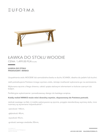 ŁAWKA DO STOŁU WOODIE CENA: 1,499.00 PLN brutto ŁAWKA DO STOŁU PRODUCENT: MINKO Uzupełnienie stołu WOODIE lub samodzielna ławka w duchu SCANDI, idealna do jadalni lub kuchni. Jeśli potrzebujecie Państwo innego wymiaru stołu, istnieje możliwość wykonania go na zamówienie. Wykonana ręcznie z litego drewna, całość spięta stalowymi elementami w kolorze czarnym lub białym. Perfekcyjne wykończenie i ponadczasowy design do każdego wnętrza. Każdy mebel MINKO może mieć dowolny wymiar, dopasowany do Państwa potrzeb. Jednak zważając na fakt, iż meble wykonywane są ręcznie, przyjęto standardowy wymiary stołu, inne rozmiary są wyceniane indywidualnie*: -szerokość 140cm, -głębokość 40cm, -wysokość 45cm, -grubość samego siedziska 30mm, *każde dodane/zmienione/zmniejszone 10cm w stosunku do wymiarów wyjściowych, jak i za zmianę w obrębie stelaża drewnianego (rozstaw, wysokości, grubość stelaża) zwiększa cenę o 100 zł. **UWAGA! do wymiarów nietypowych mebli może być doliczona opłata za wysyłkę wielkogabarytową, na euro-palecie/pół-palecie- 180/90zł, proszę o kontakt przed złożeniem zamówienia; ***we wszystkich meblach możliwe jest wykonanie stelaża w opcji BLACK/WHITE (bukowy stelaż lakierowany na czarno lub biało), dopłata wynosi 100zł za komplet; ****we wszystkich meblach możliwe jest wykonanie stelaża w opcji DĘBOWEJ (podstawowa wersja jest BUKOWA, inne rodzaje drewna wyceniane są indywidualnie), dopłata wynosi 100zł za komplet; Kolor i wykończenie: -blat jest wykonany z płyty laminowanej o gr. 18mm, w przypadku koloru WHITE wykończenie jest półmatowe i gładkie, pozostałe kolory z palety mają wykończenie półmatowe, ze strukturą bardzo drobnego „groszku”, -odcień blatu jest do wyboru z palety 12 kolorów BASIC, -w przypadku mebli LUXURY jest to dowolny odcień z palety NCS (po zakupie prosimy o podanie konkretnej barwy z palety NCS lub RAL) -stelaż jest wykonany z litego drewna bukowego, olejowanego (jest możliwość zastosowania innego drewna, np. dębu, dopłata to zazwyczaj 100zł, prosimy o zapytanie przed zakupem) -krótkie druty spinające mebel pod blatem, pozwalają na siadanie przy stole z obu stron. Wysyłka i montaż: -koszty dostawy mebla standardowego są w cenie, -ławka standardowa jest wysyłana na pół-palecie o wymiarach 80x60xH160cm, waga paczki to ok 20kg, -zazwyczaj stoły i ławki są wysyłane w całości. Wymiary: -szerokość 140cm, -głębokość 40cm, -wysokość 45cm, -grubość samego siedziska 30mm, Kolor: WHITE, LIGHT GREY, GREY, PURPLE GREY, OCEANIC, DUSTY PINK, ICE BLUE, MINT, MUSTARD, DARK NAVY, BLACK, RAW OAK Stelaż: BUK (standard), DĄB, BLACK, WHITE Czas oczekiwania: ok. 8 tygodni Powered by TCPDF (www.tcpdf.org)