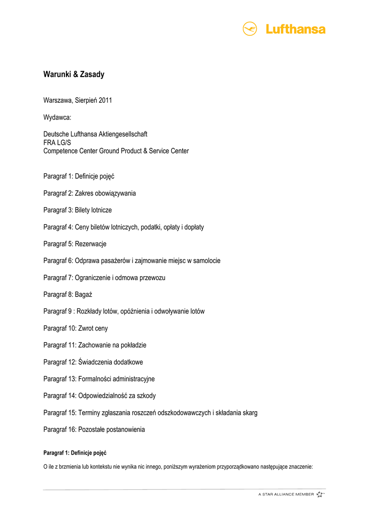 Warunki & Zasady Warszawa, Sierpień 2011 Wydawca: Deutsche Lufthansa Aktiengesellschaft FRA LG/S Competence Center Ground Product & Service Center Paragraf 1: Definicje pojęć Paragraf 2: Zakres obowiązywania Paragraf 3: Bilety lotnicze Paragraf 4: Ceny biletów lotniczych, podatki, opłaty i dopłaty Paragraf 5: Rezerwacje Paragraf 6: Odprawa pasażerów i zajmowanie miejsc w samolocie Paragraf 7: Ograniczenie i odmowa przewozu Paragraf 8: Bagaż Paragraf 9 : Rozkłady lotów, opóźnienia i odwoływanie lotów Paragraf 10: Zwrot ceny Paragraf 11: Zachowanie na pokładzie Paragraf 12: Świadczenia dodatkowe Paragraf 13: Formalności administracyjne Paragraf 14: Odpowiedzialność za szkody Paragraf 15: Terminy zgłaszania roszczeń odszkodowawczych i składania skarg Paragraf 16: Pozostałe postanowienia Paragraf 1: Definicje pojęć O ile z brzmienia lub kontekstu nie wynika nic innego, poniższym wyrażeniom przyporządkowano następujące znaczenie: My oznacza Deutsche Lufthansa Aktiengesellschaft (Niemiecka Lufthansa Spółka Akcyjna). Państwo oznacza wszystkie osoby, które są przewożone na podstawie biletu lotniczego (patrz także definicja “pasażera”). Bilet dodatkowy jest to bilet wystawiony w związku z innym biletem, z którym łącznie stanowią jedną umowę przewozu, pod warunkiem, że oba zostały zakupione w ramach jednej rezerwacji za jedną łączną kwotę. Upoważniony agent jest to upoważniony przez nas agent sprzedający usługę transportową, który pośredniczy w naszym imieniu przy zawieraniu umów przewozu lotniczego. Code share jest to przewóz lotniczy wykonywanym przez innego przewoźnika niż ten, który jest wymieniony na bilecie lotniczym. Bilet elektroniczny jest to zapisany elektronicznie przez nas lub na nasze zlecenie w naszym systemie rezerwacji bilet lotniczy, którego dowodem jest wydany pasażerowi "Itinerary Receipt". Kupon lotniczy jest to część biletu lotniczego, która posiada adnotację “good for passage” (“upoważnia do przewozu”), a w przypadku biletu elektronicznego jest to kupon elektroniczny, podający poszczególne miejsca i upoważniający do transportu pomiędzy tymi miejscami. Pasażer jest to każda osoba, która za naszą zgodą jest lub ma być przewożona samolotem na podstawie biletu lotniczego. Kupon pasażerski lub Passenger Receipt jest to część biletu lotniczego wystawionego przez nas lub na nasze zlecenie, która posiada odpowiednie adnotacje i pozostaje w posiadaniu pasażera. Cena przelotu jest to opłata, którą należy uiścić za przewóz pasażera na określonej trasie; o ile jest to wymagane przez właściwe przepisy, powinna być zatwierdzona przez odpowiednie władze lotnicze lub podana im do wiadomości. Bilet lotniczy jest to dokument wystawiony przez nas lub na nasze zlecenie dla przewoźnika, oznaczony jako “bilet lotniczy i bagażowy” lub jako “elektroniczny bilet lotniczy”; zawarte w nim warunki umowy oraz wskazówki, a także kupon lotniczy i pasażerski są elementami składowymi biletu lotniczego. Przerwa w podróży jest to przerwa na życzenie pasażera następująca w miejscu znajdującym się pomiędzy miejscem wylotu a miejscem przeznaczenia, na którą uprzednio wyraziliśmy zgodę. Bagaż są to wszystkie przedmioty, które są do Państwa użytku. O ile nie jest to inaczej określone, pojęcie to obejmuje zarówno bagaż pasażera nadany jak i nie nadany. Bagaż nadany jest tym bagażem, który bierzemy pod swoją opiekę i na który został wydany kwit bagażowy. Bagaż nie nadany oznacza Państwa bagaż, z wyjątkiem bagażu nadanego. Znak identyfikacyjny bagażu jest to kwit wydany przez nas wyłącznie w celu identyfikacji bagażu nadanego, którego zawieszka jest przez nas przymocowana do bagażu nadanego, a część identyfikująca bagaż zostaje Państwu wręczona. Kwit bagażowy, Kupon bagażowy jest to część biletu lotniczego, która odnosi się do przewozu nadanego przez Państwa bagażu. Siła wyższa są to wyjątkowe i nieprzewidywalne okoliczności, na które nie mamy wpływu i które są nieuniknione także przy zachowaniu należytej staranności. Itinerary Receipt jest to dokument podróży, który przekazujemy Państwu, jeśli podróżujecie Państwo przy użyciu elektronicznych biletów lotniczych zawierający Państwa nazwisko oraz informacje o locie i wskazówki. Dokument ten pozostaje w Państwa posiadaniu i należy go mieć przy sobie podczas całej podróży. Przewoźnik lotniczy jest to każdy przewoźnik lotniczy uprawniony do wykonywania przewozów lotniczych, który przewozi pasażera lub jego bagaż na podstawie biletu lotniczego, a którego oznaczenie linii lotniczej (Airline Designator Code) znajduje się na bilecie lotniczym lub na bilecie dodatkowym. Godzina zamknięcia odprawy jest to godzina wyznaczona przez nas lub przez innego odpowiedniego przewoźnika, do której należy zakończyć formalności związane z odprawą łącznie z uzyskaniem karty pokładowej. Normalna cena lotu jest to najwyższa stosowana opłata za transport w danej klasie przewozowej. Cena promocyjna jest to opłata za przewóz poniżej normalnej ceny lotu. Szkoda obejmuje śmierć, obrażenia ciała, szkody związane z opóźnieniem, zgubę lub wszelkie inne szkody, które powstają w wyniku lub w związku z przewozem lub innymi usługami przewoźnika. Specjalne prawo ciągnienia (SDR) jest to specjalne prawa ciągnienia zgodnie z definicją Międzynarodowego Funduszu Walutowego. Dni są to wszystkie pełne dni kalendarzowe, łącznie z niedzielami i dniami ustawowo wolnymi od pracy; w przypadku zawiadomień nie wlicza się dnia wysłania zawiadomienia; w przypadku ustalania okresu ważności – nie wlicza się dnia wystawienia biletu oraz dnia rozpoczęcia lotu. Taryfy są to ceny biletów lotniczych i dopłat wraz z postanowieniami o zakresie obowiązywania taryfy (ceny biletu lotniczego); w przypadkach wymaganych przepisami prawa zatwierdzone przez ur