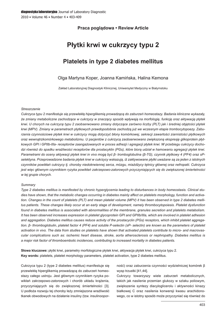 diagnostyka laboratoryjna Journal of Laboratory Diagnostic 2010 • Volume 46 • Number 4 • 403-409 Praca poglądowa • Review Article Płytki krwi w cukrzycy typu 2 Platelets in type 2 diabetes mellitus Olga Martyna Koper, Joanna Kamińska, Halina Kemona Zakład Laboratoryjnej Diagnostyki Klinicznej, Uniwersytet Medyczny w Białymstoku Streszczenie Cukrzyca typu 2 manifestuje się przewlekłą hiperglikemią prowadzącą do zaburzeń homeostazy. Badania kliniczne wykazały, że zmiany metaboliczne zachodzące w cukrzycy w znaczący sposób wpływają na morfologię, funkcję oraz aktywację płytek krwi. U chorych na cukrzycę typu 2 zaobserwowano zmiany dotyczące zarówno liczby (PLT) jak i średniej objętości płytek krwi (MPV). Zmiany w parametrach płytkowych prawdopodobnie zachodzą już we wczesnym etapie trombocytopoezy. Zaburzenia czynnościowe płytek krwi w cukrzycy mogą dotyczyć błony komórkowej, sekrecji zawartości ziarnistości płytkowych oraz wewnątrzkomórkowego metabolizmu. U pacjentów z cukrzycą zaobserwowano zwiększoną ekspresję glikoprotein płytkowych GPI i GPIIb-IIIa- receptorów zaangażowanych w proces adhezji i agregacji płytek krwi. W przebiegu cukrzycy dochodzi również do spadku wrażliwości receptorów dla prostacyklin (PGs), które biorą udział w hamowaniu agregacji płytek krwi. Parametrami do oceny aktywacji płytek krwi in vivo mogą być β- tromboglobulina (β-TG), czynnik płytkowy 4 (PF4) oraz sPselektyna. Przeprowadzone badania płytek krwi w cukrzycy wskazują, iż zaktywowane płytki uważane są za jeden z istotnych czynników powikłań cukrzycy tj. choroby niedokrwiennej serca, mózgu, miażdżycy tętnicy głównej oraz nefropatii. Cukrzyca jest więc głównym czynnikiem ryzyka powikłań zakrzepowo-zatorowych przyczyniających się do zwiększonej śmiertelności w tej grupie chorych. Summary Type 2 diabetes mellitus is manifested by chronic hyperglycemia leading to disturbances in body homeostasis. Clinical studies have shown, that the metabolic changes occurring in diabetes mainly affect on platelets morphology, function and activation. Changes in the count of platelets (PLT) and mean platelet volume (MPV) it has been observed in type 2 diabetes mellitus patients. These changes likely occur at an early stage of development, namely thrombocytopoiesis. Platelet dysfunction found in diabetes mellitus is associated with abnormalities of the membrane, granules secretion and platelets metabolism. It has been observed increases expression in platelet glycoprotein GPI and GPIIb/IIIa, which are involved in platelet adhesion and aggregation. Diabetes mellitus causes reduce activity of the prostacyclin (PGs) receptors, which inhibit platelet aggregation. β- thromboglobulin, platelet factor 4 (PF4) and soluble P-selectin (sP- selectin) are known as the parameters of platelet activation in vivo. The data from studies on platelets have shown that activated platelets contribute to micro- and macrovascular complications such as: ischemic heart disease, stroke, aorta atherosclerosis or nephropathy. Diabetes mellitus is a major risk factor of thromboembolic incidences, contributing to increased mortality in diabetes patients. Słowa kluczowe: płytki krwi, parametry morfologiczne płytek krwi, aktywacja płytek krwi, cukrzyca typu 2. Key words: platelets, platelet morphology parameters, platelet activation, type 2 diabetes mellitus. Cukrzyca typu 2 (type 2 diabetes mellitus) manifestuje się ność) oraz zaburzenia czynności wydzielniczej komórek β przewlekłą hiperglikemią prowadzącą do zaburzeń homeo- wysp trzustki [41,44]. stazy całego ustroju. Jest głównym czynnikiem ryzyka po- Cukrzycy towarzyszy wiele zaburzeń metabolicznych, wikłań zakrzepowo-zatorowych i chorób układu krążenia, takich jak nasilenie przemian glukozy w szlaku poliowym, przyczyniających się do zwiększonej śmiertelności [3]. zwiększenie syntezy diacyloglicerolu i aktywności kinazy U podłoża rozwoju tej choroby leży zmniejszona wrażliwość białkowej C oraz nasilenia konwersji kwasu arachidono- tkanek obwodowych na działanie insuliny (tzw. insulinoopor- wego, co w istotny sposób może przyczyniać się również do 403 Płytki krwi w cukrzycy typu 2 zmian w strukturze i funkcji płytek krwi [43,44]. Przewlekła rzeń krzepnięcia, indukcji procesu zapalnego w naczyniu hiperglikemia prowadzi do nieenzymatycznego sprzęgania oraz rozwoju zmian miażdżycowych. glukozy z białkami, kwasami nukleinowymi i lipidami, powo- Nieprawidłowe wyrównanie cukrzycy, wzrost końcowych dując powstawanie tzw. końcowych produktów zaawanso- produktów zaawansowanej glikacji białek oraz oksydacja wanej glikacji (AGEs- advanced glycation endoproducts). małych, gęstych lipoprotein LDL wychwytywanych przez Z dostępnego piśmiennictwa wynika, iż wzrost końcowych komórki piankowate przyśpiesza powstawanie blaszki produktów glikacji oraz aktywacja syntezy wolnych rodników miażdżycowej [17]. Dodatkowo stres oksydacyjny, wywołany (ROS- reactive oxygen species) mogą być jedną z istotnych przez AGEs, zwiększa także prezentację cząstek adhezyj- przyczyn wzmożonej aktywacji płytek krwi u chorych na cuk- nych na komórkach śródbłonka, leukocytach i płytkach krwi, rzycę [6,24,30]. które pełnią istotną rolę w rozwoju procesu miażdżycowego. Jak wykazano w wielu publikacjach, w przebiegu cukrzycy Prowadzone w tym zakresie badania wskazują, iż zaktywo- dochodzi do znacznych nieprawidłowości w układzie krwio- wane płytki krwi są uważane za jeden z istotnych czynników twórczym. Zmianie ulegają parametry dotyczące zarówno przyczyniających się do powstawania powikłań cukrzycy tj. erytrocytów, leukocytów jak i płytek krwi [13,32,31,41]. Bada- choroby niedokrwiennej serca, mózgu, kończyn dolnych, nia kliniczne prowadzone w tym zakresie wskazują, iż zabu- miażdżycy tętnicy głównej oraz nefropatii [2,38]. rzenia
