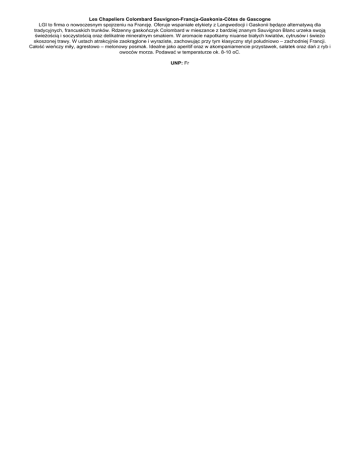 Les Chapeliers Colombard Sauvignon-Francja-Gaskonia-Côtes de Gascogne LGI to firma o nowoczesnym spojrzeniu na Francję. Oferuje wspaniałe etykiety z Langwedocji i Gaskonii będące alternatywą dla tradycyjnych, francuskich trunków. Rdzenny gaskończyk Colombard w mieszance z bardziej znanym Sauvignon Blanc urzeka swoją świeżością i soczystością oraz delikatnie mineralnym smakiem. W aromacie napotkamy niuanse białych kwiatów, cytrusów i świeżo skoszonej trawy. W ustach atrakcyjnie zaokrąglone i wyraziste, zachowując przy tym klasyczny styl południowo – zachodniej Francji. Całość wieńczy miły, agrestowo – melonowy posmak. Idealne jako aperitif oraz w akompaniamencie przystawek, sałatek oraz dań z ryb i owoców morza. Podawać w temperaturze ok. 8-10 oC. UNP: Fr