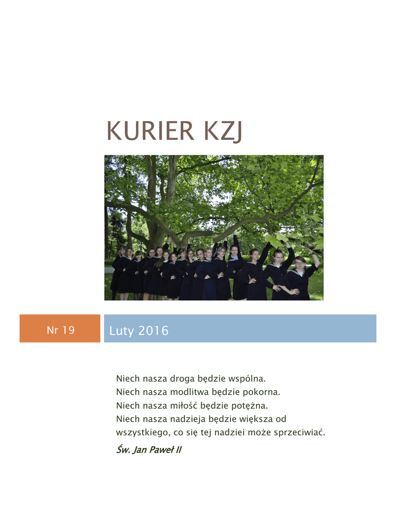 KURIER KZJ Nr 19 Luty 2016 Niech nasza droga będzie wspólna. Niech nasza modlitwa będzie pokorna. Niech nasza miłość będzie potężna. Niech nasza nadzieja będzie większa od wszystkiego, co się tej nadziei może sprzeciwiać. Św. Jan Paweł II Nr 19 Kurier Koleżeńskiego Zjednoczenia Jazłowieckiego 1 ŻYCZENIA WIELKANOCNE Drogie wychowanki i wychowankowie Sióstr Niepokalanek, członkowie KZJ i jego sympatycy, wszyscy bliscy duchowo ! Tak się w tym roku złożyło, że piszę ten list niemal na początku Wielkiego Postu - czasu zatrzymania się w codziennym biegu, czasu refleksji, przemyśleń, zastanowienia nad swoim życiem. I nie jest przypadkiem, że już w 2-gą niedzielę tego okresu Ewangelia przywołuje obraz Przemienienia Pańskiego - to przecież wskazówka dla nas, to my mamy się zmienić, odrzucić wszelkie pokusy Złego i pozwolić się opromienić blaskiem Zmartwychwstałego Chrystusa. Przypomina mi się opowiadanie mojego ojca z czasów jego młodości spędzonej na podwileńskiej wsi. Moment wydawałoby się - zwyczajny, który jednak pozostał w nim na całe życie. Otóż pewnego roku jak zazwyczaj - wyjechali w wielkanocny poranek na rezurekcję. Ponieważ do kościoła było dość daleko, wyjazd musiał nastąpić wcześnie - sporo przed wschodem słońca. Gdy byli w drodze, w pewnym momencie usłyszeli dzwony kościelne wzywające wiernych - i w tej samej chwili zza pagórka wystrzeliły promienie wschodzącego słońca oświetlając jasnym światłem całą okolicę. Wrażenie było tak silne, że zatrzymali konie i dłuższą chwilę stali patrząc i słuchając. Życzę nam wszystkim, żebyśmy doznali takiego duchowego opromienienia, które pozostanie w nas i pozwoli przemieniać nasze życie, abyśmy się stawali coraz lepsi. Ten rok jest rokiem wyjątkowym: to przecież Rok Miłosierdzia, rok 1050 rocznicy Chrztu Polski, rok Światowych Dni Młodzieży w Krakowie. Każda z tych okazji jest szczególna i godna głębszego zastanowienia. W Roku Miłosierdzia życzę, żebyśmy się umieli otworzyć na innych, bo przecież "....gdybym mówił językami ludzi i aniołów, a miłości bym nie miał, stałbym się jak miedź brzęcząca albo cymbał brzmiący..."; W rocznicę Chrztu - żebyśmy umieli stale pogłębiać naszą wiarę i więź z Bogiem; Na ŚDM - żebyśmy potrafili słowem i przykładem pociągnąć młodych ludzi do Chrystusa. To wszystko z pewnością nie jest łatwe, ale "...wszystko mogę w Tym, który mnie umacnia...". Takiego umocnienia w promieniach Bożego światła nam wszystkim z całego serca życzę. W imieniu zarządu KZJ, Marta Mieszkowska (photo by Jarosław Pocztarski) Przypomnienia Kochani, prosimy o składki. Przypominamy, że składki powinny być wpłacane do końca pierwszego kwartału roku kalendarzowego za rok bieżący. Musimy wiedzieć, czym dysponujemy przy planowaniu wydatków. Czekamy na odzew ! Zarząd KZJ Nr 19 Kurier Koleżeńskiego Zjednoczenia Jazłowieckiego 2 NIEZBĘDNIK SENIORA W KZJ ogólnopolskim dostępny jest bezpłatny "Niezbędnik seniora", czyli wszystko co senior powinien wiedzieć! Warto przeczytać! Zbiorowe zamówienia od kół przyjmuje Marta Mieszkowska Prezeska KZJ ([email protected]). Zamówienia indywidualne proszę kierować na maila Izy Gomzy ([email protected]). W mailu proszę podać imię, nazwisko i adres do doręczeń. Po wysłaniu przesyłki zostanie podany koszt wysyłki do zwrotu na rachunek ogólnopolskiego KZJ. Aby przybliżyć treść podaję niektóre podrozdziały: 1.Dziedziczenie - to warto wiedzieć 2.Jak mieszkać bez kłopotów 3.Podstawy edukacji finansowej 4.Warto być aktywnym 5.Korzystaj ze swoich uprawnień 6.Sam nie znaczy samotny - opieka dla osób starszych i niesamodzielnych 7.Wokół rodziny TERMINY ZJAZDÓW WYCHOWANEK- SZYMANÓW Pytacie nas kiedy odbywają się zjazdy w Szymanowie. Otóż już wiemy. Siostra Macieja pięknie spisała wszystkie daty: 3.04 - niedziela - 5-lecie (matura 2011) 17.04 - niedziela - 40-lecie (matura 1976) - klasa s. Miriam 23 i 24.04 - sobota, niedziela - 35-lecie (matura 1981) - klasa Krysi Jarmoszuk i Joli Kubik 7 i 8.05 - sobota i niedziela - 25-lecie (matura 1991) 21 i 22.05 - sobota, niedziela - 55-lecie (matura 1961) 4 i 5.06 - sobota i niedziela - 60-lecie (matura 1956) - klasa Basi Ciszewskiej 11 i 12.06 - sobota i niedziela - 65-lecie (matura 1951) - klasa s. Marty 18 i 19.06 – sobota i niedziela - 50-lecie (matura 1966) 25 i 26.06 - sobota i niedziela - 10-lecie (matura 2006) – klasa Ani Jaszczuk 10-11.09 - sobota i niedziela - 30-lecie (matura 1986) - klasy Agaty Kubak i Beaty Rudnickiej SZYMANOWSKI INTERNAT DZISIAJ I 30ŚCI LAT TEMU Życie w internacie to przygoda jedyna w swoim rodzaju. Obecnie Mistrzynią Internatu jest Siostra Matylda– pasjonatka języka i literatury angielskiej a także znawczyni życia Matki Marceliny, o której przez cały poprzedni rok szkolny prowadziła coniedzielne warsztaty dla rodziców uczennic. Za moich czasów (lata 80siąte) Mistrzynią była Siostra Anna- chemiczka. Nr 19 Kurier Koleżeńskiego Zjednoczenia Jazłowieckiego 3 Sprawne jego funkcjonowanie wymaga dyscypliny każdego dnia. Jak się okazuje, lata lecą a rozkład dnia od 30 lat się nie zmienił. Czy pamiętacie codzienną marszrutę, która obowiązuje do dziś: 6.45 wstawanie, sprzątanie sypialni 7.25 pacierz w kaplicy Śniadanie Lekcje do 14.25 Obiad Liceum ma dodatkowe lekcje , gimnazjum ma kółka – czasem do 16.30 Rekreacja 16.30-17.15 studium I 17.15-19.00 studium II o 19.00 Kolacja Toaleta, czas na korzystanie z internetu, porządki klas 20.30- studium III do 21.30 dla młodszych, do 23.00 dla starszych klas Zdyscyplinowana była nawet nasza garderoba. Każda jej część miała naszyty numerek. Mój był 41! A ile było zabawy z wyszywaniem na rajstopach! I to nie zmieniło się i dziś! Garderoby też nie można było mieć za wiele- tyle ile można było zmieścić w jednej dość wąskiej szafce na ko