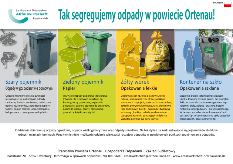 polnisch Tak segregujemy odpady w powiecie Ortenau! Szary pojemnik Zielony pojemnik Żółty worek Kontener na szkło Odpady w gospodarstwie domowym Papier Opakowania lekkie Opakowania szklane Odpadki kuchenne i resztki żywności nie nadające się na kompost, odpady sanitarne, śmieci z zamiatania, potłuczona porcelana, ceramika, zabrudzone papiery, tapety, popiół, żarówki (oprócz lamp LED, halogenowych i energooszczędnych) itp. Wszystkie odpady papierowe i tekturowe (również i te z zielonym punktem) np. kartony, torby papierowe, papiery do pakowania, papiery ozdobne do prezentów, papier do pisania, gazety, czasopisma, prospekty, książki, zeszyty itd. Opakowania jak np. folie plastikowe , torby foliowe, opakowania typu blister, puszki po konserwach i napojach, puste puszki z aerozolem, zakrętki, pokrywki aluminiowe, tacki aluminiowe, folie aluminiowe, butelki i pojemniki z tworzywa sztucznego, kubki po nabiale, opakowania ze styropianu, kartoniki po napojach i mleku itp. Wszystko powinno być puste i czyste. Wszystkie butelki i słoiki jednorazowego użytku. Powinny być one puste i bez nakrętek. Szkło wrzucać do kontenerów zgodnie z jego kolorem: białe, zielone i brązowe. Butelki niebieskie i innego koloru - do szkła zielonego. W żadnym wypadku nie wolno wrzucać ani odstawiać przy kontenerach na szkło odpadów ceramicznych, porcelanowych itp. Oddzielnie zbierane są odpady ogrodowe, odpady wielkogabarytowe oraz odpady szkodliwe. Na tekstylia i na korki ustawione są pojemniki do zbiórki w różnych miastach i gminach. Poza tym istnieje możliwość oddania większości rodzajów odpadów w powiatowych punktach przyjmowania odpadów. Starostwo Powiatu Ortenau · Gospodarka Odpadami · Zakład Budżetowy Badstraße 20 · 77652 Offenburg · Informacja w sprawach odpadów 0781 805-9600 · [email protected] · www.abfallwirtschaft-ortenaukreis.de