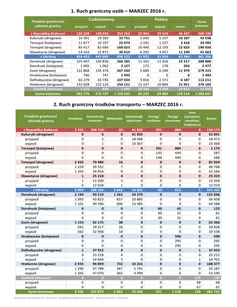 1. Ruch graniczny osób – MARZEC 2016 r. Cudzoziemcy Przejście graniczne/ odcinek granicy przyjazd z Republiką Białorusi Kukuryki (drogowe) Terespol (kolejowe) Terespol (drogowe) Sławatycze (drogowe) z Ukrainą Dorohusk (drogowe) Dorohusk (kolejowe) Zosin (drogowe) Hrubieszów (kolejowe) Dołhobyczów (drogowe) Hrebenne (drogowe) Świdnik (lotnicze) Suma końcowa 126 228 14 391 11 877 85 417 14 543 454 433 125 447 1 065 131 868 746 63 279 132 028 1 115 581 776 wyjazd 128 034 19 360 10 197 82 606 15 871 443 889 140 836 1 062 135 376 747 43 745 122 123 834 572 757 Polacy razem 254 262 33 751 22 074 168 023 30 414 898 322 266 283 2 127 267 244 1 493 107 024 254 151 1 949 1 154 533 przyjazd 22 963 5 040 1 191 10 440 6 292 31 925 11 101 172 5 689 0 3 816 11 147 10 344 65 232 wyjazd 23 524 5 147 1 227 12 193 4 957 31 059 11 416 178 6 290 0 2 371 10 804 9 299 63 882 razem Suma końcowa 46 487 10 187 2 418 22 633 11 249 62 984 22 517 350 11 979 0 6 187 21 951 19 643 129 114 300 749 43 938 24 492 190 656 41 663 961 306 288 800 2 477 279 223 1 493 113 211 276 102 21 592 1 283 647 2. Ruch graniczny środków transportu – MARZEC 2016 r. Przejście graniczne/ odcinek granicy z Republiką Białorusi Kukuryki (drogowe) przyjazd wyjazd Terespol (kolejowe) przyjazd wyjazd Terespol (drogowe) przyjazd wyjazd Sławatycze (drogowe) przyjazd wyjazd z Ukrainą Dorohusk (drogowe) przyjazd wyjazd Dorohusk (kolejowe) przyjazd wyjazd Zosin (drogowe) przyjazd wyjazd Hrubieszów (kolejowe) przyjazd wyjazd Dołhobyczów (drogowe) przyjazd wyjazd Hrebenne (drogowe) przyjazd wyjazd Świdnik (lotnicze) przyjazd wyjazd Suma końcowa Autobusy 2 433 0 0 0 0 0 0 2 432 1 229 1 203 1 1 0 5 903 2 194 1 093 1 101 0 0 0 1 153 591 562 0 0 0 1 0 1 2 555 1 290 1 265 0 0 0 8 336 Samochody Samochody Motocykle osobowe ciężarowe 104 710 6 5 1 0 0 0 79 486 39 532 39 954 25 218 13 200 12 018 288 165 93 219 43 823 49 396 0 0 0 62 175 29 217 32 958 0 0 0 37 912 23 218 14 694 94 859 47 789 47 070 0 0 0 392 875 20 0 0 0 0 0 0 16 7 9 4 3 1 2 042 1 263 657 606 0 0 0 38 20 18 0 0 0 9 4 5 732 367 365 0 0 0 2 062 Opracował: Wydział Analiz, Informacji i Współpracy Międzynarodowej – Sekcja Informacji i Statystyk 41 835 41 835 18 468 23 367 0 0 0 0 0 0 0 0 0 34 601 24 370 10 885 13 485 0 0 0 0 0 0 0 0 0 0 0 0 10 231 5 741 4 490 0 0 0 76 436 Pociągi osobowe 291 0 0 0 291 143 148 0 0 0 0 0 0 60 0 0 0 60 30 30 0 0 0 0 0 0 0 0 0 0 0 0 0 0 0 351 Pociągi towarowe Inne (specjalne; samoloty; śmigłowce) 884 0 0 0 884 444 440 0 0 0 0 0 0 652 0 0 0 62 31 31 0 0 0 590 295 295 0 0 0 0 0 0 0 0 0 1 536 0 0 0 0 0 0 0 0 0 0 0 0 0 1 0 0 0 0 0 0 0 0 0 0 0 0 1 0 1 0 0 0 135 68 67 136 Razem 150 173 41 841 18 473 23 368 1 175 587 588 81 934 40 768 41 166 25 223 13 204 12 019 331 424 121 046 56 458 64 588 122 61 61 63 366 29 828 33 538 590 295 295 37 923 23 222 14 701 108 377 55 187 53 190 135 68 67 481 732