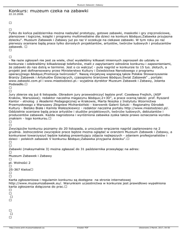 Muzeum Zabawek i Zabawy Konkurs: muzeum czeka na zabawki 22.10.2008. Tylko do końca października można nadsyłać prototypy, gotowe zabawki, maskotki i gry zręcznościowe, planszowe i logiczne, książki i programy multimedialne dla dzieci na konkurs „Zabawka przyjazna dziecku". Muzeum Zabawek i Zabawy już po raz V oczekuje na ciekawe zabawki. W tym roku po raz pierwszy oceniane będą prace tylko dorosłych projektantów, artystów, twórców ludowych i producentów zabawek. - Na razie zgłoszeń nie jest za wiele, choć wysłaliśmy kilkaset imiennych zaproszeń do udziału w konkursie i odebraliśmy kilkadziesiąt telefonów, maili z zapytaniami odnośnie konkursu i zapewnieniami, że zabawki do nas dotrą w terminie. Jest o co walczyć - pula nagród w konkursie to 15 tys. złotych, a projekt jest dofinansowany przez Ministerstwo Kultury i Dziedzictwa Narodowego z programu operacyjnego „Promocja twórczości". Naszą inicjatywę wspierają także Polskie Stowarzyszenie Branży Zabawek i Artykułów Dziecięcych, czasopismo branżowe „Świat Zabawek" , portale: www.zabawki.com.pl i www.miastodzieci.pl.- wyjaśnia dyrektor Muzeum Zabawek i Zabawy, Jolanta Podsiadło. Jury zbierze się już 6 listopada. Obradom jury przewodniczyć będzie prof. Czesława Frejlich, (ASP Kraków, Warszawa); redaktor naczelna magazynu „2+3D", a prace ocenią także: prof. Ryszard Kantor - etnolog z Akademii Pedagogicznej w Krakowie, Marta Noszka z Instytutu Wzornictwa Przemysłowego z Warszawy Zbigniew Micherdziński - kierownik Galerii Sztuki - Regionalny Ośrodek Kultury - Bielsko Biała i Kamila Waleszkiewicz - redaktor naczelna portalu http://www.miastodzieci.pl/. Oddzielnie oceniane będą prace artystów i studiów projektowych, twórców ludowych, debiutantów i producentów zabawek. Każda nagrodzona i wyróżniona zabawka zyska także prawo oznaczania wyrobu znakiem - logo konkursu. Zwycięzców konkursu poznamy do 20 listopada, a uroczyste wręczenie nagród zaplanowano na 2 grudnia. Jednocześnie zwycięskie prace będzie można oglądać w oranżerii Muzeum Zabawek i Zabawy, a konkursowi towarzyszyć będzie katalog prezentujący zdjęcia najlepszych - zdaniem profesjonalistów i dzieci - polskich zabawek V konkursu „Zabawka przyjazna dziecku". Zabawki (maksymalnie 3) można zgłaszać do 31 października przesyłając na adres: Muzeum Zabawek i Zabawy pl. Wolności 2 25-367 Kielce Karta zgłoszeniowa i regulamin konkursu są dostępne na stronie internetowej http://www.muzeumzabawek.eu/. Warunkiem uczestnictwa w konkursie jest prawidłowo wypełniona karta zgłoszenia dołączona do prac. http://www.arch.muzeumzabawek.eu Kreator PDF Utworzono 2 March, 2017, 04:56