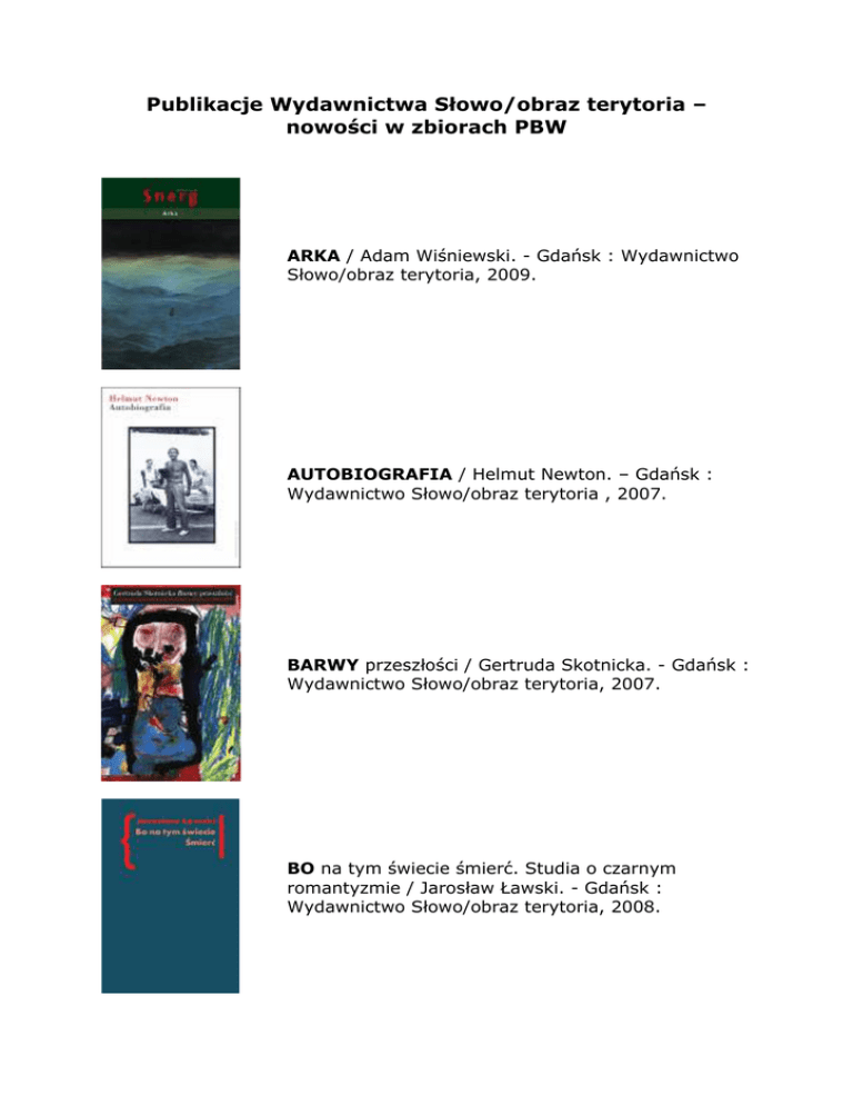 Publikacje Wydawnictwa Słowo/obraz terytoria – nowości w zbiorach PBW ARKA / Adam Wiśniewski. - Gdańsk : Wydawnictwo Słowo/obraz terytoria, 2009. AUTOBIOGRAFIA / Helmut Newton. – Gdańsk : Wydawnictwo Słowo/obraz terytoria , 2007. BARWY przeszłości / Gertruda Skotnicka. - Gdańsk : Wydawnictwo Słowo/obraz terytoria, 2007. BO na tym świecie śmierć. Studia o czarnym romantyzmie / Jarosław Ławski. - Gdańsk : Wydawnictwo Słowo/obraz terytoria, 2008. BOSKA analogia. William Blake a sztuka starożytności / Michał Fostowicz. - Gdańsk : Wydawnictwo Słowo/obraz terytoria, 2008. CZESKA myśl filmowa / red. Andrzej Gwóźdź Tom 2: Reguły gry. - Gdańsk : Wydawnictwo Słowo/obraz terytoria, 2007. DE Immundo / Jean Clair. - Gdańsk : Wydawnictwo Słowo/obraz terytoria, 2007. DRAMATY Modrzejewskiej / red. Robert Urbański. Gdańsk : Wydawnictwo Słowo/obraz terytoria, 2007. DWUDZIESTOLECIE międzywojenne. Słownik literatury polskiej / Grzegorz Gazda. - Gdańsk : Wydawnictwo Słowo/obraz terytoria, 2008. DWUGŁOS o złu. Ze studiów nad myślą Józefa Tischnera i Leszka Kołakowskiego / Zbyszek Dymarski. - Gdańsk : Wydawnictwo Słowo/obraz terytoria, 2008. DYSONANSE krytyki. O ocenie wykonania dzieła muzycznego / Anna Chęćka – Gotkowicz. - Gdańsk : Wydawnictwo Słowo/obraz terytoria, 2008. DZIADEK w Wehrmachcie / Barbara Szczepuła. Gdańsk : Wydawnictwo Słowo/obraz terytoria, 2007. DZIENNIKI filozoficzne / George Berkeley. - Gdańsk : Wydawnictwo Słowo/obraz terytoria, 2008. DZIESIĘĆ (możliwych) przyczyn smutku myśli / George Steiner. - Gdańsk : Wydawnictwo Słowo/obraz terytoria, 2007. EROTYZM / Georges Bataille. - Gdańsk : Wydawnictwo Słowo/obraz terytoria, 2007. EUROPA i jej narody / Krzysztof Pomian. - Gdańsk : Wydawnictwo Słowo/obraz terytoria, 2009. FARBA znaczy krew / Zenon Kruczyński. - Gdańsk : Wydawnictwo Słowo/obraz terytoria, 2008. FOTOGRAFIA mowa ludzka. Perspektywy historyczne / Urszula Czartoryska Tom 2: - Gdańsk : Wydawnictwo Słowo/obraz terytoria, 2007. GDAŃSK w literaturze. Bibliografia od roku 997 do dzisiaj. Tom I. Ok. 998-1600. - Gdańsk : Wydawnictwo Słowo/obraz terytoria, 2009. GDAŃSK w literaturze. Bibliografia od roku 997 do dzisiaj red. Leszek Rybicki Tom 5: 1945-1979. Gdańsk : Wydawnictwo Słowo/obraz terytoria, 2007. GLENN Gould czyli sztuka fugi / red. Stefan Rieger. Gdańsk : Wydawnictwo Słowo/obraz terytoria, 2007. GORĄCZKA romantyczna / Maria Janion. - Gdańsk : Wydawnictwo Słowo/obraz terytoria, 2007. GUDZOWATY / Jacek Prześluga. - Gdańsk : Wydawnictwo Słowo/obraz terytoria, 2008. HEIDEGGER i problem zła / Cezary Wodziński. - Gdańsk : Wydawnictwo Słowo/obraz terytoria, 2008. HISTORIA filozofii rosyjskiej / Leonid Stołowicz. Gdańsk : Wydawnictwo Słowo/obraz terytoria, 2008. HISTORIA twarzy / Jean-Jacques Courtine, Claudine Haroche. - Gdańsk : Wydawnictwo Słowo/obraz terytoria, 2007. HOHAJ / Elisabeth Rynell. - Gdańsk : Wydawnictwo Słowo/obraz terytoria, 2009. INNE obrazy / Maria Poprzęcka. - Gdańsk : Wydawnictwo Słowo/obraz terytoria, 2009. KINO bezpośrednie / Mirosław Przylipiak. - Gdańsk : Wydawnictwo Słowo/obraz terytoria, 2008. KRYZYS muzeów / Jean Clair. - Gdańsk : Wydawnictwo Słowo/obraz terytoria, 2009. KSIĘGA listów / Bruno Schulz. wyd. 3. - Gdańsk : Wydawnictwo Słowo/obraz terytoria, 2008. LALKA / Alisa Mun. - Gdańsk : Wydawnictwo Słowo/obraz terytoria, 2007. LEO, Leo i lwy / Wojciech Kołyszko, Joanna Tomaszewska. - Gdańsk : Wydawnictwo Słowo/obraz terytoria, 2007. LEO, Leo i morze / Wojciech Kołyszko, Joanna Tomaszewska. - Gdańsk : Wydawnictwo Słowo/obraz terytoria, 2007. LITERATURA Europy. Historia literatury europejskiej. - Gdańsk : Wydawnictwo Słowo/obraz terytoria, 2009. LOGO nieśmiertelności / Cezary Wodziński. - Gdańsk : Wydawnictwo Słowo/obraz terytoria, 2008. MAŁE wielkie kino. Film animowany od narodzin do końca okresu klasycznego / Paweł Sitkiewicz. Gdańsk : Wydawnictwo Słowo/obraz terytoria, 2009. MIĘDZY anegdotą a doświadczeniem / Cezary Wodziński. - Gdańsk :Wydawnictwo Słowo/obraz terytoria, 2008. MIEJSCA wspólne, miejsca własne / Wojciech Owczarski. - Gdańsk :Wydawnictwo Słowo/obraz terytoria, 2007. MIÓD i wosk / Krzysztof Lipowski. - Gdańsk : Wydawnictwo Słowo/obraz terytoria, 2008. MNEMOSYNE / Mario Praz. - Gdańsk : Wydawnictwo Słowo/obraz terytoria, 2007. NAJWIĘKSZE spośród trzech / Andros Zemenidis. Gdańsk : Wydawnictwo Słowo/obraz terytoria, 2009. NIECH się rozpęta burza / Leena Lander. - Gdańsk : Wydawnictwo Słowo/obraz terytoria, 2008. NIEMY kraj. Polskie motywy w europejskim kinie niemym (1896–1930) / Jerzy Maśnicki.- Gdańsk : Wydawnictwo Słowo/obraz terytoria, 2007. [NIENAPISANE] / Stanisław Rosiek. - Gdańsk : Wydawnictwo Słowo/obraz terytoria, 2008. NIETZSCHE. Zapiski przyjaciela / Franz Overbeck. - Gdańsk : Wydawnictwo Słowo/obraz terytoria, 2008. NIEWIELKI słownik typograficzny / Jacek Mrowczyk. - Gdańsk : Wydawnictwo Słowo/obraz terytoria, 2008. NIKT tylko Mickiewicz / Mikołaj Sokołowski. - Gdańsk : Wydawnictwo Słowo/obraz terytoria, 2008. NOWA sztuka pisania komedii w dzisiejszych czasach przedstawiona Akademii w Madrycie / Lope de Vega. - Gdańsk : Wydawnictwo Słowo/obraz terytoria, 2009. OBROTY przestrzeni / Jerzy Limon. - Gdańsk : Wydawnictwo Słowo/obraz terytoria, 2008. OBSZARY odmienności. Rzecz o Marii Komornickiej / Izabela Filipiak. - Gdańsk : Wydawnictwo Słowo/obraz terytoria, 2007. O CUDOWNOŚCI u Shakespeare'a i inne pisma krytyczne / Ludwig Tieck. - Gdańsk : Wydawnictwo Słowo/obraz terytoria, 2007. OKNO w żółci kadmowej albo o tym, co kryje się pod spodem malarstwa / Hubert Damisch. - Gdańsk : Wydawnictwo Słowo/obraz terytoria, 2007. ORO / Adam Wiśniewwki-Snerg. - Gdańsk : Wydawnictwo Słowo/obraz terytoria, 2009. OSTATNI pasaż. Przypowieść o byciu byle-jakim / Krzysztof Rutkowski. - Gdańsk : Wydawnictwo Słowo/obraz terytoria, 2007. O ŚMIECHU Demokryta / 