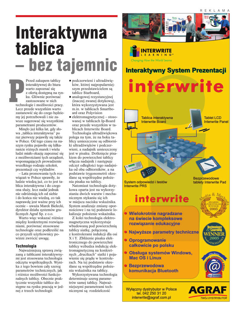 R E K L A M A Interaktywna tablica – bez tajemnic P Przed zakupem tablicy interaktywnej do biura warto zapoznać się z ofertą dostępną na rynku. Głównie porównać zastosowane w nich technologie i możliwości pracy. Lecz przede wszystkim warto zastanowić się do czego będziemy jej potrzebowali i nie zawsze sugerować się wszystkimi parametrami producentów. Minęło już kilka lat, gdy słowa „tablica interaktywna” po raz pierwszy pojawiły się także w Polsce. Od tego czasu na naszym rynku pojawiło się kilkanaście różnych marek i wielu ludzi miało okazję zapoznać się z możliwościami tych urządzeń, wspomagających prowadzenie wszelkiego rodzaju szkoleń, prezentacji czy wykładów. – Lata promowania tych rozwiązań w Polsce sprawiły, że ludzie wiedzą już, co to jest tablica interaktywna i do czego ona służy, lecz nadal jednak nie odróżniają ich od siebie i do końca nie wiedzą, co tak naprawdę jest ważne przy ich ocenie – uważa Marek Bielecki, dyrektor działu systemów graficznych Agraf Sp. z o.o. Warto więc wskazać różnice między konkretnymi rozwiązaniami, porównać stosowane technologie oraz podkreślić na co przyszli użytkownicy powinni zwrócić uwagę. Technologia Najważniejszą sprawą związaną z tablicami interaktywnymi jest stosowana technologia odczytu współrzędnych. Wynika z tego bowiem cały szereg parametrów technicznych, jak i różnice możliwości funkcjonalnych tablicy. Obecnie praktycznie wszystkie tablice dostępne na rynku pracują w jednej z trzech technologii: # podczerwieni i ultradźwięków, której najpopularniejszym przedstawicielem są tablice Starboard, # analogowej rezystancyjnej (inaczej zwanej dotykową), która wykorzystywana jest m.in. w tablicach Smartboard oraz Polyvision # elektromagnetycznej – stosowanej w tablicach Ip-Board oraz przede wszystkim w tablicach Interwrite Board. Technologia ultradźwiękowa polega na tym, że na boku tablicy umieszczone są odbiorniki ultradźwięków i podczerwieni, a nadajnik umieszczony jest w pisaku. Dotknięcie pisakiem do powierzchni tablicy włącza nadajnik i następuje odczyt odległości tego nadajnika od obu odbiorników, a na podstawie trygonometrii określane są współrzędne położenia pisaka na tablicy. Natomiast technologia dotykowa oparta jest na wykorzystaniu dwóch warstw i mechanicznym stykaniu się ich w miejscu nacisku wskaźnika. System analizuje zmiany opornościowe i na tej podstawie lokalizuje położenie wskaźnika. Z kolei technologia elektromagnetyczna wykorzystuje wbudowaną pod powierzchnią tablicy siatkę, połączoną z kontrolerami indukcji dla osi X i Y. Zbliżenie pisaka elektronicznego do powierzchni tablicy wzbudza indukcję elektromagnetyczną na konkretnych „drucikach” siatki i pojawienie się prądu w kontrolerach. Na tej podstawie określane są współrzędne położenia wskaźnika na tablicy. Wykorzystywana technologia determinuje szereg parametrów samej tablicy. Najważniejszymi parametrami technicznymi są: rozdzielczość TECHNIKA I WYPOSAŻENIE sprzętowa tablicy, obsługiwane rozdzielczości ekranu, prędkość odczytu współrzędnych. Rozdzielczość sprzętowa to dokładność z jaką system jest w stanie ustalić położenie wskaźnika dla tablic dotykowych i elektromagnetycznych, a w przypadku tablic ultradź- więkowych minimalna odległość o jaką przesuniemy wskaźnik, tak aby system w ogóle zarejestrował to przesunięcie. W przypadku tego parametru zdecydowaną przewagę mają tablice elektromagnetyczne, których rozdzielczość sprzętowa jest ponad 10-krotnie wyższą niż tablic dotykowych oraz ponad 40-krotnie wyższa niż tablic ultradźwiękowych. Technologia ta bowiem została wymyślona do potrzeb profesjonalnych zastosowań w branży inżynierskiej CAD/CAM/GIS, gdzie od wielu lat (także w Polsce) tablice sprzedawane są jako digitizery do odczytu współrzędnych z map geodezyjnych czy rysunków technicznych. Zaś obsługiwane rozdzielczości ekranu to parametr ściśle związany z rozdzielczością sprzętową tablicy – określa maksymalną rozdzielczość wyświetlanego obrazu, w pełni obsługiwaną przez tablicę. W odniesieniu do tego parametru absolutnym liderem są tablice Interwrite Board, które obsługują rozdzielczości nawet do poziomu 46500 × 62000 pikseli podczas, gdy maksymalną rozdzielczością tablic dotykowych jest 4000 × 4000 pikseli, a tablic ultradźwiękowych tylko 1024 × 768 pikseli. Natomiast prędkość odczytu współrzędnych to bardzo ważny parametr, który ma odniesienie do komfortu pracy z tablicą. Determinuje on jak szybko możemy pisać na tablicy mając pewność, że system nie „zgubi” współrzędnych. Parametr ten związany jest także z prędkością przesyłu danych z tablicy do komputera. Zbyt mała prędkość może powodować też opóźnienia np. w pojawianiu się cyfrowego atramentu, co może być denerwujące dla osoby piszącej. Także w przypadku tych parametrów zdecydowaną przewagę mają tablice elektromagnetyczne, najsłabiej zaś wypadają tablice ultradźwiękowe. Konstrukcja tablicy Ważnym parametrem charakteryzującym tablice jest ich konstrukcja mechaniczna oraz jakość ich powierzchni. Ma to związek z różnorodnym zastosowaniem tablic, które mogą zastępować ekran projekcyjny, zwykły flipchart czy tablicę suchościeralną. Przy pracy w trybie interaktywnym obraz komputera jest wyświetlany za pomocą projektora na tablicy interaktywnej. Dlatego powierzchnia tablicy, aby jakość wyświetlanego obrazu była jak najwyższa, musi spełniać takie same wymogi jak najlepsze ekrany projekcyjne. Można wtedy osiągnąć idealny obraz przy dużych rozdzielczościach, nawet przy minimalnym zaciemnieniu oraz redukcję odblasku projektora (będącego główną przyczyną zmęczenia wzroku). Obecnie praktycznie wszystkie tablice mają powierzchnię zapewniającą bardzo dobre parametry pod tym względem. Tabli