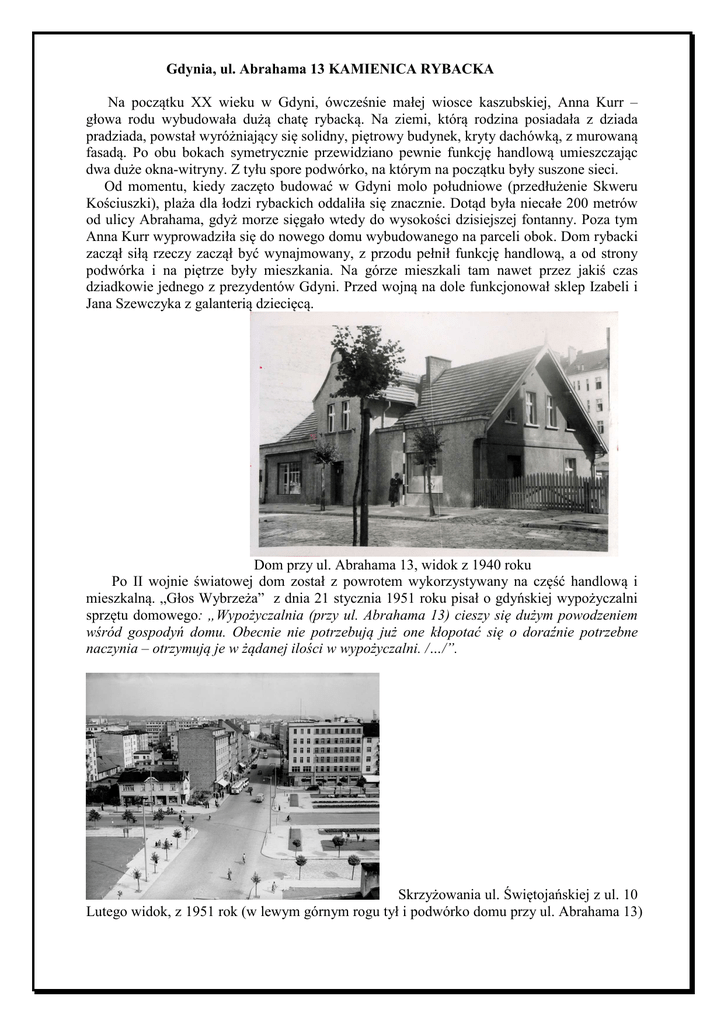 Gdynia, ul. Abrahama 13 KAMIENICA RYBACKA Na początku XX wieku w Gdyni, ówcześnie małej wiosce kaszubskiej, Anna Kurr – głowa rodu wybudowała dużą chatę rybacką. Na ziemi, którą rodzina posiadała z dziada pradziada, powstał wyróżniający się solidny, piętrowy budynek, kryty dachówką, z murowaną fasadą. Po obu bokach symetrycznie przewidziano pewnie funkcję handlową umieszczając dwa duże okna-witryny. Z tyłu spore podwórko, na którym na początku były suszone sieci. Od momentu, kiedy zaczęto budować w Gdyni molo południowe (przedłużenie Skweru Kościuszki), plaża dla łodzi rybackich oddaliła się znacznie. Dotąd była niecałe 200 metrów od ulicy Abrahama, gdyż morze sięgało wtedy do wysokości dzisiejszej fontanny. Poza tym Anna Kurr wyprowadziła się do nowego domu wybudowanego na parceli obok. Dom rybacki zaczął siłą rzeczy zaczął być wynajmowany, z przodu pełnił funkcję handlową, a od strony podwórka i na piętrze były mieszkania. Na górze mieszkali tam nawet przez jakiś czas dziadkowie jednego z prezydentów Gdyni. Przed wojną na dole funkcjonował sklep Izabeli i Jana Szewczyka z galanterią dziecięcą. Dom przy ul. Abrahama 13, widok z 1940 roku Po II wojnie światowej dom został z powrotem wykorzystywany na część handlową i mieszkalną. „Głos Wybrzeża” z dnia 21 stycznia 1951 roku pisał o gdyńskiej wypożyczalni sprzętu domowego: „Wypożyczalnia (przy ul. Abrahama 13) cieszy się dużym powodzeniem wśród gospodyń domu. Obecnie nie potrzebują już one kłopotać się o doraźnie potrzebne naczynia – otrzymują je w żądanej ilości w wypożyczalni. /…/”. Skrzyżowania ul. Świętojańskiej z ul. 10 Lutego widok, z 1951 rok (w lewym górnym rogu tył i podwórko domu przy ul. Abrahama 13) Od 1966 roku na dole funkcjonowała „Pracownia Kapeluszy Damskich” Danuty Gawlik, która przez 45 lat ubierała gdyńskie elegantki oraz młode kobiety do ślubu. Po drugiej stronie fasady przez długi czas działała „Pracownia gorseciarska” prowadzona przez rodzinę Grzenkowiczów. Na tym miejscu od lat dziewięćdziesiątych powstała słynna „Pizzeria AMD” prowadzona przez potomków dawnych właścicieli. Oba te miejsca funkcjonowały do 2011 r. Widok Abrahama 13, koniec lat 90-tych Powstająca przy Abrahama 13 KAMIENICA RYBACKA swoim architektonicznym rozwiązaniem odwołuje się do dobrych gdyńskich tradycji, a nazwa i blisko stuletnia fasada, zachowana w oryginalnej formie i wkomponowana w nowy budynek, nawiązuje do pierwotnej funkcji tego domu. Brama i fragment posesji Abrahama 13 tuż przed budową KAMIENICY RYBACKIEJ. Wg. „Encyklopedia Gdyni”, „Gdynia w gazetach przez 75 lat” i materiałów własnych sporządził Arkadiusz Brzęczek