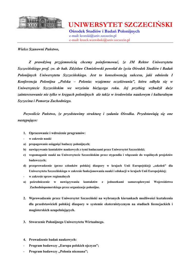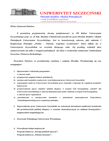 UNIWERSYTET SZCZECIŃSKI Ośrodek Studiów i Badań Polonijnych e-mail: [email protected] e-mail: [email protected] Wielce Szanowni Państwo, Z prawdziwą przyjemnością chcemy poinformować, że JM Rektor Uniwersytetu Szczecińskiego prof. zw. dr hab. Zdzisław Chmielewski powołał do życia Ośrodek Studiów i Badań Polonijnych Uniwersytetu Szczecińskiego. Jest to konsekwencją sukcesu, jaki odniosła I Konferencja Polonijna „Polska – Polonia: wzajemne oczekiwania”, która odbyła się w Uniwersytecie Szczecińskim we wrześniu bieżącego roku. Jej przebieg wzbudził duże zainteresowanie nie tylko w kręgach polonijnych ale także w środowisku naukowym i kulturalnym Szczecina i Pomorza Zachodniego. Pozwolicie Państwo, że przedstawimy strukturę i zadania Ośrodka. Przedstawiają się one następująco: 1. Opracowanie i wdrożenie programów: - w zakresie nauki a) propagowanie osiągnięć badaczy polonijnych; b) nawiązywanie kontaktów naukowych z tymi badaczami przez Uniwersytet Szczeciński; c) wspomaganie nauki na Uniwersytecie Szczecińskim przez stypendia i włączanie do wspólnych projektów badawczych; d) przeprowadzenie (przez członków polskiej diaspory w krajach Unii Europejskiej) „szkoleń” dla Uniwersytetu Szczecińskiego w zakresie funkcjonowania nauki i edukacji w krajach Unii Europejskiej; - w zakresie spraw regionalnych a) pośredniczenie w nawiązywaniu kontaktów z jednostkami samorządowymi Województwa Zachodniopomorskiego przez organizacje polonijne. 2. Wprowadzenie przez Uniwersytet Szczeciński na wybranych kierunkach możliwości kształcenia dla przedstawicieli polskiej diaspory w systemie eksternistycznym na studiach licencjackich i magisterskich uzupełniających. 3. Stworzenie Polonijnego Uniwersytetu Wirtualnego. 4. Prowadzenie badań naukowych: - Program badawczy „Europa polskich ojczyzn”; - Program badawczy „Polonia nieznana”; - Program badawczy „Polacy i Polonia na Wschodzie”; - Program badawczy „Polonia morska”. 5. Prowadzenie Stałego Sekretariatu Konferencji Polonijnej US Polska-Polonia: wzajemne oczekiwania. 6. Stworzenie miejsc skupienia Szczecinian zamieszkujących poza Polską. 7. Działalność wydawnicza. Struktura Ośrodka Studiów i Badań Polonijnych przedstawia się następująco: Dyrektor Ośrodka – prof. dr hab. Jacek Leoński; Pełnomocnik Rektora ds. Polonii – mgr Leszek Wątróbski; Stały Sekretariat Konferencji Polonijnej Polska-Polonia: wzajemne oczekiwania – red. Leszek Wątróbski. Kierownicy programów badawczych: Program badawczy „Europa polskich ojczyzn” – prof. dr hab. Jacek Leoński; Program badawczy „Polacy i Polonia na Wschodzie” – prof. dr hab. Andrzej Furier; Program badawczy „Polonia nieznana” – dr Alicja Hess-Leońska; Program badawczy „Polonia morska” – mgr Leszek Wątróbski. Mamy nadzieję, że idea Ośrodka spotka się z Państwa akceptacją i zechcecie Państwo z nami współpracować i wspierać nasze przedsięwzięcia.. Jesteśmy otwarci na wszelkie sugestie i propozycje dotyczące działalności Ośrodka. Pragniemy dodać, że w naszej działalności będziemy kierować się zasadami poszanowania poglądów i wolności nauki. Pozostajemy z wyrazami szacunku i – korzystając z okazji – pragniemy złożyć życzenia zdrowych, radosnych i miłych Świąt Bożego Narodzenia i wszelkiej pomyślności w Nowym 2003 Roku. Pełnomocnik Rektora d/s Polonii Dyrektor Ośrodka Studiów i Badań Polonijnych US mgr Leszek Wątróbski prof. dr hab. Jacek Leoński