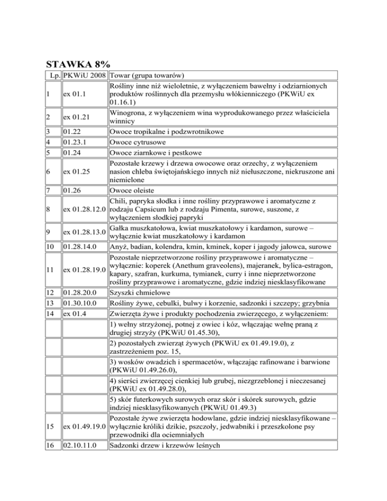 STAWKA 8% Lp. PKWiU 2008 Towar (grupa towarów) Rośliny inne niż wieloletnie, z wyłączeniem bawełny i odziarnionych 1 ex 01.1 produktów roślinnych dla przemysłu włókienniczego (PKWiU ex 01.16.1) Winogrona, z wyłączeniem wina wyprodukowanego przez właściciela 2 ex 01.21 winnicy 3 01.22 Owoce tropikalne i podzwrotnikowe 4 01.23.1 Owoce cytrusowe 5 01.24 Owoce ziarnkowe i pestkowe Pozostałe krzewy i drzewa owocowe oraz orzechy, z wyłączeniem 6 ex 01.25 nasion chleba świętojańskiego innych niż niełuszczone, niekruszone ani niemielone 7 01.26 Owoce oleiste Chili, papryka słodka i inne rośliny przyprawowe i aromatyczne z 8 ex 01.28.12.0 rodzaju Capsicum lub z rodzaju Pimenta, surowe, suszone, z wyłączeniem słodkiej papryki Gałka muszkatołowa, kwiat muszkatołowy i kardamon, surowe – 9 ex 01.28.13.0 wyłącznie kwiat muszkatołowy i kardamon 10 01.28.14.0 Anyż, badian, kolendra, kmin, kminek, koper i jagody jałowca, surowe Pozostałe nieprzetworzone rośliny przyprawowe i aromatyczne – wyłącznie: koperek (Anethum graveolens), majeranek, bylica-estragon, 11 ex 01.28.19.0 kapary, szafran, kurkuma, tymianek, curry i inne nieprzetworzone rośliny przyprawowe i aromatyczne, gdzie indziej niesklasyfikowane 12 01.28.20.0 Szyszki chmielowe 13 01.30.10.0 Rośliny żywe, cebulki, bulwy i korzenie, sadzonki i szczepy; grzybnia 14 ex 01.4 Zwierzęta żywe i produkty pochodzenia zwierzęcego, z wyłączeniem: 1) wełny strzyżonej, potnej z owiec i kóz, włączając wełnę praną z drugiej strzyży (PKWiU 01.45.30), 2) pozostałych zwierząt żywych (PKWiU ex 01.49.19.0), z zastrzeżeniem poz. 15, 3) wosków owadzich i spermacetów, włączając rafinowane i barwione (PKWiU 01.49.26.0), 4) sierści zwierzęcej cienkiej lub grubej, niezgrzeblonej i nieczesanej (PKWiU ex 01.49.28.0), 5) skór futerkowych surowych oraz skór i skórek surowych, gdzie indziej niesklasyfikowanych (PKWiU 01.49.3) Pozostałe żywe zwierzęta hodowlane, gdzie indziej niesklasyfikowane – 15 ex 01.49.19.0 wyłącznie króliki dzikie, pszczoły, jedwabniki i przeszkolone psy przewodniki dla ociemniałych 16 02.10.11.0 Sadzonki drzew i krzewów leśnych Lp. PKWiU 2008 Towar (grupa towarów) 17 02.10.12.0 Nasiona drzew i krzewów leśnych 18 02.20.14.0 Drewno opałowe Dziko rosnące jadalne produkty leśne – wyłącznie leśne grzyby, jagody 19 ex 02.30.40.0 i orzechy Ryby i pozostałe produkty rybactwa; usługi wspomagające rybactwo, z 20 ex 3 wyłączeniem: 1) pereł nieobrobionych (PKWiU 03.00.5), 2) pozostałych produktów połowów (PKWiU 03.00.6) 21 ex 08.11.30.0 Kreda i dolomit inny niż kalcynowany – wyłącznie: 1) kreda mielona, pastewna, 2) kreda mielona, nawozowa, 3) mączka dolomitowa Pozostałe minerały chemiczne i do produkcji nawozów – wyłącznie 22 ex 08.91.19.0 ziemia ogrodnicza inna niż zawierająca torf jako zasadniczy składnik i inna niż będąca mieszaniną naturalnej gleby, piasku, gliny i minerałów Torf – wyłącznie surowiec i półfabrykaty do produkcji torfu dla celów 23 ex 08.92.10.0 rolniczych oraz wyroby torfowe dla celów rolniczych 24 ex 10.1 Mięso i wyroby z mięsa, zakonserwowane, z wyłączeniem: 1) tłuszczów technicznych, 2) produktów ubocznych garbarń, 3) skór i skórek, niejadalnych, 4) piór, puchu, pierza i skórek ptaków 25 10.2 Ryby, skorupiaki i mięczaki, przetworzone i zakonserwowane Owoce i warzywa przetworzone i zakonserwowane, z wyłączeniem 26 ex 10.3 produktów o zawartości alkoholu powyżej 1,2 % 27 ex 10.4 Oleje i tłuszcze zwierzęce i roślinne – wyłącznie jadalne Wyroby mleczarskie, z wyłączeniem kazeiny do produkcji regenerowanych włókien tekstylnych oraz kazeiny do stosowania w 28 ex 10.5 przemyśle innym niż produkujący żywność, pasze lub w przemyśle włókienniczym (PKWiU ex 10.51.53.0) 29 10.61 Produkty przemiału zbóż 30 10.62 Skrobia i wyroby skrobiowe Pieczywo świeże, którego data minimalnej trwałości oznaczona zgodnie z odrębnymi przepisami nie przekracza 14 dni, a w przypadku 31 ex 10.71.11.0 oznaczania tych towarów zgodnie z odrębnymi przepisami wyłącznie terminem przydatności do spożycia, termin ten również nie przekracza 14 dni Wyroby ciastkarskie i ciastka, świeże, których data minimalnej trwałości oznaczona zgodnie z odrębnymi przepisami nie przekracza 14 32 ex 10.71.12.0 dni, a w przypadku oznaczania tych towarów zgodnie z odrębnymi przepisami wyłącznie terminem przydatności do spożycia, termin ten również nie przekracza 14 dni Lp. PKWiU 2008 Towar (grupa towarów) Pieczywo chrupkie, suchary, sucharki, pieczywo tostowe i podobne 33 ex 10.72.11.0 wyroby – wyłącznie pieczywo chrupkie oraz tosty z chleba i podobne tosty Piernik i podobne wyroby; słodkie herbatniki; gofry i wafle – wyłącznie 34 ex 10.72.12.0 wafle i opłatki o zawartości wody przekraczającej 10 % masy Pozostałe piekarskie i ciastkarskie wyroby suche lub konserwowane – 35 ex 10.72.19.0 wyłącznie chleb przaśny (maca), opłatki sakralne i podobne produkty, bułka tarta 36 10.73.11.0 Makarony, pierogi, kluski i podobne wyroby mączne 37 10.73.12.0 Kuskus Cukier, z wyłączeniem cukru i syropu klonowego, zawierającego 38 ex 10.81 dodatek środków aromatyzujących lub barwiących (PKWiU ex 10.81.13.0) Owoce, orzechy, skórki z owoców i pozostałe części roślin, 39 10.82.24.0 zakonserwowane cukrem Substytuty kawy; ekstrakty, esencje i koncentraty z kawy lub substytutów kawy; łupiny i łuski kawy – wyłącznie cykoria palona, 40 ex 10.83.12.0 pozostałe palone namiastki kawy oraz ich ekstrakty, esencje i koncentraty Sosy; mieszanki przypraw; mąka i mączka z gorczycy oraz gotowa 41 ex 10.84.12.0 musztarda, z wyłączeniem musztardy gotowej Gotowe posiłki i dania, z wyłączeniem produktów o zawartości 42 ex 10.85.1 alkoholu powyżej 1,2 % 43 10.86.10.0 Przetwory homogenizowane oraz żywność dietetyczna 44 10.89.11.0 Zupy i buliony oraz przetwory z nich Jaja bez skorupek