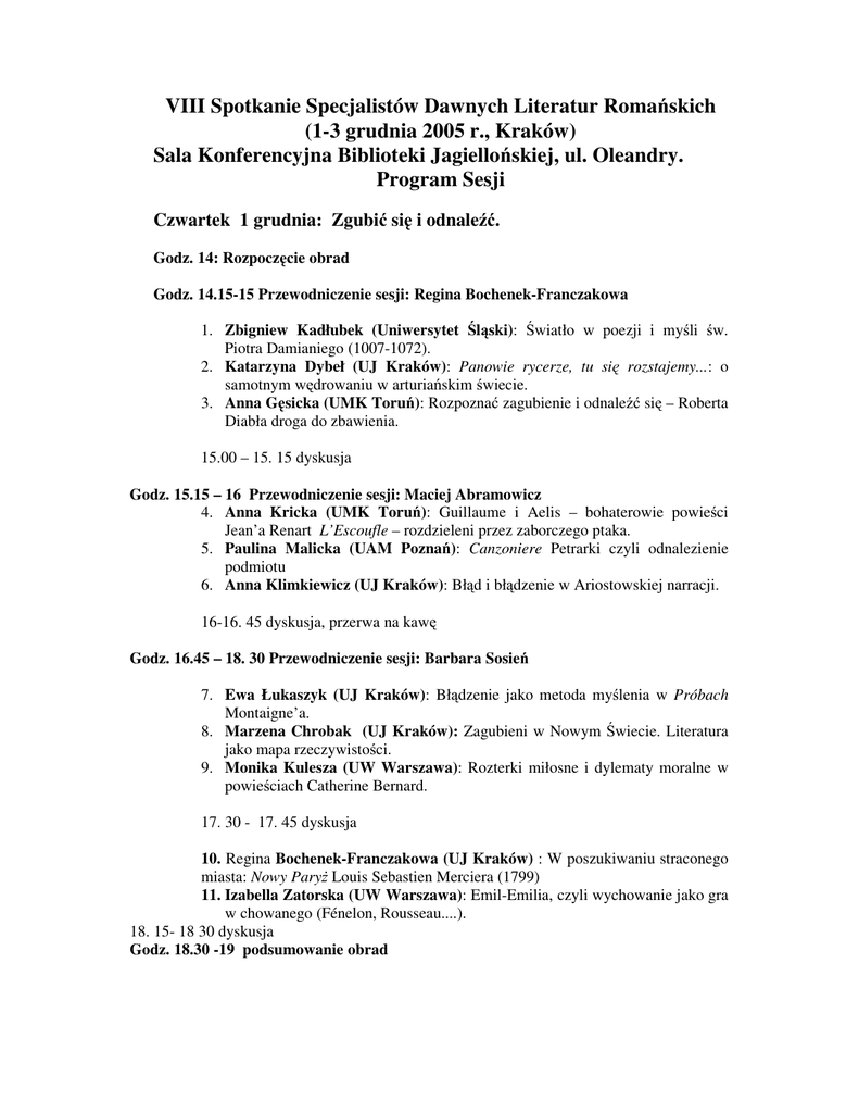 VIII Spotkanie Specjalistów Dawnych Literatur Roma skich (1-3 grudnia 2005 r., Kraków) Sala Konferencyjna Biblioteki Jagiello skiej, ul. Oleandry. Program Sesji Czwartek 1 grudnia: Zgubi si i odnale . Godz. 14: Rozpocz cie obrad Godz. 14.15-15 Przewodniczenie sesji: Regina Bochenek-Franczakowa 1. Zbigniew Kadłubek (Uniwersytet l ski): wiatło w poezji i my li w. Piotra Damianiego (1007-1072). 2. Katarzyna Dybeł (UJ Kraków): Panowie rycerze, tu si rozstajemy...: o samotnym w drowaniu w arturia skim wiecie. 3. Anna G sicka (UMK Toru ): Rozpozna zagubienie i odnale si – Roberta Diabła droga do zbawienia. 15.00 – 15. 15 dyskusja Godz. 15.15 – 16 Przewodniczenie sesji: Maciej Abramowicz 4. Anna Kricka (UMK Toru ): Guillaume i Aelis – bohaterowie powie ci Jean’a Renart L’Escoufle – rozdzieleni przez zaborczego ptaka. 5. Paulina Malicka (UAM Pozna ): Canzoniere Petrarki czyli odnalezienie podmiotu 6. Anna Klimkiewicz (UJ Kraków): Bł d i bł dzenie w Ariostowskiej narracji. 16-16. 45 dyskusja, przerwa na kaw Godz. 16.45 – 18. 30 Przewodniczenie sesji: Barbara Sosie 7. Ewa Łukaszyk (UJ Kraków): Bł dzenie jako metoda my lenia w Próbach Montaigne’a. 8. Marzena Chrobak (UJ Kraków): Zagubieni w Nowym wiecie. Literatura jako mapa rzeczywisto ci. 9. Monika Kulesza (UW Warszawa): Rozterki miłosne i dylematy moralne w powie ciach Catherine Bernard. 17. 30 - 17. 45 dyskusja 10. Regina Bochenek-Franczakowa (UJ Kraków) : W poszukiwaniu straconego miasta: Nowy Pary Louis Sebastien Merciera (1799) 11. Izabella Zatorska (UW Warszawa): Emil-Emilia, czyli wychowanie jako gra w chowanego (Fénelon, Rousseau....). 18. 15- 18 30 dyskusja Godz. 18.30 -19 podsumowanie obrad Pi tek, 2 grudnia: Choroba ciała, ducha i umysłu. Godz. 9-9.45 Przewodniczenie sesji: Maja Pawłowska 1. Anna Loba (UMK Pozna ): Mał e stwo jako choroba. Ksi ga o przymiotach sakramentu mał e stwa i pociecha zam nych pa Filipa de Mézières. 2. Aneta Pytka (UJ Kraków): Wró ki, wied my, czarodziejki czyli o wpływie magii na zdrowie ciała, ducha i umysłu w XIII-wiecznym cyklu LancelotGraal. 3. Anna Michałek-Simi ska (Uniwersytet Sczeci ski i Nancy II) : Rex furore subito commotus est – o chorobach królów w pó no redniowiecznej Francji. Dyskusja Godz. 10-11 Przewodniczenie sesji: Izabella Zatorska 4. Teresa Eminowicz (UJ Kraków): wi ty Dominik lekarz duszy i ciała 5. Gra yna Urban-Godziek (UJ Kraków): Choroba ciała i niemoc twórcza w nowołaci skiej poezji włoskiej. 6. Joanna Gorecka-Kalita (UJ Kraków): Ciało w rozkładzie i grzech cielesny w Livre du Lancelot Dyskusja, przerwa na kaw Godz. 11.30 –12. 45 Przewodniczenie sesji: Teresa Eminowicz 7. Rosanna Krzyszkowska-Pawlik (UJ Kraków): Człowiek szalony - człowiek dziki: percepcja szale stwa w hiszpa skiej literaturze redniowiecznej 8. Anna Rzepka (UJ Kraków): „Choroba melancholijnego nastroju” w Lojalnym doradcy Króla Edwarda 9. Ewa Dorota ółkiewska (UW Warszawa): Mi dzy szale stwem a głupot . Przykład trzynastowiecznej literatury komicznej. 10. Anna Głodowska (UMK Toru ) : Obraz choroby duszy i ciała w Dekameronie Boccaccia. 11. Krystyna Antkowiak (Uniw. Lódzki), Szale stwo u Des Périers’a i Guillaume’a Budé. Dyskusja Godz. 13 - 15 Przerwa na obiad Godz. 15 – 16 Przewodniczenie sesji: Ewa Dorota ółkiewska 12. Krystyna Gabryjelska (Uniwersytet Wrocławski): Dziecko – ofiara dawnej Francji. 13. Dorota Szeliga (Uniwersytet Warszawski): Rabelais i Montaigne o chorobie, pacjencie i lekarzu. 14. Joanna Pietrzak-Thébault (Uniwersytet Warszawski): Leczy ciało, leczy dusz – w ród XVI-wiecznych zielników i nie tylko. 15. Justyna Łukaszewicz (Uniwersytet Wrocławski): Chorzy z urojenia i lekarze mimo woli w komediach Moliera i ich polskich przekładach. dyskusja Godz. 16.15- 17 Przewodniczenie sesji: Dorota Szeliga 16. Monika Surma-Gawłowska (UJ Kraków) : Scena szale stwa w teatrze włoskim XVI i XVII w. 17. Barbara Sosie (UJ Kraków): Mon mal vient de plus loin : o chorobie duszy i ciała w tragediach Racine’a. 18. Maja Pawłowska (Uniwersytet Wrocławski): Czy lektura romansów jest chorob ? Kilka odpowiedzi francuskich siedemnastowiecznych teoretyków. Dyskusja, przerwa na kaw Godz. 17.30-18.30 Przewodniczenie sesji : Anna Loba 19. Beata Michalak-Rajba (Uniwersytet Wrocławski): Choroba w powie ciach Marie-Jeanne Riccoboni. 20. Dorota Karwacka-Campo (Uniwersytet Gda ski): Rozpacz bez granic. Choroba króla Saula w dramacie Vittorio Alfieriego. 21. Paweł Matyaszewski (KUL): Studium choroby w Zakonnicy Diderota. 22. Marek Jastrz biec-Mosakowski (Uniw. Gda ski): Szale stwa ciała i duszy w Zakonnicy Diderota. Godz. 18. 30 -19 Dyskusja, zamkni cie sesji. Sobota 3 grudnia Ikoniczno w literaturze. Godz. 9- 9.45 Przewodniczenie sesji: Wacław Rapak 1. Magdalena Sakowska (PWSZ Wałbrzych) : Wizerunki wi tych kobiet w hagiografii starofrancuskiej pisanej przez kobiety. 2. Agata Sobczyk (Uniwersytet Warszawski): Słowo i obraz. Gautier de Coincy, Miracles de Nostre Dame. 3. Rafał Perkowski (UJ Kraków): Co miała na my li Christine de Pizan przywołuj c Wyobra ni w Livre du chemin de longue estude? (Uwagi na temat redniowiecznej wyobra ni). Dyskusja Godz. 10-11 Przewodniczenie sesji: Paweł Matyaszewski 4. Maria Ma lanka-Soro (UJ Kraków): Ikoniczno u Dantego. 5. Katarzyna Squillace (UJ Kraków): Ikoniczno w sonetach P. Bembo i G. Della Casa. 6. Monika Wo niak (UJ Kraków): Ikoniczno włoskiej poezji XII w. w przekładach na j zyk polski 7. Barbara Kornacka (UMK Pozna ): Trwanie ikon. Figury komedii dell’arte we włoskiej reklamie telewizyjnej. 11. 15 - 11. 45 Dyskusja, przerwa na kaw Godz. 11.45 – 12. 45 Przewodniczenie sesji: Maria Ma lanka-Soro 8. Ewa M. Wierzbowska (Uniw. Gda ski): Dwie wizje – dwie obsesje mierci w poezji XVII w. 9. Elwira Buszewicz (UJ Kraków): Od misterium pasyjnego do pobo nego madrygału: barokowe imitacje ody Horacego Donec gratus eram tibi. 10. Michał Bajer (UAM Pozna ): Okiem ciała