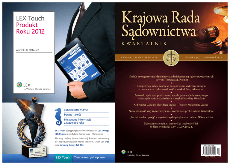 LEX Touch Produkt Roku 2012 www.LEX.pl/touch CENA 44,10 ZŁ (W TYM 5% VAT) NUMER 4 (17) GRUDZIEŃ 2012 Nadzór zewnętrzny nad działalnością administracyjną sądów powszechnych – artykuł Tomasza M. Niemca Kompetencje referendarzy w postępowaniu wykroczeniowym – postulat czy realna możliwość – artykuł Beaty Morawiec Prawo do sądu jako podstawowa zasada prawa administracyjnego wybranych państw zachodnich – artykuł Karoliny Wojszkun Od Amber Gold po likwidację sądów – felieton Waldemara Żurka Sprawdzona marka Pewna jakość Niezbędne informacje zawsze pod ręką Nieuchronność kary to nie wszystko – rozmowa z prof. Lechem Gardockim „Bo żyć trzeba z pasją” – wywiad z sędzią-żeglarzem Lechem Wiśniewskim Najważniejsze opinie, stanowiska i uchwały KRS podjęte w okresie: 1.07–30.09.2012 r. LEX Touch dostępny jest w dwóch wersjach: LEX Omega i LEX Sigma z modułami Komentarze i Monografie Pierwszy i jedyny System Informacji Prawnej dostosowany do najpopularniejszych marek tabletów, takich jak iPad oraz Samsung Galaxy Tab 10.1. LEX Touch Zawsze masz pełne prawo PKWiU 2008 58.14.12.0 Biblioteka Sądowa Nowa generacja produktów informacji prawnej www.LEX.pl/navigator Pełna interaktywność i przejrzystość postępowania administracyjnego, cywilnego i podatkowego. Każda czynność przedstawiona i opisana krok po kroku: *Wybór wszystkich dokumentów powiązanych merytorycznie z poszczególnymi etapami każdej procedury (m.in. orzeczenia, komentarze, monografie, wzory pism i deklaracji, pisma urzędowe). Procedura administracyjna – pod redakcją naukową prof. dr. hab. Andrzeja Wróbla Procedura cywilna – pod redakcją naukową dr. hab. prof. ALK Tadeusza Wiśniewskiego Procedura podatkowa – doradcy podatkowego Krzysztofa J. Musiała Pełna integracja procedur z zasobami SIP LEX oraz ABC*. Metodyka pracy sędziego cywilisty Obrona obligatoryjna w polskim procesie karnym Bogdan Bladowski Ryszard A. Stefański Metodyka pracy sędziego w sprawach o wykroczenia Psychologia sądowa dla prawników Dariusz Świecki Ewa Gruza Metodyka pracy sędziego w sprawach administracyjnych Konsekwencje naruszenia prawa Unii Europejskiej przez sądy krajowe Barbara Adamiak, Janusz Borkowski Maciej Taborowski Pisma sądowe w sprawach cywilnych Prawo spadkowe Bogdan Bladowski Liliana Kaltenbek-Skarbek, Waldemar Żurek Książki do nabycia w księgarni internetowej www.LEX.pl/navigator SPIS TREŚCI ARTYKUŁY I KOMENTARZE 5 – Nadzór zewnętrzny nad działalnością administracyjną sądów powszechnych – Tomasz M. Niemiec 10 – Kompetencje referendarzy w postępowaniu wykroczeniowym – postulat czy realna możliwość – Beata Morawiec 13 – Prawo do sądu jako podstawowa zasada prawa administracyjnego w wybranych państwach europejskich i w Stanach Zjednoczonych Ameryki Północnej – Karolina Wojszkun KRAJOWA RADA SĄDOWNICTWA KWARTALNIK Kolegium redakcyjne Redaktor naczelny Krzysztof Grajewski Z-ca redaktora naczelnego Roman Kęska LUDZIE I WYDARZENIA Felieton 26 – Od Amber Gold po likwidację sądów – Waldemar Żurek Barbara Godlewska-Michalak Justyna Kossak Małgorzata Niezgódka-Medek Waldemar Żurek Wywiad 27 – Nieuchronność kary to nie wszystko – rozmowa z prof. Lechem Gardockim – Alicja Seliga Kalendarz wydarzeń 32 – Uhonorowanie sędziów w stanie spoczynku medalem „Zasłużony dla Wymiaru Sprawiedliwości – Bene Merentibus Iustitiae” 33 – Spotkanie członków KRS z prof. Ireną Lipowicz, Rzecznikiem Praw Obywatelskich 34 – Lista osób powołanych przez Prezydenta RP Bronisława Komorowskiego do pełnienia urzędu sędziego 16.08 i 18.09.2012 r. 35 – Wybrane sylwetki nowych sędziów 35 – Krzysztof Staryk, SSN 35 – Barbara Stukan-Pytlowany, SNSA 36 – Nina Półtorak, SWSA w Krakowie 36 – Patrycja Joanna Suwaj, SWSA w Warszawie 37 – Tomasz Kobus, SSO w Warszawie 37 – Grażyna Szymańska-Pasek, SSO w Ostrołęce 38 – Anna Bojanowska-Wysmołek, SSR w Częstochowie 38 – Elżbieta Opałacz, SSR w Mielcu Współpraca międzynarodowa 39 – Współpraca w ramach sieci ENCJ – Karolina Janson-Ernert 40 – Spotkania, wizyty, konferencje – Rafał Michalczewski Sekretarz redakcji Bogdan Bugdalski tel. 22 535 82 59 e-mail: [email protected] Redaktor prowadzący Marcin Trepczyński e-mail: [email protected] Patronat honorowy SSN Antoni Górski Przewodniczący Krajowej Rady Sądownictwa Materiały do publikacji – o objętości do 15 stron maszynopisu (ok. 25 tysięcy znaków) – wraz z danymi autora (stanowisko, adres, numer telefonu) i ewentualnym listem polecającym prosimy przysyłać pocztą elektroniczną lub zwykłą, z załączoną płytą CD. Autor, przekazując redakcji tekst, przenosi na wydawcę wyłączne prawo do jego publikacji (prawa autorskie i wydawnicze). Redakcja zastrzega sobie możliwość dokonywania zmian w tekstach przeznaczonych do publikacji. Materiały niezamówione nie będą zwracane. Warunkiem publikacji tekstu jest odesłanie podpisanej umowy do Wydawnictwa. Podstawowe zasady recenzowania tekstów naukowych oraz wymagania dla autorów dotyczące ghostwritingu są dostępne na stronie internetowej czasopisma: www.czasopisma.lex.pl/krs. Pismo znajduje się na liście czasopism naukowych Ministerstwa Szkolnictwa Wyższego i Nauki z liczbą 2 punktów za każdą publikację naukową Wersją pierwotną (preferencyjną) czasopisma jest wydanie papierowe WYDAWCA POZA WOKANDĄ Wolters Kluwer Polska Sp. z o.o. 01-231 Warszawa, ul. Płocka 5a 41 – „Bo żyć trzeba z pasją” – wywiad z SSR Lechem Wiśniewskim – Alicja Seliga DOKUMENTY KRS Najważniejsze opinie, stanowiska i uchwały podjęte w okresie: 1.07–30.09.2012 r. 46 – Stanowisko KRS z 20.07.2012 r. w sprawie zobowiązywania sędziów zamieszkujących poza siedzibą sądu, w których pełnią służbę, dojeżdżających do siedziby sądu prywatnymi pojazdami, do przeprowadzania badań przewidzianych dla osób prowa