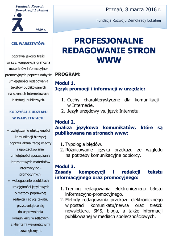 8 marca 2016 r. Rozwiązania Poznań, informatyczne Fundacja Rozwoju Demokracji Lokalnej CEL WARSZTATÓW: poprawa jakości treści wraz z kompozycją graficzną PROFESJONALNE REDAGOWANIE STRON WWW materiałów informacyjnopromocyjnych poprzez nabycie umiejętności redagowania tekstów publikowanych PROGRAM: Moduł 1. Język promocji i informacji w urzędzie: na stronach internetowych instytucji publicznych. KORZYŚCI Z UDZIAŁU W WARSZTATACH:  zwiększenie efektywności komunikacji bieżącej poprzez aktualizację wiedzy i uporządkowanie umiejętności sporządzania internetowych materiałów informacyjno promocyjnych,  wzbogacenie osobistych umiejętności językowych o metody poprawnej redakcji i edycji tekstu, przyczyniające się do usprawnienia komunikacji w relacjach z klientami wewnętrznymi i zewnętrznymi. 1. Cechy charakterystyczne dla komunikacji w Internecie. 2. Język urzędowy vs. język Internetu. Moduł 2. Analiza językowa komunikatów, publikowane na stronach www: które są 1. Typologia błędów. 2. Różnicowanie języka przekazu ze względu na potrzeby komunikacyjne odbiorcy. Moduł 3. Zasady kompozycji i redakcji informacyjnego oraz promocyjnego: tekstu 1. Trening redagowania elektronicznego tekstu informacyjno-promocyjnego. 2. Metody redagowania przekazu elektronicznego w postaci komunikatu/newsa oraz treści: newslettera, SMS, bloga, a także informacji publikowanej w mediach społecznościowych. SZKOLENIE SKIEROWANE DO: Sekretarzy, rzeczników prasowych, specjalistów ds. informacji i promocji DANE DO KONTAKTU: Fundacja Rozwoju Demokracji Lokalnej 40-014 Katowice ul. Mariacka 1 NIP: 522-000-18-95 Tel 32 259 86 73, 32 253 84 09 Fax. 32 259 86 73 w. 22, 26 e-mail: [email protected] www.okst.pl OSOBA DO KONTAKTU: Marlena Moliszewska-Gumulak tel. 32 206 80 39, 32 206 98 43 w. 29 [email protected] KOD SZKOLENIA (proszę zaznaczyć właściwy) MIEJSCE SZKOLENIA: Poznań, sale Omega, ul. Dąbrowskiego 79A, XI piętro Mapkę dojazdu do miejsca szkolenia znajdą Państwo na www.okst.pl/dojazd TERMIN SZKOLENIA: Poznań: 8 marca 2016 r., godz. 10.00 – 15.00 CENA: 349 zł netto/os. Udział w szkoleniu zwolniony z VAT w przypadku finansowania szkolenia ze środków publicznych. Cena zawiera materiały szkoleniowe, zaświadczenie o ukończeniu szkolenia, poczęstunek i serwis kawowy. ZGŁOSZENIA: Wypełnioną kartę zgłoszenia należy przesłać mailem, faksem lub poprzez formularz na www.okst.pl do 4 marca 2016 r. ☐ Poznań 3127/16P/G Nazwa nabywcy (dane do faktury) Adres nabywcy (ulica, nr domu, kod pocztowy, miejscowość) NIP Telefon Email 1. Imię i nazwisko uczestnika, stanowisko 2. Imię i nazwisko uczestnika, stanowisko 3. Imię i nazwisko uczestnika, stanowisko Oświadczam, że szkolenie dla ww. pracowników jest kształceniem zawodowym finansowanym w całości lub co najmniej 70% ze środków publicznych (proszę zaznaczyć właściwe) Członek FORUM (proszę zaznaczyć właściwe) UWAGA Ilość miejsc ograniczona. O udziale w szkoleniu decyduje kolejność zgłoszeń. Zgłoszenie na szkolenie musi zostać potwierdzone przesłaniem do Ośrodka karty zgłoszenia (mail, fax lub formularz na www.okst.pl). Brak pisemnej rezygnacji ze szkolenia najpóźniej na trzy dni robocze przed terminem szkolenia będzie równoznaczny z obciążeniem Państwa należnością za to szkolenie niezależnie od przyczyn rezygnacji. Płatność należy uregulować przelewem przed lub po szkoleniu (na przelewie prosimy podać nazwę szkolenia lub jego kod). NR RACHUNKU: BPH: 68-10600076-0000321000197618 TAK ☐ NIE ☐ TAK ☐ NIE ☐ PODPIS