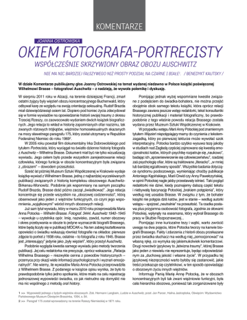 komentarze Joanna Ostrowska Okiem fotografa-portrecisty Współcześnie skrzywiony obraz obozu Auschwitz Nie ma nic bardziej fałszywego niż prosty podział na czarne i białe1. / Benedykt Kautsky / W dziale Komentarze publikujemy głos Joanny Ostrowskiej na temat wydanej niedawno w Polsce książki poświęconej Wilhelmowi Brasse – fotografowi Auschwitz – z nadzieją, że wywoła polemikę i dyskusję. W sierpniu 2011 roku w Alzacji, na terenie dzisiejszej Francji, zmarł ostatni żyjący były więzień obozu koncentracyjnego Buchenwald, który odbywał karę ze względu na swoją orientację seksualną. Rudolf Brazda miał dziewięćdziesiąt osiem lat. Dopiero pod koniec życia zdecydował się w formie wywiadów na opowiedzenie historii swojej traumy z okresu Trzeciej Rzeszy, co zaowocowało wydaniem dwóch książek biograficznych. Jego relacja to wkład w historię zapomnianych ofiar nazizmu, tak zwanych różowych trójkątów, więźniów homoseksualnych skazanych na mocy sławetnego paragrafu 175, który został utrzymany w Republice Federalnej Niemiec do roku 19692. W 2005 roku powstał film dokumentalny Irka Dobrowolskiego pod tytułem Portrecista, który wyciągał na światło dzienne historię fotografa z Auschwitz – Wilhelma Brasse. Dokument miał być nie tylko wizualizacją wywiadu. Jego celem było przede wszystkim zarejestrowanie relacji człowieka, którego funkcja w obozie koncentracyjnym była związana z „obrazem” – dowodem przeszłości. Sześć lat później Muzeum Sztuki Współczesnej w Krakowie wydaje książkę-wywiad z Wilhelmem Brasse, jedną z najbardziej wyczekiwanych publikacji związanych z historią kompleksu obozowego AuschwitzBirkenau-Monowitz. Podobnie jak wspomniany na samym początku Rudolf Brazda, Brasse dość późno zaczął „świadkować”. Jego relacja koncentruje się przede wszystkim na „obozowej codzienności”, którą obserwował jako jeden z więźniów funkcyjnych, co czyni jego wspomnienia „wyjątkowymi” wśród innych obozowych relacji. Już sam tytuł wywiadu, który w marcu 2010 roku przeprowadziła Maria Anna Potocka – Wilhelm Brasse. Fotograf. 3444. Auschwitz 1940–1945 – wywołuje u czytelnika opór. Imię, nazwisko, zawód, numer obozowy i okres przebywania w obozie to jedyne wyznaczniki biografii Brassego, które będą liczyły się w publikacji MOCAK-u. Na ten zabieg kształtowania opowieści o świadku wskazują również fotografie na okładce: pierwsze zdjęcie to portret z 1938 roku, ostatnie – to fotografia z roku 1945. Brasse jest „interesujący” jedynie jako „były więzień”, który przeżył Auschwitz. Podobnie wygląda kwestia samego wywiadu jako metody tworzenia publikacji. Jej celu redaktorka nie precyzuje, oprócz wskazania: „Relacja Wilhelma Brassego – niezwykle cenna z powodów historycznych – przemyca przy okazji wiele informacji psychologicznych i wyznań emocjonalnych”. Nie wiemy, ile wywiadów Maria Anna Potocka przeprowadziła z Wilhelmem Brasse. Z podanego w książce opisu wynika, że było to prawdopodobnie tylko jedno spotkanie, które miało na celu rejestrację jednorazowej wypowiedzi świadka, co jak nietrudno się domyślić nie ma nic wspólnego z metodą oral history. Pomijając jednak wyżej wspomniane kwestie związane z podejściem do świadka-bohatera, nie można przejść obojętnie obok samego tekstu książki, która oprócz relacji Brassego zawiera jeszcze wstęp redaktorki, tekst konsultantki historycznej publikacji i materiał fotograficzny, bo prawdopodobnie z tego właśnie powodu relacja Brassego została wydana przez Muzeum Sztuki Współczesnej w Krakowie. W przypadku wstępu Marii Anny Potockiej pod znamiennym tytułem Więzień niepotępiający mamy do czynienia z tekstemzagadką, który po pierwszej lekturze może wywołać szok interpretacyjny. Potocka bardzo szybko wysuwa tezę jakoby w studiach nad Zagładą częściej zajmowano się kwestią emocjonalności katów, których psychikę rozpatruje się „naukowo”, badając ich „sprzeniewierzenie się człowieczeństwu”, rzadziej zaś psychologię ofiar, które są traktowane „literacko”, „w mniej lub bardziej egzaltowany sposób”. Wszystkie badania dotyczące syndromu poobozowego, wymieniając choćby publikacje Antoniego Kępińskiego, Marii Orwid czy Anny Pawełczyńskiej, w opinii Potockiej nagle jakby przestawały istnieć. Taki pogląd redaktorki nie dziwi, kiedy poznajemy dalszą część tekstu i niebywałą fascynację Potockiej „brakiem potępienia”, który według niej uosabia Brasse. W związku z tym, że bohater książki nie potępia dziś katów, jest w stanie – według autorki wstępu – spojrzeć „neutralnie” na przeszłość. Ta rzadka postawa plus przyjemna osobowość fotografa, zgodnie ze słowami Potockiej, wpłynęły na esesmana, który wybrał Brassego do pracy w Służbie Rozpoznawczej... Pomijając inne kuriozalne tezy i wątki, warto zwrócić uwagę na dwa pojęcia, które Potocka tworzy na kanwie biografii Brassego. Fakty i zdarzenia z historii obozu przekazane przez świadka słuchacz ma według niej „zemocjonować” na własną rękę, co wymyka się jakiemukolwiek komentarzowi. Drugi nowotwór językowy to „łatwizna traumy”, której Brasse jako jeden z niewielu nie reprezentuje, będąc odpowiedzialnym za „duchową jakość i własne życie”. W przypadku tej językowej niezręczności warto byłoby się zastanowić, jakie treści przekazuje się czytelnikowi, w ten sposób opowiadając o obozowym życiu innych więźniów. Informuję Panią Marię Annę Potocką, że w obozach koncentracyjnych byli tak zwani więźniowie funkcyjni, była cała hierarchia obozowa, ponieważ tak zorganizowane były 1 >> Wypowiedź jednego z byłych więźniów obozowych. Zob. Hermann Langbein, Ludzie w Auschwitz, przeł. Jan Parcer, Halina Jastrzębska, Oświęcim: Wydawnictwo Państwowego Muzeum Oświęcim-Brzezinka, 1994, s. 84