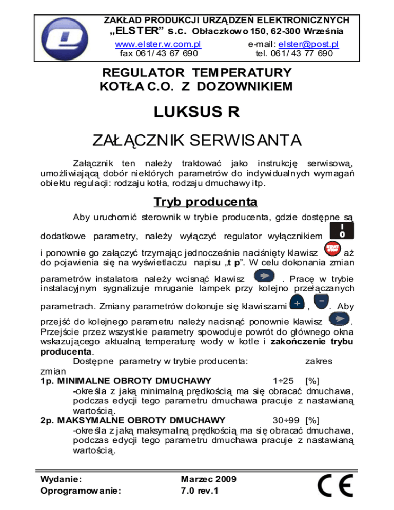 ZAKŁAD PRODUKCJI URZĄDZEŃ ELEKTRONICZNYCH „ELSTER” s.c. Obłaczkow o 150, 62-300 Września www.elster.w.com.pl e-mail: [email protected] fax 061/ 43 67 690 tel. 061/ 43 77 690 REGULATOR TEMPERATURY KOTŁA C.O. Z DOZOWNIKIEM LUKSUS R ZAŁĄCZNIK SERWISANTA Załącznik ten należy traktować jako instrukcję serwisową, umożliwiającą dobór niektórych parametrów do indywidualnych wymagań obiektu regulacji: rodzaju kotła, rodzaju dmuchawy itp. Tryb producenta Aby uruchomić sterownik w trybie producenta, gdzie dostępne są dodatkowe parametry, należy wyłączyć regulator wyłącznikiem i ponownie go załączyć trzymając jednocześnie naciśnięty klawisz aż do pojawienia się na wyświetlaczu napisu „t p”. W celu dokonania zmian parametrów instalatora należy wcisnąć klawisz . Pracę w trybie instalacyjnym sygnalizuje mruganie lampek przy kolejno przełączanych parametrach. Zmiany parametrów dokonuje się klawiszami , . Aby przejść do kolejnego parametru należy nacisnąć ponownie klawisz . Przejście przez wszyst kie parametry spowoduje powrót do głównego okna wskazującego aktualną temperaturę wody w kotle i zakończenie trybu producenta. Dostępne parametry w trybie producenta: zakres zmian 1p. MINIMALNE OBROTY DMUCHAWY 1÷25 [%] -okre śla z jaką minimalną prędkością ma się obracać dmuchawa, podczas edycji tego parametru dmuchawa pracuje z nastawianą wartością. 2p. MAKSYMALNE OBROTY DMUCHAWY 30÷99 [%] -okre śla z jaką maksymalną prędkością ma się obracać dmuchawa, podczas edycji tego parametru dmuchawa pracuje z nastawianą wartością. Wydanie: Oprogramow anie: Marzec 2009 7.0 rev.1 3p. CZAS WYGASZANIA 1÷99 [min] - jeżeli temperatura płaszcza spadnie o 3C poniżej TEMPERATURY ZAŁĄCZENIA POMPY nastąpi rozpoczęcie odliczania tego czasu. Po upływie CZASU WYGASZANIA nastąpi automatyczne przejście regulatora do trybu WYGASZANIA. 4p. MINIMALNA TEMPERATURA ZADANA 35÷53 [C] - minimalna temperatura płaszcza z jaką piec może być eksploatowany. Określana przez producenta. 5p. RODZAJ WYŚWIETLANEGO KOMUNIKATU 0 /1 określa jaki komunikat będzie wyświetlany po wciśnięciu klawisza : - 0 – wyświetlany będzie stan styków termostatu pokojowego: on, off, - 1 – wyświetlana będzie aktualna temperatura zadana kotła. Parametry te przystosowują regulator do współpracy z danym piecem. Producent pieca jest zobowiązany uzgodnić nastawy fabryczne tych parametrów z producentem regulatora. Przywrócić je można wyłączając regulator i trzymając naciśnięte klawisze do sieci. i załączyć Nastawy domyślne producenta Nr Nazwa parametru Zakres zmian 1p MINIMALNE OBROTY DMUCHAWY 1÷25 [%] Nastaw a producent a 20 2p MAKSYMALNE OBROTY DMUCHAWY 30÷99 [%] 70 3p CZAS WYGASZANIA 1÷99 [min] 20 4p MINIMALNA TEMPERATURA ZADANA 35÷53 [C] 40 5p RODZAJ WYSWIETLANEGO KOMUNIK. 0 /1 0