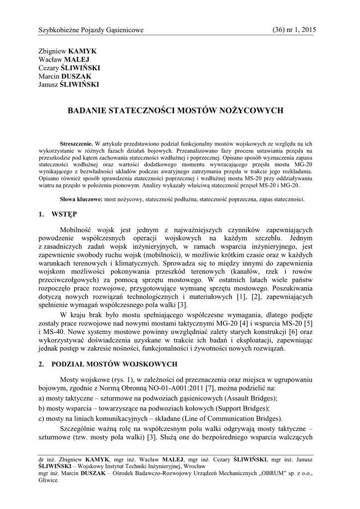 Szybkobiene Pojazdy Gsienicowe (36) nr 1,2015 2015 (36) nr 1, rok 129 Zbigniew KAMYK Wacław MALEJ Cezary LIWISKI Marcin DUSZAK Janusz LIWISKI BADANIE STATECZNOCI MOSTÓW NOYCOWYCH Streszczenie. W artykule przedstawiono podział funkcjonalny mostów wojskowych ze wzgldu na ich wykorzystanie w rónych fazach działa bojowych. Przeanalizowano fazy procesu ustawiania przsła na przeszkodzie pod ktem zachowania statecznoci wzdłunej i poprzecznej. Opisano sposób wyznaczenia zapasu statecznoci wzdłunej oraz wartoci dodatkowego momentu wywracajcego przsła mostu MG-20 wynikajcego z bezwładnoci układów podczas awaryjnego zatrzymania przsła w trakcie jego rozkładania. Opisano równie sposób sprawdzenia statecznoci poprzecznej i wzdłunej mostu MS-20 przy oddziaływaniu wiatru na przsło w połoeniu pionowym. Analizy wykazały właciw stateczno przseł MS-20 i MG-20. Słowa kluczowe: most noycowy, stateczno podłuna, stateczno poprzeczna, zapas statecznoci. 1. WSTP Mobilno wojsk jest jednym z najwaniejszych czynników zapewniajcych powodzenie współczesnych operacji wojskowych na kadym szczeblu. Jednym z zasadniczych zada wojsk inynieryjnych, w ramach wsparcia inynieryjnego, jest zapewnienie swobody ruchu wojsk (mobilnoci), w moliwie krótkim czasie oraz w kadych warunkach terenowych i klimatycznych. Sprowadza si to midzy innymi do zapewnienia wojskom moliwoci pokonywania przeszkód terenowych (kanałów, rzek i rowów przeciwczołgowych) za pomoc sprztu mostowego. W ostatnich latach wiele pastw rozpoczło prace rozwojowe, przygotowujce wymian sprztu mostowego. Poszukiwania dotycz nowych rozwiza technologicznych i materiałowych [1], [2], zapewniajcych spełnienie wymaga współczesnego pola walki [3]. W kraju brak było mostu spełniajcego współczesne wymagania, dlatego podjte zostały prace rozwojowe nad nowymi mostami taktycznymi MG-20 [4] i wsparcia MS-20 [5] i MS-40. Nowe systemy mostowe powinny uwzgldnia zalety starych konstrukcji [6] oraz wykorzystywa dowiadczenia uzyskane w trakcie ich bada i eksploatacji, zapewniajc jednak postp w zakresie nonoci, funkcjonalnoci i ywotnoci nowych rozwiza. 2. PODZIAŁ MOSTÓW WOJSKOWYCH Mosty wojskowe (rys. 1), w zalenoci od przeznaczenia oraz miejsca w ugrupowaniu bojowym, zgodnie z Norm Obronn NO-01-A001:2011 [7], mona podzieli na: a) mosty taktyczne – szturmowe na podwoziach gsienicowych (Assault Bridges); b) mosty wsparcia – towarzyszce na podwoziach kołowych (Support Bridges); c) mosty na liniach komunikacyjnych – składane (Line of Communication Bridges). Szczególnie wan rol na współczesnym polu walki odgrywaj mosty taktyczne – szturmowe (tzw. mosty pola walki) [3]. Słu one do bezporedniego wsparcia walczcych dr in. Zbigniew KAMYK, mgr in. Wacław MALEJ, mgr in. Cezary LIWISKI, mgr in. Janusz LIWISKI – Wojskowy Instytut Techniki Inynieryjnej, Wrocław mgr in. Marcin DUSZAK – Orodek Badawczo-Rozwojowy Urzdze Mechanicznych „OBRUM” sp. z o.o., Gliwice 130 Zbigniew KAMYK, Wacław MALEJ, Cezary LIWISKI, Marcin DUSZAK, Janusz LIWISKI pododdziałów pierwszorzutowych z przeciwnikiem. w strefie bezporedniej stycznoci ogniowej Rys. 1. Rodzaje mostów wykorzystywanych w rónych fazach działa bojowych Ze wzgldu na oddziaływanie ognia przeciwnika (bezporedni i poredni ostrzał) czas ustawiania przseł tych mostów na przeszkodzie powinien by moliwie jak najkrótszy. Bezporedni wpływ na czas i bezpieczestwo ustawiania przsła na przeszkodzie, po zatrzymaniu si pojazdu bazowego, ma szybko jego rozkładania. Wie si to z wystpowaniem duych obcie dynamicznych w czasie rozkładania i podejmowania przsła – wynikajcych z jego masy oraz innych obcie zewntrznych, wynikajcych np. z uwarunkowa atmosferycznych (podmuchów wiatru, dodatkowego obcienia błotem itp.). Dlatego na etapie projektowania, obok analiz wytrzymałociowych, kładzie si duy nacisk na prowadzenie kompleksowych analiz zagadnie zwizanych z zapasem statecznoci poprzecznej i podłunej mostów taktycznych i wsparcia. Dotyczy to wszystkich faz pracy mostu. Na potrzeby realizacji tego zagadnienia konieczna jest wiedza z zakresu zasad działania mechanizmów mostów i znajomo zjawisk towarzyszcych układaniu przseł mostowych. Szczególnie wane jest posiadanie informacji dotyczcych wpływu bezwładnoci układów hydraulicznych lub ich awarii na stateczno mostu, moliwoci wzrostu momentu wywracajcego na skutek błdnej obsługi mostu przez operatora itp. Na etapie projektowania konieczne jest uwzgldnienie wszystkich czynników majcych niekorzystny wpływ na stateczno mostu, a nastpnie na etapie bada zweryfikowanie poprawnoci przyjtych rozwiza konstrukcyjnych. Pozwala to na uzyskanie krótkiego czasu budowy mostu (wymogi taktyczne) oraz bezpiecznych warunków pracy obsługi mostu (wymogi eksploatacyjne). Właciwe poznanie moliwoci sprztu pozwala na zastosowanie zautomatyzowanych systemów sterujcych procesami układania i podejmowania przsła, w celu uzyskania maksymalnej wydajnoci sprztu, przy zachowaniu odpowiednich warunków bezpieczestwa obsługi. Systemy te na poszczególnych etapach budowy mostu mog w sposób automatyczny dokonywa regulacji wydajnoci układu hydraulicznego, co przekłada si bdzie na prdko układania i podejmowania przsła, oraz mog sygnalizowa obsłudze ewentualne odchylenie podwozia bazowego od pionu lub dokona automatycznego zatrzymania procesu układania. 3. STATECZNO MOSTÓW NOYCOWYCH Mosty układane na przeszkodzie w sposób noycowy s konstrukcjami wymagajcymi wikszego zapasu statecznoci, w stosunku do mostów wysuwanych wzdłunie, Wynika to ze zmiany wysokoci połoenia rodka cikoci przsła w trakcie układania, co powoduje zwikszenie wpływu zjawisk atmosferycznych na stabilno procesu układania. Podczas procesu układania i podejmowania mostów noycowych, konieczne jest 131 Badanie statecznoci mostów noycowych przechodzenie przsła przez róne fazy połoenia, jak przedstawiono to na rysunku 2. W trakcie gdy przsło jest usytuowane pionowo wzgldem p