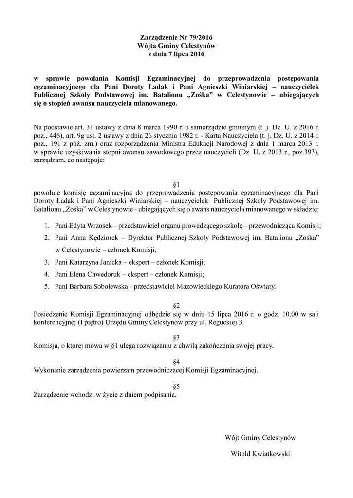 Zarządzenie Nr 79/2016 Wójta Gminy Celestynów z dnia 7 lipca 2016 w sprawie powołania Komisji Egzaminacyjnej do przeprowadzenia postępowania egzaminacyjnego dla Pani Doroty Ładak i Pani Agnieszki Winiarskiej – nauczycielek Publicznej Szkoły Podstawowej im. Batalionu „Zośka” w Celestynowie – ubiegających się o stopień awansu nauczyciela mianowanego. Na podstawie art. 31 ustawy z dnia 8 marca 1990 r. o samorządzie gminnym (t. j. Dz. U. z 2016 r. poz., 446), art. 9g ust. 2 ustawy z dnia 26 stycznia 1982 r. - Karta Nauczyciela (t. j. Dz. U. z 2014 r. poz., 191 z póź. zm.) oraz rozporządzenia Ministra Edukacji Narodowej z dnia 1 marca 2013 r. w sprawie uzyskiwania stopni awansu zawodowego przez nauczycieli (Dz. U. z 2013 r., poz.393), zarządzam, co następuje: §1 powołuje komisję egzaminacyjną do przeprowadzenia postępowania egzaminacyjnego dla Pani Doroty Ładak i Pani Agnieszki Winiarskiej – nauczycielek Publicznej Szkoły Podstawowej im. Batalionu „Zośka” w Celestynowie - ubiegających się o awans nauczyciela mianowanego w składzie: 1. Pani Edyta Wrzosek – przedstawiciel organu prowadzącego szkołę – przewodnicząca Komisji; 2. Pani Anna Kędziorek – Dyrektor Publicznej Szkoły Podstawowej im. Batalionu „Zośka” w Celestynowie – członek Komisji; 3. Pani Katarzyna Janicka – ekspert – członek Komisji; 4. Pani Elena Chwedoruk – ekspert – członek Komisji; 5. Pani Barbara Sobolewska - przedstawiciel Mazowieckiego Kuratora Oświaty. §2 Posiedzenie Komisji Egzaminacyjnej odbędzie się w dniu 15 lipca 2016 r. o godz. 10.00 w sali konferencyjnej (I piętro) Urzędu Gminy Celestynów przy ul. Reguckiej 3. §3 Komisja, o której mowa w §1 ulega rozwiązaniu z chwilą zakończenia swojej pracy. §4 Wykonanie zarządzenia powierzam przewodniczącej Komisji Egzaminacyjnej. §5 Zarządzenie wchodzi w życie z dniem podpisania. Wójt Gminy Celestynów Witold Kwiatkowski