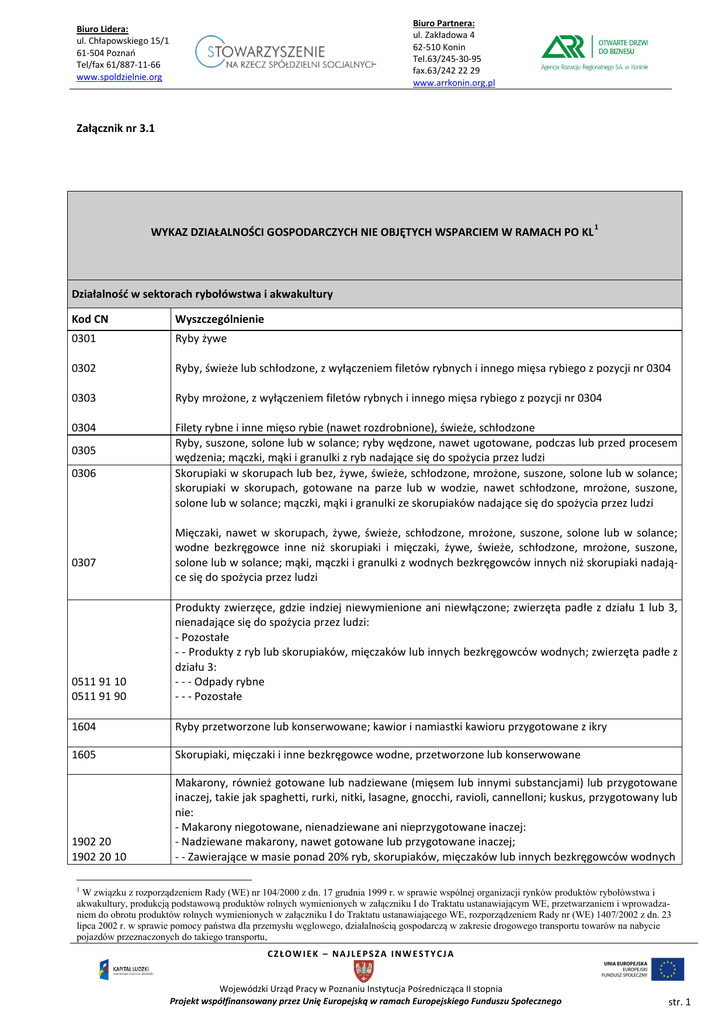 Biuro Partnera: ul. Zakładowa 4 62-510 Konin Tel.63/245-30-95 fax.63/242 22 29 www.arrkonin.org.pl Biuro Lidera: ul. Chłapowskiego 15/1 61-504 Poznań Tel/fax 61/887-11-66 www.spoldzielnie.org Załącznik nr 3.1 WYKAZ DZIAŁALNOŚCI GOSPODARCZYCH NIE OBJĘTYCH WSPARCIEM W RAMACH PO KL 1 Działalność w sektorach rybołówstwa i akwakultury Kod CN Wyszczególnienie 0301 Ryby żywe 0302 Ryby, świeże lub schłodzone, z wyłączeniem filetów rybnych i innego mięsa rybiego z pozycji nr 0304 0303 Ryby mrożone, z wyłączeniem filetów rybnych i innego mięsa rybiego z pozycji nr 0304 0304 Filety rybne i inne mięso rybie (nawet rozdrobnione), świeże, schłodzone Ryby, suszone, solone lub w solance; ryby wędzone, nawet ugotowane, podczas lub przed procesem wędzenia; mączki, mąki i granulki z ryb nadające się do spożycia przez ludzi Skorupiaki w skorupach lub bez, żywe, świeże, schłodzone, mrożone, suszone, solone lub w solance; skorupiaki w skorupach, gotowane na parze lub w wodzie, nawet schłodzone, mrożone, suszone, solone lub w solance; mączki, mąki i granulki ze skorupiaków nadające się do spożycia przez ludzi 0305 0306 0307 Mięczaki, nawet w skorupach, żywe, świeże, schłodzone, mrożone, suszone, solone lub w solance; wodne bezkręgowce inne niż skorupiaki i mięczaki, żywe, świeże, schłodzone, mrożone, suszone, solone lub w solance; mąki, mączki i granulki z wodnych bezkręgowców innych niż skorupiaki nadające się do spożycia przez ludzi 0511 91 10 0511 91 90 Produkty zwierzęce, gdzie indziej niewymienione ani niewłączone; zwierzęta padłe z działu 1 lub 3, nienadające się do spożycia przez ludzi: - Pozostałe - - Produkty z ryb lub skorupiaków, mięczaków lub innych bezkręgowców wodnych; zwierzęta padłe z działu 3: - - - Odpady rybne - - - Pozostałe 1604 Ryby przetworzone lub konserwowane; kawior i namiastki kawioru przygotowane z ikry 1605 Skorupiaki, mięczaki i inne bezkręgowce wodne, przetworzone lub konserwowane 1902 20 1902 20 10 Makarony, również gotowane lub nadziewane (mięsem lub innymi substancjami) lub przygotowane inaczej, takie jak spaghetti, rurki, nitki, lasagne, gnocchi, ravioli, cannelloni; kuskus, przygotowany lub nie: - Makarony niegotowane, nienadziewane ani nieprzygotowane inaczej: - Nadziewane makarony, nawet gotowane lub przygotowane inaczej; - - Zawierające w masie ponad 20% ryb, skorupiaków, mięczaków lub innych bezkręgowców wodnych W związku z rozporządzeniem Rady (WE) nr 104/2000 z dn. 17 grudnia 1999 r. w sprawie wspólnej organizacji rynków produktów rybołówstwa i akwakultury, produkcją podstawową produktów rolnych wymienionych w załączniku I do Traktatu ustanawiającym WE, przetwarzaniem i wprowadzaniem do obrotu produktów rolnych wymienionych w załączniku I do Traktatu ustanawiającego WE, rozporządzeniem Rady nr (WE) 1407/2002 z dn. 23 lipca 2002 r. w sprawie pomocy państwa dla przemysłu węglowego, działalnością gospodarczą w zakresie drogowego transportu towarów na nabycie pojazdów przeznaczonych do takiego transportu, 1 CZŁOWIEK – NAJLEPSZA INWESTYCJA Wojewódzki Urząd Pracy w Poznaniu Instytucja Pośrednicząca II stopnia Projekt współfinansowany przez Unię Europejską w ramach Europejskiego Funduszu Społecznego str. 1 Wspólna praca Nas wzbogaca ! Mączki, mąki i granulki z mięsa lub podrobów mięsnych, z ryb, skorupiaków, mięczaków lub innych bezkręgowców wodnych, nienadające się do spożycia przez ludzi; skwarki: - Mączki, mąki i granulki z ryb, skorupiaków, mięczaków lub innych bezkręgowców wodnych 2301 20 00 Odniesienie produktów wymienionych powyżej do Polskiej Klasyfikacji Działalności Podklasa PKD Wyszczególnienie: 03.11.Z Rybołówstwo w wodach morskich − połowy ryb na oceanach, morzach i w wewnętrznych wodach morskich, − połowy skorupiaków i mięczaków morskich, − połowy zwierząt wodnych: żółwi, osłonic, jeżowców itp., − działalność statków rybackich prowadzących połowy ryb i innych organizmów wodnych połączone z ich przetwórstwem i konserwowaniem, Z wyłączeniem: − wielorybnictwa, − pozyskiwania (poławiania, wydobywania) pozostałych produktów i organizmów znajdujących się w wodach morskich, np.: pereł naturalnych, gąbek, korali i alg, − działalności usługowej związanej z połowem ryb na oceanach, morzach i w wewnętrznych wodach morskich. 03.12.Z Rybołówstwo w wodach śródlądowych − połowy ryb w wodach śródlądowych, − połowy skorupiaków i mięczaków w wodach śródlądowych, Z wyłączeniem: − połowów pozostałych organizmów wodnych w wodach śródlądowych, − pozyskiwania surowców znajdujących się w wodach śródlądowych, − działalności usługowej związanej z połowem ryb w wodach śródlądowych. 03.21.Z Chów i hodowla ryb oraz pozostałych organizmów wodnych w wodach morskich − chów i hodowla ryb w wodach morskich, włączając chów i hodowlę morskich ryb ozdobnych, − chów i hodowla skorupiaków, małż, innych mięczaków oraz pozostałych organizmów wodnych w wodach morskich, − chów i hodowla ryb i pozostałych organizmów wodnych w wodach słonawych, − chów i hodowla ryb i pozostałych organizmów morskich w akwenach i zbiornikach ze słoną wodą, − działalność wylęgarni ryb w wodach morskich, Z wyłączeniem: − produkcji jaj małż (omułków, ostryg itp.), larw homarów, krewetek po okresie larwowym, narybku i podrostków narybku, − chowu i hodowli szkarłatnic i pozostałych jadalnych wodorostów morskich, − chowu i hodowli robaków morskich. 03.22.Z Chów i hodowla ryb oraz pozostałych organizmów wodnych w wodach śródlądowych − chów i hodowlę ryb w stawach rybnych i wodach śródlądowych, włączając chów i hodowlę ryb ozdobnych w stawach rybnych i w wodach śródlądowych, − chów i hodowlę skorupiaków, małży, innych mięczaków oraz pozostałych organizmów wodnych w wodach śr