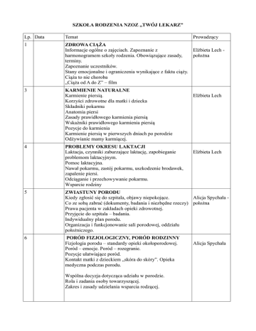 SZKOŁA RODZENIA NZOZ „TWÓJ LEKARZ” Prowadzący Lp. Data Temat 1 ZDROWA CIĄŻA Informacje ogólne o zajęciach. Zapoznanie z Elżbieta Lech harmonogramem szkoły rodzenia. Obowiązujące zasady, położna terminy. Zapoznanie uczestników. Stany emocjonalne i ograniczenia wynikające z faktu ciąży. Ciąża to nie choroba „Ciąża od A do Z” – film 3 KARMIENIE NATURALNE Karmienie piersią. Korzyści zdrowotne dla matki i dziecka Składniki pokarmu Anatomia piersi Zasady prawidłowego karmienia piersią Wskaźniki prawidłowego karmienia piersią Pozycje do karmienia Karmienie piersią w pierwszych dniach po porodzie Odżywianie mamy karmiącej. 4 PROBLEMY OKRESU LAKTACJI Laktacja, czynniki zaburzające laktację, zapobieganie problemom laktacyjnym. Pomoc laktacyjna. Nawał pokarmu, zastój pokarmu, uszkodzenie brodawek, zapalenie piersi. Odciąganie i przechowywanie pokarmu. Wsparcie rodziny Elżbieta Lech Elżbieta Lech 5 ZWIASTUNY PORODU Kiedy zgłosić się do szpitala, objawy niepokojące. Alicja Spychała Co ze sobą zabrać (dokumenty, badania i niezbędne rzeczy) położna Prawa pacjenta w zakładach opieki zdrowotnej. Przyjęcie do szpitala – badania. Indywidualny plan porodu. Organizacja i funkcjonowanie sali porodowej, oddziału położniczego. 6 PORÓD FIZJOLOGICZNY, PORÓD RODZINNY Fizjologia porodu – standardy opieki okołoporodowej. Poród – emocje. Poród – rozegranie. Pozycje ułatwiające poród. Kontakt matki z dzieckiem „skóra do skóry”. Opieka medyczna podczas porodu. Wspólna decyzja dotycząca udziału w porodzie. Rola i zadania osoby towarzyszącej. Zakres i zasady udzielania wsparcia rodzącej. Alicja Spychała 7 PORÓD AKTYWNY PORÓD ZABIEGOWY Przygotowanie ciężarnej do świadomego i aktywnego uczestniczenia w porodzie. Poród aktywny, – co to jest? Korzyści dla matki i dziecka wynikające z aktywnego rodzenia. Pozycje stosowane w 1 i 2 okresie porodu. Czy poród musi boleć? Znieczulenie podczas porodu. Środki łagodzące ból porodowy. Cesarka „na życzenie” - zalety i wady cięcia cesarskiego. Alicja Spychała 8 POŁÓG Połóg. Elżbieta Lech Opieka nad położnicą i noworodkiem – przychodnia rejonowa. Rola i zadania położnej środowiskowo – rodzinnej POZ w opiece nad matką i dzieckiem. Problemy emocjonalne w okresie poporodowym, sposoby radzenia sobie z nimi. Zmiany ogólnoustrojowe. Pielęgnacja piersi, krocza, rany po porodzie naturalnym i cięciu cesarskim. 9 SZCZEPIENIA DZIECKA Wszystko o szczepieniach. Pierwsza wizyta z dzieckiem u lekarza, – o czym warto pamiętać. Kiedy konieczna jest wizyta u pediatry? Pytania uczestników. Beata Ruszel pielęgniarka 10 Elżbieta Lech PIERWSZE DNI ŻYCIA DZIECKA Noworodek po porodzie – stany adaptacyjne Fizjologia okresu noworodkowego. Adaptacja do nowych warunków. Skala Apgar, Pierwsze badanie w szpitalu. Odruchy noworodkowe. Stolce, żółtaczka fizjologiczna, szczepienia. Profilaktyka chorób infekcyjnych wieku rozwojowego. Fizjologiczny spadek masy ciała. Profilaktyka stawów biodrowych. Opieka nad noworodkiem w szpitalu. 11 KĄPIEL I PIELĘGNACJA NOWORODKA Przygotowanie miejsca do kąpieli: akcesoria, technika Elżbieta Lech kąpieli, środki do pielęgnacji. Pielęgnacja: pępka, zmian skórnych, oczu, nosa, pośladków, narządów płciowych, paznokci. Zmiana pieluchy, ulewanie, czkawka. Werandowanie, spacery. Układanie dziecka do snu. Zmysły noworodka. Płacz dziecka, jako forma komunikowania się. Zakończenie – wręczenie certyfikatów.