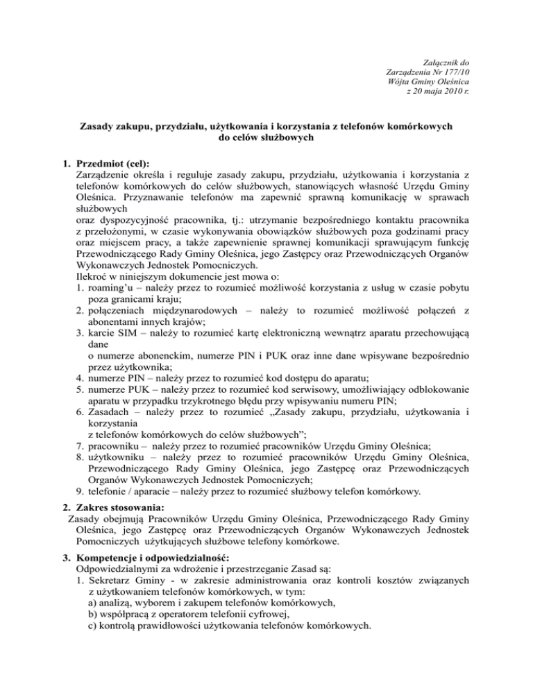 Załącznik do Zarządzenia Nr 177/10 Wójta Gminy Oleśnica z 20 maja 2010 r. Zasady zakupu, przydziału, użytkowania i korzystania z telefonów komórkowych do celów służbowych 1. Przedmiot (cel): Zarządzenie określa i reguluje zasady zakupu, przydziału, użytkowania i korzystania z telefonów komórkowych do celów służbowych, stanowiących własność Urzędu Gminy Oleśnica. Przyznawanie telefonów ma zapewnić sprawną komunikację w sprawach służbowych oraz dyspozycyjność pracownika, tj.: utrzymanie bezpośredniego kontaktu pracownika z przełożonymi, w czasie wykonywania obowiązków służbowych poza godzinami pracy oraz miejscem pracy, a także zapewnienie sprawnej komunikacji sprawującym funkcję Przewodniczącego Rady Gminy Oleśnica, jego Zastępcy oraz Przewodniczących Organów Wykonawczych Jednostek Pomocniczych. Ilekroć w niniejszym dokumencie jest mowa o: 1. roaming’u – należy przez to rozumieć możliwość korzystania z usług w czasie pobytu poza granicami kraju; 2. połączeniach międzynarodowych – należy to rozumieć możliwość połączeń z abonentami innych krajów; 3. karcie SIM – należy to rozumieć kartę elektroniczną wewnątrz aparatu przechowującą dane o numerze abonenckim, numerze PIN i PUK oraz inne dane wpisywane bezpośrednio przez użytkownika; 4. numerze PIN – należy przez to rozumieć kod dostępu do aparatu; 5. numerze PUK – należy przez to rozumieć kod serwisowy, umożliwiający odblokowanie aparatu w przypadku trzykrotnego błędu przy wpisywaniu numeru PIN; 6. Zasadach – należy przez to rozumieć „Zasady zakupu, przydziału, użytkowania i korzystania z telefonów komórkowych do celów służbowych”; 7. pracowniku – należy przez to rozumieć pracowników Urzędu Gminy Oleśnica; 8. użytkowniku – należy przez to rozumieć pracowników Urzędu Gminy Oleśnica, Przewodniczącego Rady Gminy Oleśnica, jego Zastępcę oraz Przewodniczących Organów Wykonawczych Jednostek Pomocniczych; 9. telefonie / aparacie – należy przez to rozumieć służbowy telefon komórkowy. 2. Zakres stosowania: Zasady obejmują Pracowników Urzędu Gminy Oleśnica, Przewodniczącego Rady Gminy Oleśnica, jego Zastępcę oraz Przewodniczących Organów Wykonawczych Jednostek Pomocniczych użytkujących służbowe telefony komórkowe. 3. Kompetencje i odpowiedzialność: Odpowiedzialnymi za wdrożenie i przestrzeganie Zasad są: 1. Sekretarz Gminy - w zakresie administrowania oraz kontroli kosztów związanych z użytkowaniem telefonów komórkowych, w tym: a) analizą, wyborem i zakupem telefonów komórkowych, b) współpracą z operatorem telefonii cyfrowej, c) kontrolą prawidłowości użytkowania telefonów komórkowych. 2. Inspektor ds. administracyjnych - w zakresie zawierania umów użyczenia telefonów oraz tworzeniem dokumentacji dla każdego telefonu (przydział telefonu komórkowego); 3. Użytkownicy – w zakresie użytkowania i korzystania z telefonów. 4. Postępowanie dotyczące przydziału telefonu / przyjęcia aparatu od użytkownika: 1. Zasady przydziału telefonów komórkowych: a) telefon może otrzymać ten Użytkownik, dla którego jest on niezbędnym narzędziem do wykonywania pracy na rzecz Urzędu / Gminy oraz sprawowania funkcji, b) telefon zostaje przydzielony Użytkownikowi „Protokołem przekazania sprzętu”, którego wzór stanowi załącznik nr 2 do niniejszych Zasad, przy czym przekazującym jest Sekretarz Gminy, a przyjmującym Użytkownik. „Protokół przekazania sprzętu” sporządza się w dwóch egzemplarzach: jeden dla Użytkownika, jeden dla Sekretarza Gminy, c) Inspektor ds. administracyjnych na podstawie „Protokołu przekazania sprzętu” sporządza „Umowę użyczenia telefonu”, której wzór stanowi załącznik nr 1 do niniejszych Zasad. 2. Przyjęcie telefonu od Użytkownika: a) przyjęcie telefonu od jego dotychczasowego Użytkownika odbywa się w oparciu o formularz „Protokołu przyjęcia sprzętu”, którego wzór stanowi załącznik nr 2 do niniejszych Zasad, przy czym przekazującym jest Użytkownik, a przyjmującym Sekretarz Gminy, b) Użytkownik, który stracił prawo do korzystania z telefonu, zwraca aparat w opakowaniu producenta, wraz z kartą SIM oraz pełnym dodatkowym wyposażeniem, instrukcją obsługi oraz kartą gwarancyjną. 5. Zasady użytkowania telefonów: 1. Telefon powinien być używany wyłącznie do celów służbowych. 2. Pracownik posiadający do dyspozycji zarówno telefon komórkowy jak i stacjonarny rozmowy z użytkownikami telefonów komórkowych prowadzi wyłącznie z telefonu komórkowego. 3. Telefon musi być używany zgodnie z instrukcją obsługi. Użytkownik powinien niezwłocznie informować Sekretarza Gminy o wszelkich uszkodzeniach, awariach, zagubieniu lub kradzieży i działać zgodnie ze wskazówkami Sekretarza Gminy. 4. W zakresie połączeń międzynarodowych i roaming’u Użytkownik winien otrzymać zgodę Wójta Gminy. 5. Za utrzymanie telefonów komórkowych w należytym stanie odpowiadają ich użytkownicy. 6. Ewentualny koszt naprawy dokonywany jest przez Urząd Gminy. Koszty samodzielnych napraw, tj. dokonywanych bez uzgodnienia z Sekretarzem Gminy, nie będą pokrywane przez Urząd Gminy. Urząd nie będzie ponosił kosztów napraw telefonów uszkodzonych na skutek niewłaściwego użytkowania bądź mechanicznego uszkodzenia, co będzie potwierdzone protokołem z naprawy. W przypadku niemożności naprawy telefonu komórkowego winien on zostać zlikwidowany, po uprzednim otrzymaniu potwierdzenia, że telefon nie nadaje się do dalszego użytkowania. 7. W przypadku kradzieży telefonu komórkowego Użytkownik zobowiązany jest do skontaktowania się z Sekretarzem Gminy w celu zablokowania numeru u operatora lub w przypadku braku takiej możliwości użytkownik zobowiązany jest do samodzielnego niezwłocznego zablokowania numeru u operatora. W każdym przypadku użytkownik ma obowiązek niezwłocznego zgło