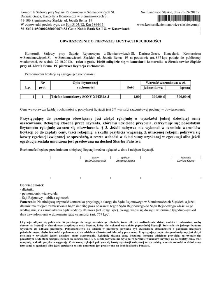 Komornik Sądowy przy Sądzie Rejonowym w Siemianowicach Śl. Dariusz Graca, Kancelaria Komornicza w Siemianowicach Śl. 41-106 Siemianowice Śląskie, ul. Józefa Bema 19 W odpowiedzi podać: sygn. akt Km 3103/12, Km 3864/13 56156011080000935000067453 Getin Noble Bank SA I O. w Katowicach Siemianowice Śląskie, dnia 25-09-2013 r. *6013092500652* www.komornik.siemianowice-slaskie.com.pl | | OBWIESZCZENIE O PIERWSZEJ LICYTACJI RUCHOMOŚCI Komornik Sądowy przy Sądzie Rejonowym w Siemianowicach Śl. Dariusz Graca, Kancelaria Komornicza w Siemianowicach Śl. w Siemianowicach Śląskich ul. Józefa Bema 19 na podstawie art. 867 kpc podaje do publicznej wiadomości, że w dniu 22.10.2013r. roku o godz. 10:00 odbędzie się w kancelarii komornika w Siemianowice Śląskie przy ul. Józefa Bema 19 pierwsza licytacja ruchomości. Przedmiotem licytacji są następujące ruchomości: Nr prot. L.p. 1 1 Opis licytowanej ruchomości ilość Telefon komórkowy SONY XPERIA J 1,00 Wartość szacunkowa w zł. jednostkowa łączna 300,00 zł 300,00 zł Ceną wywoławczą każdej ruchomości w powyższej licytacji jest 3/4 wartości szacunkowej podanej w obwieszczeniu. Przystępujący do przetargu obowiązany jest złożyć rękojmię w wysokości jednej dziesiątej sumy oszacowania. Rękojmię złożoną przez licytanta, któremu udzielono przybicia, zatrzymuje się; pozostałym licytantom rękojmię zwraca się niezwłocznie. § 3. Jeżeli nabywca nie wykonał w terminie warunków licytacji co do zapłaty ceny, traci rękojmię, a skutki przybicia wygasają. Z utraconej rękojmi pokrywa się koszty egzekucji związanej ze sprzedażą, a reszta wchodzi w skład sumy uzyskanej w egzekucji albo jeżeli egzekucja została umorzona jest przelewana na dochód Skarbu Państwa. Ruchomości będące przedmiotem niniejszej licytacji można oglądać w dniu i miejscu licytacji. asesor aplikant komornik Rafał Sokołowski Zuzanna Krupa Dariusz Graca Do wiadomości: - dłużnik; - pełnomocnik wierzyciela; - Sąd Rejonowy - tablica ogłoszeń Pouczenie: Na niniejszą czynność komornika przysługuje skarga do Sądu Rejonowego w Siemianowicach Śląskich, a jeżeli dłużnik ma miejsce zamieszkania bądź siedzibę poza obszarem tegoż Sądu Rejonowego do Sądu Rejonowego właściwego według miejsca zamieszkania bądź siedziby dłużnika (art.767§1 kpc). Skargę wnosi się do sądu w terminie tygodniowym od dnia zawiadomienia o dokonaniu tejże czynności (art. 767 kpc). Licytacja odbywa się publicznie. W przetargu nie mogą uczestniczyć: dłużnik, komornik, ich małżonkowie, dzieci, rodzice i rodzeństwo, osoby obecne na licytacji w charakterze urzędowym oraz licytant, który nie wykonał warunków poprzedniej licytacji. Stawienie się jednego licytanta wystarcza do odbycia przetargu. Pełnomocnictwo do udziału w przetargu powinno być stwierdzone dokumentem z podpisem urzędowo poświadczonym, chyba że chodzi o pełnomocnictwo udzielone adwokatowi lub radcy prawnemu. Przystępujący do przetargu obowiązany jest złożyć rękojmię w wysokości jednej dziesiątej sumy oszacowania. Rękojmię złożoną przez licytanta, któremu udzielono przybicia, zatrzymuje się; pozostałym licytantom rękojmię zwraca się niezwłocznie. § 3. Jeżeli nabywca nie wykonał w terminie warunków licytacji co do zapłaty ceny, traci rękojmię, a skutki przybicia wygasają. Z utraconej rękojmi pokrywa się koszty egzekucji związanej ze sprzedażą, a reszta wchodzi w skład sumy uzyskanej w egzekucji albo jeżeli egzekucja została umorzona jest przelewana na dochód Skarbu Państwa.