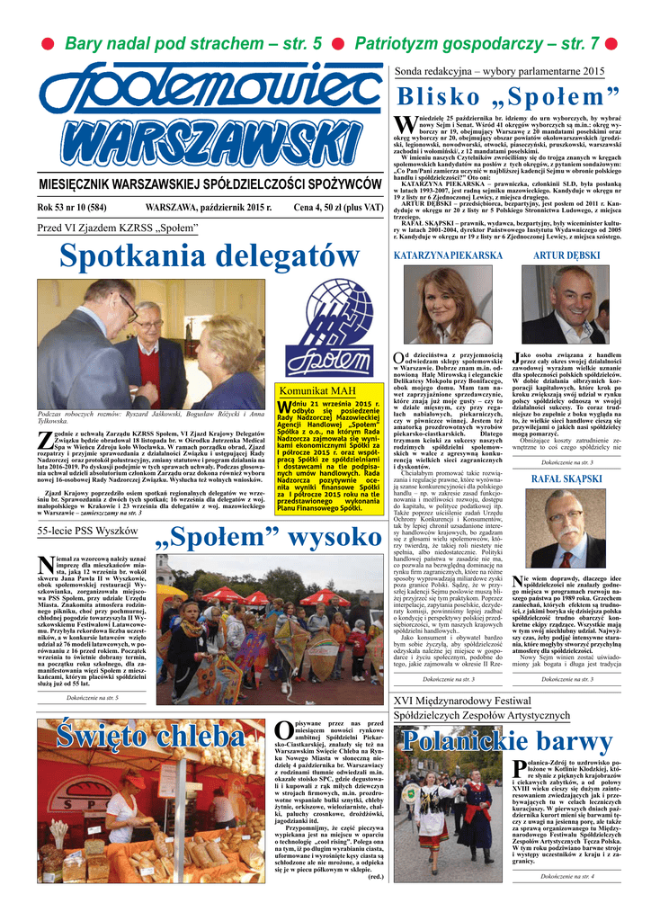 l Bary nadal pod strachem – str. 5 l Patriotyzm gospodarczy – str. 7 l Sonda redakcyjna – wybory parlamentarne 2015 Blisko „Społem” W MIESIĘCZNIK WARSZAWSKIEJ SPÓŁDZIELCZOŚCI SPOŻYWCÓW Rok 53 nr 10 (584) WARSZAWA, październik 2015 r. Cena 4, 50 zł (plus VAT) Przed VI Zjazdem KZRSS „Społem” Spotkania delegatów niedzielę 25 października br. idziemy do urn wyborczych, by wybrać nowy Sejm i Senat. Wśród 41 okręgów wyborczych są m.in.: okręg wyborczy nr 19, obejmujący Warszawę z 20 mandatami poselskimi oraz okręg wyborczy nr 20, obejmujący obszar powiatów okołowarszawskich /grodziski, legionowski, nowodworski, otwocki, piaseczyński, pruszkowski, warszawski zachodni i wołomiński/, z 12 mandatami poselskimi. W imieniu naszych Czytelników zwróciliśmy się do trojga znanych w kręgach spolemowskich kandydatów na posłów z tych okręgów, z pytaniem sondażowym: „Co Pan/Pani zamierza uczynić w najbliższej kadencji Sejmu w obronie polskiego handlu i spółdzielczości?” Oto oni: KATARZYNA PIEKARSKA – prawniczka, członkinii SLD, była posłanką w latach 1993-2007, jest radną sejmiku mazowieckiego. Kandyduje w okręgu nr 19 z listy nr 6 Zjednoczonej Lewicy, z miejsca drugiego. ARTUR DĘBSKI – przedsiębiorca, bezpartyjny, jest posłem od 2011 r. Kandyduje w okręgu nr 20 z listy nr 5 Polskiego Stronnictwa Ludowego, z miejsca trzeciego. RAFAŁ SKĄPSKI – prawnik, wydawca, bezpartyjny, były wiceminister kultury w latach 2001-2004, dyrektor Państwowego Instytutu Wydawniczego od 2005 r. Kandyduje w okręgu nr 19 z listy nr 6 Zjednoczonej Lewicy, z miejsca szóstego. O Komunikat MAH Podczas roboczych rozmów: Ryszard Jaśkowski, Bogusław Różycki i Anna Tylkowska. Z godnie z uchwałą Zarządu KZRSS Społem, VI Zjazd Krajowy Delegatów Związku będzie obradował 18 listopada br. w Ośrodku Jutrzenka Medical Spa w Wieńcu Zdroju koło Włocławka. W ramach porządku obrad, Zjazd rozpatrzy i przyjmie sprawozdania z działalności Związku i ustępującej Rady Nadzorczej oraz protokół polustracyjny, zmiany statutowe i program działania na lata 2016-2019. Po dyskusji podejmie w tych sprawach uchwały. Podczas głosowania uchwał udzieli absolutorium członkom Zarządu oraz dokona również wyboru nowej 16-osobowej Rady Nadzorczej Związku. Wysłucha też wolnych wniosków. Zjazd Krajowy poprzedziło osiem spotkań regionalnych delegatów we wrześniu br. Sprawozdania z dwóch tych spotkań; 16 września dla delegatów z woj. małopolskiego w Krakowie i 23 września dla delegatów z woj. mazowieckiego w Warszawie – zamieszczamy na str. 3 55-lecie PSS Wyszków N dniu 21 września 2015 r. W odbyło się posiedzenie Rady Nadzorczej Mazowieckiej Agencji Handlowej „Społem” Spółka z o.o., na którym Rada Nadzorcza zajmowała się wynikami ekonomicznymi Spółki za I półrocze 2015 r. oraz współpracą Spółki ze spółdzielniami i dostawcami na tle podpisanych umów handlowych. Rada Nadzorcza pozytywnie oceniła wyniki finansowe Spółki za I półrocze 2015 roku na tle przedstawionego wykonania Planu Finansowego Spółki. „Społem” wysoko iemal za wzorcową należy uznać imprezę dla mieszkańców miasta, jaką 12 września br. wokół skweru Jana Pawła II w Wyszkowie, obok społemowskiej restauracji Wyszkowianka, zorganizowała miejscowa PSS Społem, przy udziale Urzędu Miasta. Znakomita atmosfera rodzinnego pikniku, choć przy pochmurnej, chłodnej pogodzie towarzyszyła II Wyszkowskiemu Festiwalowi Latawcowemu. Przybyła rekordowa liczba uczestników, a w konkursie latawców wzięło udział aż 76 modeli latawcowych, w porównaniu z 16 przed rokiem. Początek września to świetnie dobrany termin, na początku roku szkolnego, dla zamanifestowania więzi Społem z mieszkańcami, którym placówki spółdzielni służą już od 55 lat. ARTUR DĘBSKI KATARZYNA PIEKARSKA d dzieciństwa z przyjemnością odwiedzam sklepy społemowskie w Warszawie. Dobrze znam m.in. odnowioną Halę Mirowską i eleganckie Delikatesy Mokpolu przy Bonifacego, obok mojego domu. Mam tam nawet zaprzyjaźnione sprzedawczynie, które znają już moje gusty – czy to w dziale mięsnym, czy przy regałach nabiałowych, piekarniczych, czy w piwniczce winnej. Jestem też amatorką prozdrowotnych wyrobów piekarsko-ciastkarskich. Dlatego trzymam kciuki za sukcesy naszych rodzimych spółdzielni społemowskich w walce z agresywną konkurencją wielkich sieci zagranicznych i dyskontów. Chciałabym promować takie rozwiązania i regulacje prawne, które wyrównają szanse konkurencyjności dla polskiego handlu – np. w zakresie zasad funkcjonowania i możliwości rozwoju, dostępu do kapitału, w polityce podatkowej itp. Także poprzez uściślenie zadań Urzędu Ochrony Konkurencji i Konsumentów, tak by lepiej chronił uzsadanione interesy handlowców krajowych, bo zgadzam się z głosami wielu spolemowców, którzy twierdzą, że takiej roli niestety nie spełnia, albo niedostatecznie. Polityki handlowej państwa w zasadzie nie ma, co pozwala na bezwględną dominację na rynku firm zagranicznych, które na różne sposoby wyprowadzają miliardowe zyski poza granice Polski. Sądzę, że w przyszłej kadencji Sejmu poslowie muszą bliżej przyjrzeć się tym praktykom. Poprzez interpelacje, zapytania poselskie, dezyderaty komisji, powinniśmy lepiej zadbać o kondycję i perspektywy polskiej przedsiębiorczości, w tym naszych krajowych spółdzielni handlowych.. Jako konsument i obywatel bardzo bym sobie życzyłą, aby spółdzielczość odzyskała należne jej miejsce w gospodarce i życiu społecznym, podobne do tego, jakie zajmowała w okresie II Rze- J ako osoba związana z handlem przez cały okres swojej działalności zawodowej wyrażam wielkie uznanie dla społeczności polskich spółdzielców. W dobie działania olbrzymich korporacji kapitałowych, które krok po kroku zwiększają swój udział w rynku polscy spółdzielcy odnoszą w swojej d