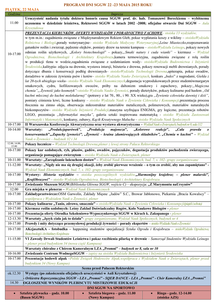 PROGRAM DNI SGGW 22 -23 MAJA 2015 ROKU PIĄTEK, 22 MAJA Godzina 11.00 10-17.00 10-17.00 10-14.00 12.00, 14.00, 15.00 10-17.00 10-11.00 11-12.00 10-17.00 10-17.00 12.00 10-17.00 10-17.00 10-17.00 10-17.00 12-13.30 10-17.00 10-17.00 Impreza Uroczystość nadania tytułu doktora honoris causa SGGW prof. dr. hab. Tomaszowi Boreckiemu – wybitnemu uczonemu w dziedzinie leśnictwa, Rektorowi SGGW w latach 2002 -2008; oficjalne otwarcie Dni SGGW – Aula Kryształowa PREZENTACJA KIERUNKÓW, OFERTY WYDZIAŁÓW I PORADNICTWO FACHOWE– stoiska 13 wydziałów, w tym m.in.: zagadnienia związane z Międzynarodowym Rokiem Gleb, pokaz wyplatania koszy z wikliny – stoiskoWydziału Rolnictwa i Biologii,porady weterynaryjne– stoisko Wydziału Medycyny Weterynaryjnej,Leśne Miasteczko,rozpoznawanie gatunków roślin i zwierząt, pędzenie olejków, pomiary drzew na terenie kampusu – stoiskoWydziału Leśnego, pokazy nowych odmian roślin użytkowych, „Kolory biotechnologii” - pokazy,„Smaki natury i cuda wianki” - kiermasz – Wydział Ogrodnictwa, Biotechnologii i Architektury Krajobrazu,kamera termowizyjna, zagadnienia związane z rolą roślin w produkcji tlenu w wodzie,zagadnienia związane z uzdatnianiem wody– stoiskoWydziału Budownictwa i Inżynierii Środowiska,kalitypia- zdjęcia na drewnie, wystawa intarsji, biżuteria z drewna, pokazy renowacji mebli drewnianych, porady dotyczące dbania i konserwacji podłóg drewnianych– stoiskoWydziału Technologii Drewna,apiterapia, pokaz owadów, doradztwo w zakresie żywienia psów i kotów– stoisko Wydziału Nauko Zwierzętach, konkurs „Index” z nagrodami, Giełda z lat 20-tych ubiegłego wieku– stoisko Wydziału Nauk Ekonomicznych,degustacja wyprodukowanych przez studentówmargaryn smakowych, cydru, liofilizowanych owoców, próby na daltonizm smakowy i zapachowy, pokazy:„Magiczna chemia”,„Żywność jako kosmetyk”–stoisko Wydziału Nauko Żywności, porady dietetyków, pokazy kulinarne pod hasłem „Od kuchni mlecznej do kuchni molekularnej” (potrawy z lat 70., 80., i 90. XX wieku),gra „Żywienie człowieka dawniej i dziś”, pomiary ciśnienia krwi, liczne konkursy – stoisko Wydziału Nauk o Żywieniu Człowieka i Konsumpcji,prezentacja procesu tłoczenia na zimno oleju, obserwacja mikrostruktur materiałów metalicznych, polimerowych, materiałów naturalnychi biokompozytów– stoisko Wydziału Inżynierii Produkcji,maszyna szyfrująca ENIGMA, gry logiczne, prezentacja robotów LEGO, prezentacja „Informatykai muzyka”, galeria sztuki inspirowana matematyką - stoisko Wydziału Zastosowań Informatyki i Matematyki, konkursy, zabawy, Kącik Kreatywnego Malucha – stoisko Wydziału Nauk Społecznych II Warszawska Konferencja Akwarystyczna oraz wystawa akwarystyczna – Wydział Nauk o Zwierzętach, budynek nr 8, sala 112 Warsztaty: „Produkcjaparówek”, „Produkcja majonezu”, „Kolorowe reakcje”, „Cała prawda o konserwantach”,„Zapachy żywności”, „Żywność – kraina zdumiewających składników”, „Chemia w kuchni” – Wydział Nauk o Żywności – budynek 32 i 34 Pokazy łucznicze – Wydział Technologii Drewna,plener z lewej strony Pałacu Rektorskiego Pokazy kur ozdobnych, ryb, płazów, gadów, owadów, pajęczaków, degustacja produktów pochodzenia zwierzęcego, organizacje pomagające zwierzętom – stoisko Wydziału Nauk o Zwierzętach, plener Warsztaty: „Zarządzanie łańcuchem dostaw” – Wydział Nauk Ekonomicznych, bud. 7, s. 102- grupy zorganizowane Warsztaty: „Nigdy nie ma się drugiej okazji, żeby zrobić pierwsze wrażenie – o tym co zrobić, aby nas zapamiętano” Wydział Nauk Ekonomicznych, bud. 7, s. 102- grupy zorganizowane Wystawy: Historia wydziałów – stoiska poszczególnych wydziałów,„Harmonijny krajobraz – plener malarski”, „KrajObrazowi” – stoisko Wydziału Ogrodnictwa, Biotechnologii i Architektury Krajobrazu Zwiedzanie Muzeum SGGW(Biblioteka Główna SGGW, wejście C) – ekspozycja: „Z Marymontu naUrsynów” Gra miejska w plenerze – Wydział Nauk Ekonomicznych Zakładyprzetwórcze:OSM Garwolin, Zakłady Mięsne „Jadów” S.C., Browar Jabłonowo, Piekarnia „Bracia Kowalscy” – współpraca z Wydziałem Nauk o Żywności, plener Pokazy kulinarne „Tanio, zdrowo, smacznie” – stoiskoWydziału Nauk o Żywieniu Człowieka i Konsumpcji(piątek i sobota) Kiermasz roślin ozdobnych: Leśny Zakład Doświadczalny Rogów, Koło Naukowe Biologów - plener Prezentacja oferty Ośrodka Szkoleniowo-Wypoczynkowego SGGW w Kirach k. Zakopanego - plener Warsztaty „Język ciała jak to działa”- grupy zorganizowane, Wydział Nauk Społecznych, budynek nr 4 Prawdy i mity dotyczące przemysłowej produkcji żywności – porady ekspertów – stoisko Wydziału Nauk o Żywności AKcjasztuKA - fotobudka – happening studentów specjalizacji Sztuka Ogrodu i Krajobrazu – stoiskoWydziału Ogrodnictwa, Biotechnologii i Architektury Krajobrazu 11-15.00 VI Zawody Drwali Studentów Leśnictwa i pokaz rzeźbienia pilarką w drewnie – Samorząd Studentów Wydziału Leśnego – plener przed budynkiem 34 (nowa część Kampusu) Warsztaty chóralne z Chórem Kameralnym LZA „Promni” – budynek nr 8, sala nr 10 10-16.00 Zwiedzanie Centrum WodnegoSGGW – zapisy na stoisku Wydziału Budownictwa i Inżynierii Środowiska 10-17.00 Prezentacja hodowli alpak –Polski Związek Hodowców Alpak,współpraca z Wydziałem Nauk o Zwierzętach, plener przed budynkiem 34 (Nowy Kampus) Scena przed Pałacem Rektorskim ok.12.30 Występy (po zakończeniu oficjalnych uroczystości w Auli Kryształowej) - Orkiestra Reprezentacyjna SGGW - LZA „Promni” - SQER DANCE - LZA „Promni” - Chór Kameralny LZA „Promni” 14.30 OGŁOSZENIE WYNIKÓW PLEBISCYTU MISTRZOWIE EDUKACJI DNI SGGW NA SPORTOWO • Sztafeta pływacka – godz. 10.00 • Sztafeta biegowa – godz. 11.00 • Ringo - godz. 12-14.00 (Basen SGGW) (Nowy Kampus) (stoisko AZS) 