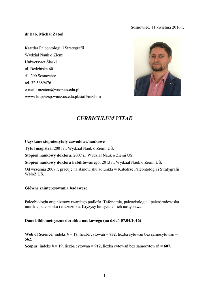 Sosnowiec, 11 kwietnia 2016 r. dr hab. Michał Zatoń Katedra Paleontologii i Stratygrafii Wydział Nauk o Ziemi Uniwersytet Śląski ul. Będzińska 60 41-200 Sosnowiec tel. 32 3689476 e-mail: [email protected] www: http://zsp.wnoz.us.edu.pl/staff/mz.htm CURRICULUM VITAE Uzyskane stopnie/tytuły zawodowe/naukowe Tytuł magistra: 2001 r., Wydział Nauk o Ziemi UŚ. Stopień naukowy doktora: 2007 r., Wydział Nauk o Ziemi UŚ. Stopień naukowy doktora habilitowanego: 2013 r., Wydział Nauk o Ziemi UŚ. Od września 2007 r. pracuje na stanowisku adiunkta w Katedrze Paleontologii i Stratygrafii WNoZ UŚ. Główne zainteresowania badawcze Paleobiologia organizmów twardego podłoża. Tafonomia, paleoekologia i paleośrodowiska morskie paleozoiku i mezozoiku. Kryzysy biotyczne i ich następstwa. Dane bibliometryczne dorobku naukowego (na dzień 07.04.2016) Web of Science: indeks h = 17, liczba cytowań = 832, liczba cytowań bez samocytowań = 562. Scopus: indeks h = 19, liczba cytowań = 912, liczba cytowań bez samocytowań = 607. 1 Nagrody, stypendia i wyróżnienia 2011 i 2013: nagrody II stopnia JM Rektora UŚ za działalność naukową. 2011: Stypendium Ministra Nauki i Szkolnictwa Wyższego dla wybitnych, młodych naukowców. 2009: Nagroda JM Rektora UŚ za wyróżniającą się rozprawę doktorską. 2006–2007: Dwukrotne stypendium dla młodych naukowców START przyznane przez Fundację na Rzecz Nauki Polskiej. Udział w projektach badawczych Kierownictwo grantów 2012–2015: Grant NCN 2011/01/B/ST10/00576: „Dynamika rozwoju organizmów twardego podłoża w świetle kryzysu biotycznego fran-famen (późny dewon) na obszarze Rosji”. 2011–2014: Grant MNiSW N N307 066040: “Koprolity jako cenne źródło informacji na temat diety, metabolizmu i środowiska pogrzebania późnotriasowych kręgowców lądowych z obszaru Polski”. Współuczestnictwo w grantach (główny wykonawca/wykonawca) 2015–2017: Grant NCN 2014/15/B/ST10/03705: „Środowiska depozycji podczas zdarzenia wczesny Alum (wczesny karbon) na południowym szelfie Laurussii w świetle zintegrowanych badań geochemicznych i paleoekologiczno-facjalnych” (kierownik grantu: dr Michał Rakociński). 2013–2017: Grant NCN N N307 117037: „Głębokomorskie środowiska dewonu jako klucz do zrozumienia globalnych perturbacji ekosystemowych” (grant Maestro, kierownik grantu: Prof. dr hab. Grzegorz Racki). 2007–2010: Grant MNiSW N N307 237933: „Zróżnicowanie taksonomiczne, charakterystyka molekularna i stabilne izotopy δ13C drewna kopalnego: paleowegetacja i paleoklimat Europy i Ameryki Południowej w jurze środkowej” (kierownik grantu: dr hab. Leszek Marynowski). Udział w kształceniu młodej kadry - opieka nad jednym doktorantem; - promotor i opiekun: 10 prac magisterskich i trzech licencjackich. 2 Funkcje z wyboru w organizacjach naukowych 2015–2019: Członek Zespołu interdyscyplinarnego do spraw programu „Mobilność Plus” przy MNiSW. 2015–2018: Członek Rady Naukowej Instytutu Paleobiologii PAN. 2014–2015: Członek paneli NCN (Preludium i Sonata). 2011–2016: Członek Akademii Młodych Uczonych PAN. 2011–2014: Członek Komitetu Nauk Geologicznych PAN. 2010–2013: Sekretarz Sekcji Paleontologicznej Polskiego Towarzystwa Geologicznego. Funkcje pełnione na Uniwersytecie Śląskim - członek rady Wydziału Nauk o Ziemi UŚ; - członek komisji ds. dorobku naukowego katedr Wydziału Nauk o Ziemi. Recenzje w przewodach doktorskich 2014: dr Piotr Bałazy, Instytut Oceanologii PAN w Sopocie (tytuł rozprawy: „Factors controlling biodiversity on hard mobile substrate in the shallow Arctic sublittoral”). Recenzje w przewodach habilitacyjnych 2016: dr hab. Anna Waśkowska, Akademia Górniczo-Hutnicza w Krakowie (tytuł rozprawy: „Warstwy hieroglifowe płaszczowiny śląskiej w zachodniej części polskich Karpat zewnętrznych – aspekty litologiczne i zapis otwornicowy”). 2015: dr hab. Barbara Studencka, Muzeum Ziemi PAN w Warszawie (tytuł rozprawy: „Małże środkowego miocenu Paratetydy: taksonomia, paleobiogeografia i znaczenie stratygraficzne”). 2013: dr hab. Edward Chwieduk, Wydział Nauk Geograficznych i Geologicznych UAM w Poznaniu (tytuł rozprawy: „Palaeogeographical and palaeoecological significance of the Uppermost Carboniferous and Permian rugose corals of Spitsbergen”). Udział w komisjach przewodów habilitacyjnych 2014: dr hab. Katarzyna Narkiewicz, Państwowy Instytut Geologiczny-Państwowy Instytut Badawczy w Warszawie (tytuł rozprawy: „Taksonomia i znaczenie biostratygraficzne płytkomorskich konodontów dewonu środkowego") – członek komisji. 3 2014: dr hab. Ewa Świerczewska-Gładysz, Uniwersytet Łódzki (tytuł rozprawy: „Taksonomia i paleoekologia późnokredowych gąbek z gromady Hexactinellida z południowej Polski i zachodniej Ukrainy”) – członek komisji. Udział w zespołach redakcyjnych czasopism międzynarodowych i krajowych Od 2015 r. – obecnie: członek rady redakcyjnej Scientific Reports (Nature Publishing Group). Od 2012 r – obecnie: redaktor pomocniczy w Annales Societatis Geologorum Poloniae (czasopismo Polskiego Towarzystwa Geologicznego). Od 2010 r. - obecnie: International Correspondent w Geology Today (Wiley). Recenzowanie prac publikowanych w czasopismach międzynarodowych i krajowych Przegląd Geologiczny (2 recenzje), Acta Palaeontologica Polonica (1 recenzja), Acta Geologica Polonica (3 recenzje), Carnets de Geologie (6 recenzji), Bulletin of Geosciences (4 recenzje), Swiss Journal of Palaeontology (3 recenzje), Lethaia (4 recenzje), Naturwissenschaften (1 recenzja), Historical Biology (2 recenzje), Palaeogeography, Palaeoclimatology, Palaeoecology (4 recenzje), Palaeontology (1 recenzja), Proceedings of the Geologists’ Association (2 recenzje), Estonian Journal of Earth Sciences (2 recenzje), PLOS ONE (2 recenzje), książka Ammonoid Paleobiology (recenzje 3 rozdziałów). Działalność dydaktyczna Obecnie prowadzone za