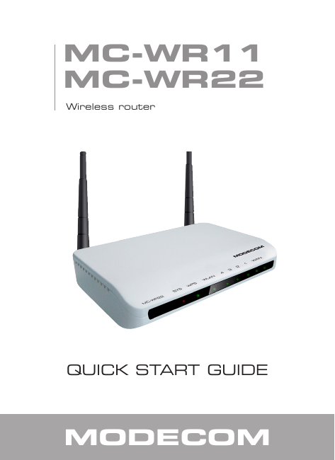 MC-wr11 MC-WR22 Wireless router Quick Start Guide MODECOM 1 Wireless router Quick Start Guide 3 Chapter 1 Introduction 3 Features 3 1.2 Operation Environment 4 1.3 System Requirements 5 Chapter 2 Hardware Installation 2.1 Led indicators 5 2.2 Back Panel Features 5 2.3 Typical install 6 Chapter 3 - Quick Install Guide 2 5 7 3.1 TCP/IP Settings 7 3.2 Getting Started 8 3.3 Setup Wizard 9 www.modecom.eu Wireless router Quick Start Guide Latest versions of manuals, quick start guides, drivers and software are available on www.modecom.eu website. IMPORTANT NOTE: Provided technical specifications are subject to change without prior notice. All brand and product names mentioned in this manual are trademarks and/or registered trademarks of their respective holders. © 2010 MODECOM S.A. All rights reserved. Duplication and copying requires approval from copyright holder. Chapter 1 Introduction Congratulations on your purchase of this outstanding Wireless Router. The Wireless Router integrates 4-port switch, firewall, NAT-router and Wireless Access Point. This product is specifically designed for Home networks and Medium or Small Corporation needs. It will allow you to connect your network wirelessly better than ever, sharing Internet Access, files and fun, easily and securely. It is easy to configure and operate even for users without wide experience with network devices. Instructions for installing and configuring this product can be found the manual delivered with the product and also available at www.modecom.eu website. Before you install and use this product, please read this manual carefully to exploit all the functions of this product. Features WAN: Gateway / Bridge / WISP / Static IP / DHCP / PPPoE / PPTP / L2TP / UPnP LAN: RJ45 4port switch / DHCP Client, Server / Static DHCP / IP&MAC Bind Wireless: Compliant with draft IEEE 802.11n standard (MC-WR22- 2T2R / MCWR11 – 1T1R) Up to: 300Mbps (MC-WR22) / 150Mbps (MC-WR11) data transfer rates in IEEE 802.11n mode Backward compatible with IEEE 802.11b/g Supports both Infrastructure and Ad-Hoc Networking Modes Work modes: AP / Client / WDS / AP+WDS / Universal Repeater (AP+Client) Supports WPS, WPA2 (802.11i), WPA, WPA2/WPA Mixed, 802.1x advanced security Supports 64/128-bit WEP Data Encryption 3 Wireless router Quality of Service (QoS) - WMM, WMM-PS Auto wireless transmission channel select for optimal performance Wireless access control (MAC address filter) Advanced Wireless control: Fragment Threshold / RTS Threshold / Beacon Interval Preamble Type: Long / Short IAPP - Roaming (802.11f) Protection / Aggregation / Short GI / WLAN Partition RF Output Power control Multiple BSSID Dynamic DNS: DynDNS.org / TZO / 3322.org NAT: NAT/NAPT IP sharing / DMZ / Port Forwarding / Port Trigger / UPnP QoS: Yes - IP (single or range) Grant MIN or MAX bandwidth Firewall protection: Ping Access on WAN / IGMP Proxy / Web Server Access on WAN / IPsec/ PPTP/L2TP VNP pass through / Src MAC or IP Filter / URL Filter / Dst IP and Port Filter / DoS Prevention: Whole System Flood: SYN, FIN, UDP, ICMP Per-Source IP Flood: SYN, FIN, UDP, ICMP TCP/UDP Port Scan (High/Low Sensitivity) ICMP Smurf, IP Land, IP Spoof, IP TearDrop, PingOfDeath, TCP Scan, TCP SynWithData, UDP Bomb, UDP EchoChargen Source IP Blocking (Block for a specified time) System Management: Access Schedule / NTP support / FW Upgrade / Save/Load Config / Reboot / User name and password management 1.2 Operation Environment Dimensions: 202 (L) x 120 (W) x 31 (H)mm Unit Weight: 324g Power Input: 9V DC, 1A Consumption: 13.5W(Max) Storage Temperature: -40ºC ~70ºC 4 www.modecom.eu Wireless router Operating Temperature : -10ºC ~50ºC Storage Humidity: 5% ~95% RH Non-condensing Operating Humidity: 10% ~90% RH Non-condensing 1.3 System Requirements An Ethernet-Based Cable or DSL modem 10/100M Ethernet Card on PC TCP/IP network protocol for each PC RJ45 Twisted-pair cable Internet browser: Microsoft Internet Explorer, Firefox, Opera or Chrome Chapter 2 Hardware Installation 2.1 Led indicators SYS/Power (Red): Flickering light indicates a proper connection to the power supply. While resetting the SYS LED will flash differently (shine for 2 seconds and stop for 1 second). WPS (Green): The Led will flicker for about two minutes when WPS session is active . WLAN (Wireless LAN) (green): The LED is flickering during wireless activity. LAN 1,2,3,4 (green): The Link/Act LED serves two purposes. If the LED is continuously illuminated, the Router is successfully connected to a device through the corresponding port. If the LED is flickering, the Router is actively sending or receiving data over that port. WAN (Green):The Link/Act LED serves two purposes. If the LED is continuously illuminated, the Router is successfully connected to a device through the corresponding port. If the LED is flickering, the Router is actively sending or receiving data over that port. 2.2 Back Panel Features 5 Wireless router LAN(1,2,3,4): 10/100Mbps RJ45 Auto-sensing. These four LAN ports are where you will connect other network devices, such as PCs/Laptops, print servers, remote hard drives, and anything else you want to put on your network. If you connect this product with the Network adapter, Hub (or Switch) correctly, the Router’s corresponding LED and the Adapter’s, Hub’s (or the Switch) will illuminate. WAN: 10/100Mbps RJ45 port. The WAN port is where you will connect Cable/DSL Modem or other LAN. RESET(WPS): The Reset Button has three functions, WPS, reboot and Factory Default. When press it less than 2 second, it is WPS function and the SYS LED will flash two minute (as long as WPS session is active); 2 to 5 seconds, the router will reboot; and more than 5 seconds, the router will restore to factory default settings. Power inlet: 9V DC, 1A Power supply. 2.3 Typical install 1. Make sure all devices, including your PCs, modem, and Router, are turned on. 2. Using an Ethernet network cable, connect the LAN device or Ethernet network p