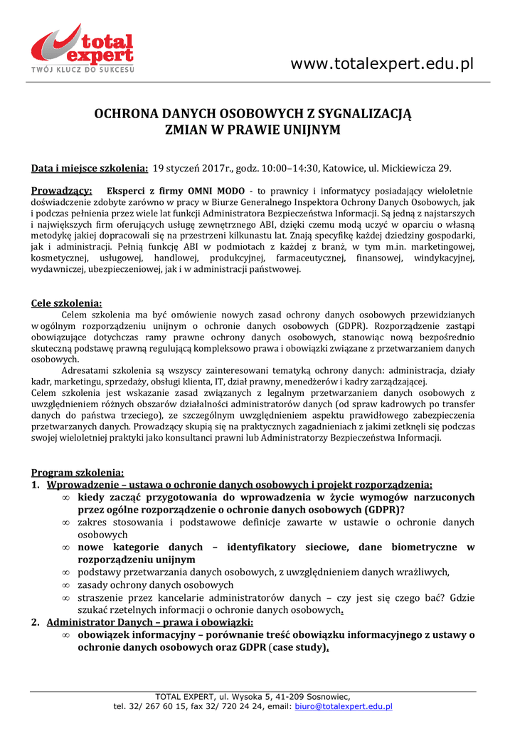 www.totalexpert.edu.pl OCHRONA DANYCH OSOBOWYCH Z SYGNALIZACJĄ ZMIAN W PRAWIE UNIJNYM Data i miejsce szkolenia: 19 styczeń 2017r., godz. 10:00–14:30, Katowice, ul. Mickiewicza 29. Prowadzący: Eksperci z firmy OMNI MODO - to prawnicy i informatycy posiadający wieloletnie doświadczenie zdobyte zarówno w pracy w Biurze Generalnego Inspektora Ochrony Danych Osobowych, jak i podczas pełnienia przez wiele lat funkcji Administratora Bezpieczeństwa Informacji. Są jedną z najstarszych i największych firm oferujących usługę zewnętrznego ABI, dzięki czemu modą uczyć w oparciu o własną metodykę jakiej dopracowali się na przestrzeni kilkunastu lat. Znają specyfikę każdej dziedziny gospodarki, jak i administracji. Pełnią funkcję ABI w podmiotach z każdej z branż, w tym m.in. marketingowej, kosmetycznej, usługowej, handlowej, produkcyjnej, farmaceutycznej, finansowej, windykacyjnej, wydawniczej, ubezpieczeniowej, jak i w administracji państwowej. Cele szkolenia: Celem szkolenia ma być omówienie nowych zasad ochrony danych osobowych przewidzianych w ogólnym rozporządzeniu unijnym o ochronie danych osobowych (GDPR). Rozporządzenie zastąpi obowiązujące dotychczas ramy prawne ochrony danych osobowych, stanowiąc nową bezpośrednio skuteczną podstawę prawną regulującą kompleksowo prawa i obowiązki związane z przetwarzaniem danych osobowych. Adresatami szkolenia są wszyscy zainteresowani tematyką ochrony danych: administracja, działy kadr, marketingu, sprzedaży, obsługi klienta, IT, dział prawny, menedżerów i kadry zarządzającej. Celem szkolenia jest wskazanie zasad związanych z legalnym przetwarzaniem danych osobowych z uwzględnieniem różnych obszarów działalności administratorów danych (od spraw kadrowych po transfer danych do państwa trzeciego), ze szczególnym uwzględnieniem aspektu prawidłowego zabezpieczenia przetwarzanych danych. Prowadzący skupią się na praktycznych zagadnieniach z jakimi zetknęli się podczas swojej wieloletniej praktyki jako konsultanci prawni lub Administratorzy Bezpieczeństwa Informacji. Program szkolenia: 1. Wprowadzenie – ustawa o ochronie danych osobowych i projekt rozporządzenia: • kiedy zacząć przygotowania do wprowadzenia w życie wymogów narzuconych przez ogólne rozporządzenie o ochronie danych osobowych (GDPR)? • zakres stosowania i podstawowe definicje zawarte w ustawie o ochronie danych osobowych • nowe kategorie danych – identyfikatory sieciowe, dane biometryczne w rozporządzeniu unijnym • podstawy przetwarzania danych osobowych, z uwzględnieniem danych wrażliwych, • zasady ochrony danych osobowych • straszenie przez kancelarie administratorów danych – czy jest się czego bać? Gdzie szukać rzetelnych informacji o ochronie danych osobowych. 2. Administrator Danych – prawa i obowiązki: • obowiązek informacyjny – porównanie treść obowiązku informacyjnego z ustawy o ochronie danych osobowych oraz GDPR (case study), TOTAL EXPERT, ul. Wysoka 5, 41-209 Sosnowiec, tel. 32/ 267 60 15, fax 32/ 720 24 24, email: [email protected] www.totalexpert.edu.pl • 3. 4. 5. 6. 7. prawo do kontroli Administratora danych wyrażone w art. 33 ustawy o ochronie danych osobowych, • powierzenie przetwarzania – jak prawidłowo skonstruować umowę i dlaczego należy ją stosować? (case study), • nowe elementy umowy powierzenia oraz podpowierzenie przetwarzania danych przewidziane przez rozporządzenie unijne, • odpowiedzialność Administratora Danych przy zawarciu umowy powierzenia, • kiedy Administrator Danych może udostępnić dane osobowe (z uwzględnieniem użytkowników internetu), • prawa i obowiązki administratora w kontekście przekształceń własnościowych (case study), • więcej niż jeden administrator danych osobowych – obecnie i pod rządami GDPR. Przetwarzanie danych kadrowych: • kandydaci do pracy – podstawy przetwarzania, obowiązek informacyjny, • pracownicy – zakres uprawnień pracodawcy do dysponowania danymi pracownika, • przechowywanie danych, dozwolony zakres przetwarzania, testy kompetencyjne, • obowiązek informacyjny wobec pracownika i jego rodziny, monitoring pracownika (case study), • udostępnianie danych kadrowych – kiedy rzeczywiście ma miejsce i jak legalnie to zrobić? Rejestracja/aktualizacja baz danych – rozwiązania obecne oraz przyszłe: • zwolnienie z obowiązku rejestracji zbiorów danych w przypadku powołania ABI • jak wypełnić wniosek rejestracyjny (gdzie kryją się pułapki), • jakie zbiory danych nadal podlegają obowiązkowi rejestracji? • czym straszą nas kancelarie rozsyłające maile – czy jest czego się bać? Generalny Inspektor Ochrony Danych Osobowych (GIODO): • Praktyka kontrolna, i. jak przygotować się do kontroli GIODO? (case study), ii. z praktyki Kancelarii jako pełnomocnika. • Rejestr zbiorów oraz rejestr ABI, i. przebieg postępowania rejestracyjnego przed GIODO, ii. kontrola GIODO nad poprawnym sprawowaniem przez ABI zadań w organizacji, iii. obowiązek zgłaszania uchybień w ochronie danych osobowych przewidziany przez rozporządzenie. Dane osobowe w działaniach marketingowych: • podstawa przetwarzania, rola obowiązku informacyjnego, • marketing tradycyjny, mailing, media społecznościowe i inne kanały komunikacji a ochrona danych osobowych, • dlatego warto budować własne bazy i jak to robić, • zakupione bazy danych oraz pozyskiwanie danych z sieci (w tym przedsiębiorców). Zadania ABI/DPO (sygnalizacja): • obecny status ABI/Data Protection Officer (DPO) przewidywany przez rozporządzenie, • powołanie ABI/DPO – kiedy prawo a kiedy obowiązek, • kto może zostać ABI? TOTAL EXPERT, ul. Wysoka 5, 41-209 Sosnowiec, tel. 32/ 267 60 15, fax 32/ 720 24 24, email: [email protected] www.totalexpert.edu.pl • usytuowanie, łączenie funkcji, zapewnienie ABI środków niezbędnych do pełnienia funkcji, • nowe zadania ABI: i. nadzór nad pr