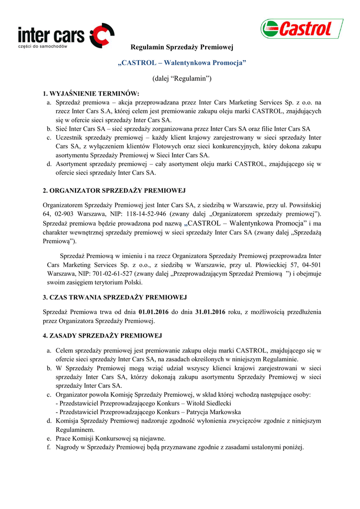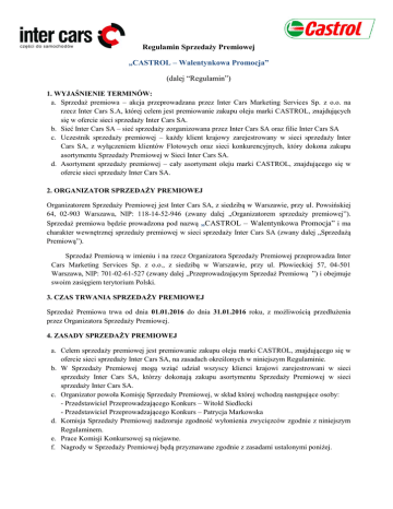 Regulamin Sprzedaży Premiowej „CASTROL – Walentynkowa Promocja” (dalej “Regulamin”) 1. WYJAŚNIENIE TERMINÓW: a. Sprzedaż premiowa – akcja przeprowadzana przez Inter Cars Marketing Services Sp. z o.o. na rzecz Inter Cars S.A, której celem jest premiowanie zakupu oleju marki CASTROL, znajdujących się w ofercie sieci sprzedaży Inter Cars SA. b. Sieć Inter Cars SA – sieć sprzedaży zorganizowana przez Inter Cars SA oraz filie Inter Cars SA c. Uczestnik sprzedaży premiowej – każdy klient krajowy zarejestrowany w sieci sprzedaży Inter Cars SA, z wyłączeniem klientów Flotowych oraz sieci konkurencyjnych, który dokona zakupu asortymentu Sprzedaży Premiowej w Sieci Inter Cars SA. d. Asortyment sprzedaży premiowej – cały asortyment oleju marki CASTROL, znajdującego się w ofercie sieci sprzedaży Inter Cars SA. 2. ORGANIZATOR SPRZEDAŻY PREMIOWEJ Organizatorem Sprzedaży Premiowej jest Inter Cars SA, z siedzibą w Warszawie, przy ul. Powsińskiej 64, 02-903 Warszawa, NIP: 118-14-52-946 (zwany dalej „Organizatorem sprzedaży premiowej”). Sprzedaż premiowa będzie prowadzona pod nazwą „CASTROL – Walentynkowa Promocja” i ma charakter wewnętrznej sprzedaży premiowej w sieci sprzedaży Inter Cars SA (zwany dalej „Sprzedażą Premiową”). Sprzedaż Premiową w imieniu i na rzecz Organizatora Sprzedaży Premiowej przeprowadza Inter Cars Marketing Services Sp. z o.o., z siedzibą w Warszawie, przy ul. Płowieckiej 57, 04-501 Warszawa, NIP: 701-02-61-527 (zwany dalej „Przeprowadzającym Sprzedaż Premiową ”) i obejmuje swoim zasięgiem terytorium Polski. 3. CZAS TRWANIA SPRZEDAŻY PREMIOWEJ Sprzedaż Premiowa trwa od dnia 01.01.2016 do dnia 31.01.2016 roku, z możliwością przedłużenia przez Organizatora Sprzedaży Premiowej. 4. ZASADY SPRZEDAŻY PREMIOWEJ a. Celem sprzedaży premiowej jest premiowanie zakupu oleju marki CASTROL, znajdującego się w ofercie sieci sprzedaży Inter Cars SA, na zasadach określonych w niniejszym Regulaminie. b. W Sprzedaży Premiowej mogą wziąć udział wszyscy klienci krajowi zarejestrowani w sieci sprzedaży Inter Cars SA, którzy dokonają zakupu asortymentu Sprzedaży Premiowej w sieci sprzedaży Inter Cars SA. c. Organizator powoła Komisję Sprzedaży Premiowej, w skład której wchodzą następujące osoby: - Przedstawiciel Przeprowadzającego Konkurs – Witold Siedlecki - Przedstawiciel Przeprowadzającego Konkurs – Patrycja Markowska d. Komisja Sprzedaży Premiowej nadzoruje zgodność wyłonienia zwycięzców zgodnie z niniejszym Regulaminem. e. Prace Komisji Konkursowej są niejawne. f. Nagrody w Sprzedaży Premiowej będą przyznawane zgodnie z zasadami ustalonymi poniżej. g. Nieterminowe płatności za zakupy asortymentu Sprzedaży Premiowej lub przeterminowane należności wobec Organizatora Sprzedaży Premiowej, powodują wykluczenie Uczestnika z udziału w Sprzedaży Premiowej. 5. NAGRODY a. Nagrodą w Sprzedaży Premiowej „CASTROL – Walentynkowa Promocja” jest, w zależności od zrealizowanego progu zakupowego (wartość zakupów netto liczona łącznie w całym okresie trwania promocji): Za 4 000 zł kwoty zakupów netto asortymentu Sprzedaży Premiowej dokonanych w całym okresie trwania Sprzedaży Premiowej, Klient otrzyma – złotą zawieszkę firmy Apart (kod Apart: Z-463.01) za 1 zł netto. Za 7 000 zł kwoty zakupów netto asortymentu Sprzedaży Premiowej dokonanych w całym okresie trwania Sprzedaży Premiowej, Klient otrzyma – złotą zawieszkę z łańcuszkiem firmy Apart (kod Apart: AP19-053 oraz Z-463.01) za 1 zł netto. Za 10 000 zł kwoty zakupów netto asortymentu Sprzedaży Premiowej dokonanych w całym okresie trwania Sprzedaży Premiowej, Klient otrzyma – kuferek na biżuterię + łańcuszek z zawieszką firmy Apart (kod Apart: AP55-018 + AP19-053 oraz Z-463.01) za 1 zł netto. b. Klient może otrzymać max. 3 nagrody jednego typu c. Liczba nagród, przyznanych Uczestnikowi Sprzedaży Premiowej zależy od ostatecznej wartości zakupów netto dokonanych w czasie trwania Sprzedaży Premiowej. d. Zakupy asortymentu Sprzedaży Premiowej dokonane przez Uczestnika sumują się przez cały okres obowiązywania Sprzedaży Premiowej. e. Nagrody zostaną wysłane do Filii Inter Cars SA nie później niż trzy tygodnie od daty zakończenia Sprzedaży Premiowej tj. do 21.02.2016 r., w celu przekazania Laureatom Sprzedaży Premiowej. f. Organizator Sprzedaży Premiowej zastrzega, że wszelkie należności podatkowe, które mogą zaistnieć w związku z przekazaniem nagród pozostają po stronie Laureata Sprzedaży Premiowej. g. Wszelkie należne podatki i opłaty skarbowe związane z otrzymaniem Nagrody ponosi Laureat. Organizator Sprzedaży Premiowej poinformuje Uczestnika, iż Nagroda stanowi przychód Uczestnika. 6. REKLAMACJE I ROSZCZENIA. a. Uczestnikowi przysługuje prawo złożenia reklamacji. b. Reklamacje przyjmowane będą wyłącznie w trybie korespondencji przesłanej listem poleconym na adres Przeprowadzającego Sprzedaż Premiową z dopiskiem ” „CASTROL – Walentynkowa Promocja”, nie później niż do dnia 27.02.2015 r., przy czym o dotrzymaniu terminu będzie decydować data stempla pocztowego. Reklamacja zgłoszona po tym terminie nie zostanie rozpatrzona. c. Reklamacja powinna być sporządzona na piśmie i zawierać imię, nazwisko i dokładny adres Uczestnika, jak również dokładny opis przyczyny reklamacji. d. Przeprowadzający Sprzedaż Premiową rozpatrzy reklamację w terminie 7 (siedmiu) dni roboczych od daty otrzymania, przy czym okres ten może zostać wydłużony, gdy rozpoznanie reklamacji wymaga dłuższego czasu. e. Po rozpatrzeniu reklamacji Przeprowadzający Sprzedaż Premiową prześle odpowiedź listem poleconym na adres wskazany przez Uczestnika. f. W przypadku, gdy złożona reklamacja zawiera braki uniemożliwiające jej rozpatrzenie, Przeprowadzający Sprzedaż Premiową wezwie Uczestnika do jej uzupełnienia, określając ter