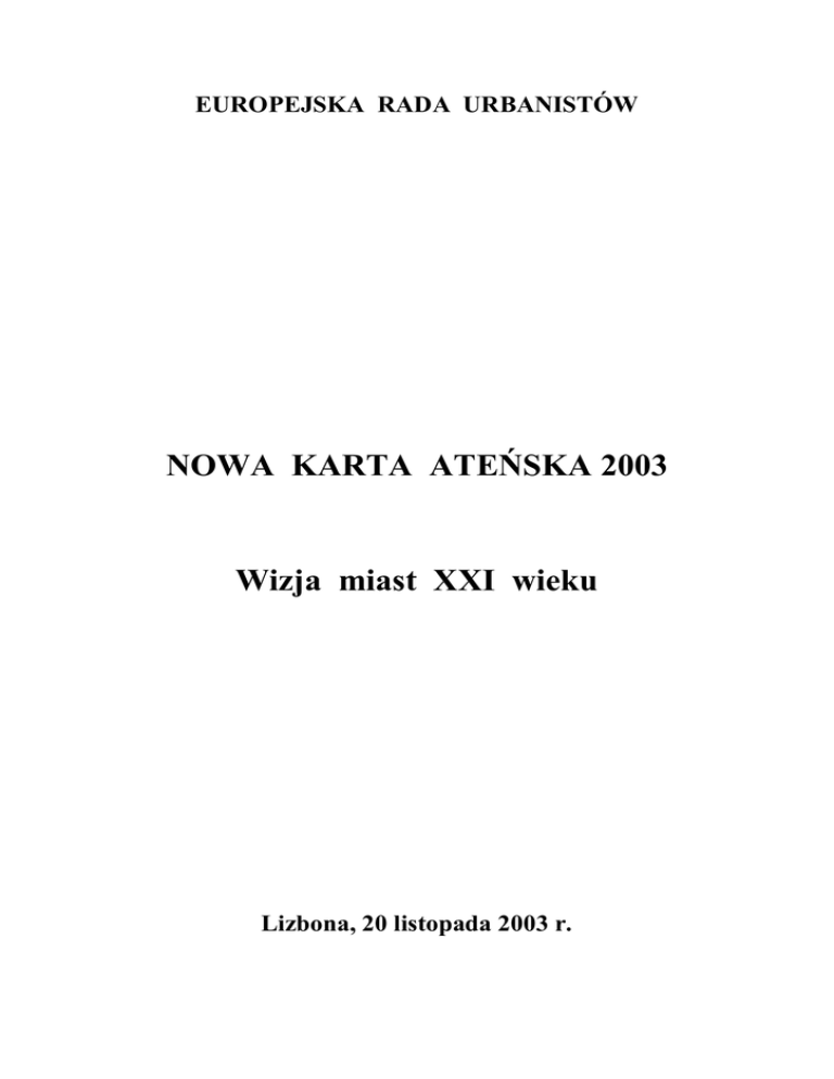 EUROPEJSKA RADA URBANISTÓW NOWA KARTA ATEŃSKA 2003 Wizja miast XXI wieku Lizbona, 20 listopada 2003 r. Tytuł oryginału: La Nouvelle Charte d’Athenes 2003 The New Charter of Athens Wydawca: Alinea, Firenze 2003 ISBN 88-8125-782-3 Redakcja polska: TOWARZYSTWO URBANISTÓW POLSKICH Przekład z edycji francuskiej: Stanisław Wyganowski Przekład porównawczy z edycji angielskiej i redakcja: Stanisław Furman i Bogdan Wyporek SPIS TREŚCI Przedmowa Wstęp CZĘŚĆ A. WIZJA 1. 2. 3. 4. 5. Spójne miasto Spójność społeczna Spójność ekonomiczna Spójność środowiska Synteza przestrzenna CZĘŚĆ B 1. PROBLEMY I WYZWANIA 1. 2. 3. 4. Zmiany społeczne i polityczne Zmiany ekonomiczne i technologiczne Zmiany środowiska naturalnego Zmiany środowiska miejskiego CZĘŚĆ B 2. ZAANGAŹOWANIE URBANISTÓW ANEKS i PRZEDMOWA Europejska Rada Urbanistów (ERU), powołana do życia w 1985 roku, jest organizacją zrzeszającą stowarzyszenia urbanistów z krajów należących do Unii Europejskiej i kandydujących do Unii. Jest zarejestrowana w Brukseli, a jej Sekretariat znajduje się w Londynie. Organizacje zrzeszone w ERU reprezentują ponad 25 000 urbanistów. Europejska Rada Urbanistów ma dwa cele: przyczynianie się do budowania jednej Europy przez promowanie ideałów europejskich mających odniesienie przestrzenne oraz przez przedstawianie, zwłaszcza w planowaniu przestrzennym, konstruktywnych rozwiązań; organizowanie wymiany doświadczeń i wiedzy pomiędzy urbanistami pracującymi w Europie, a także identyfikowanie i ocenianie tendencji rozwojowych miast europejskich oraz prezentowanie wizji ich przyszłości. W 1998 r. ERU opublikowała Nową Kartę Ateńską: Kartę Miast Europejskich w XXI wieku. Rada zobowiązała się jednocześnie do dokonywania regularnych przeglądów i rozwijania tego dokumentu. Rada wspiera organizację Europejskiego Biennale Miast i Urbanistów, oraz promuje ogłaszany co dwa lata konkurs o Europejską Nagrodę za Opracowania Urbanistyczne i Regionalne, mający na celu prezentację dobrych praktyk. Rada współpracuje z Stowarzyszeniem Europejskich Szkół Planowania (AESOP) na polu edukacji w dziedzinie planowania przestrzennego i urbanistyki. Dalsze informacje o Europejskiej Radzie Urbanistów są dostępne na stronach internetowych: http://www.ceu-ectp.org ii WSTĘP Europejska Rada Urbanistów jest pewna, że w XXI wieku Europa będzie zdecydowanie zmierzać w kierunku integracji. W tej perspektywie, Rada przedstawia Wizję przyszłości miast europejskich, wyrażającą szeroko podzielane poglądy europejskich urbanistów (Część A) Jest to wizja sieci miast, które: zachowują bogactwo i zróżnicowanie kulturowe wynikające z ich długiej historii i umiejętnie łączą swą teraźniejszość i przyszłość z przeszłością; są powiązane w sieci o wielorakim znaczeniu i funkcji; są twórcze i konkurencyjne, ale jednocześnie są zdolne do współpracy i wzajemnie się uzupełnianiają ; przyczyniają się w decydującym stopniu do dobrobytu i wygodnego życia ich mieszkańców; łączą harmonijnie środowisko zurbanizowane ze środowiskiem przyrodniczym. Prezentowana w Nowej Karcie Ateńskiej Wizja wyznacza również ramy działań (część B), które tworzą: - główne problemy i wyzwania miast na początku trzeciego tysiąclecia; - zaangażowanie urbanistów w realizację Wizji. Nowa Karta Ateńska jest adresowana przede wszystkim do urbanistów oraz tych wszystkich, którzy uczestniczą w procesach planistycznych w Europie. Ma ona ukierunkować ich spójne działania na rzecz stworzenia sieci powiązań między miastami Europy na wszystkich szczeblach hierarchii miast i we wszystkich dziedzinach. Planowanie przestrzenne ma żywotne znaczenie dla osiągania trwałego i zrównoważonego rozwoju. Służy rozważnemu gospodarowaniu przestrzenią, będącą podstawowym ale ograniczonym w wielkości zasobem naturalnym, zapotrzebowanie na który ustawicznie wzrasta. Planowanie przestrzenne wymaga zaangażowania wielodyscyplinarnych zespołów w długotrwałe procesy planistyczne prowadzone w różnych skalach. Atrybutem zawodu urbanisty jest umiejętność jednoczesnego brania pod uwagę i łączenia wielu problemów oraz wyrażania ich w kategoriach przestrzennych. Europejska Rada Urbanistów, biorąc pod uwagę wielkie zróżnicowanie miast i regionów europejskich, jest jednak świadoma zarówno powszechności zawodu urbanisty jak i różnic w jego pojmowaniu w Europie. iii CZĘŚĆ A. WIZJA MIAST XXI WIEKU 1. SPÓJNE MIASTO W drugiej połowie XX wieku powstało wiele pesymistycznych prognoz dotyczących przyszłości miast europejskich. Przewidywano spadek wydajności pracy, wyludnienie i degradację centralnych dzielnic miejskich, rozpasanie przestępczości, znaczne zanieczyszczenie i zniszczenie środowiska, a także utratę tożsamości miast. Szczęśliwie te przewidywania nie potwierdziły się, aczkolwiek dzisiejsze miasta Starego Kontynentu dalekie są od ideału i muszą sprostać wielkim wyzwaniom. Odpowiadając na te wyzwania, Europejska Rada Urbanistów proponuje na początku nowego tysiąclecia swoją Wizję miasta. Ta Wizja nie jest ani nową utopią, ani oderwaną od realiów projekcją innowacji technologicznych. Koncentruje się ona na Mieście Spójnym i jest wyobrażeniem takiego miasta, jakie chcielibyśmy mieć dziś i w przyszłości. Wizja ta wyraża cel, do którego urbaniści Europy zobowiązują się dążyć, wykorzystując w najwyższym stopniu swoje umiejętności zawodowe; cel który może być osiągnięty poprzez wspólne wysiłki tych wszystkich, którzy uczciwie wpływają na zrównoważony rozwój i zarządzanie miastami. Na spójność miasta wpływa czynników oddziaływujących w różnych wymiarach. Są to zarówno czynniki fizyczne, widoczne w zabudowie miast, jak i powiązania funkcjonale, podziemne sieci infrastruktury, technologie informatyczne i systemy łączności. Spójność w czasie, - hist