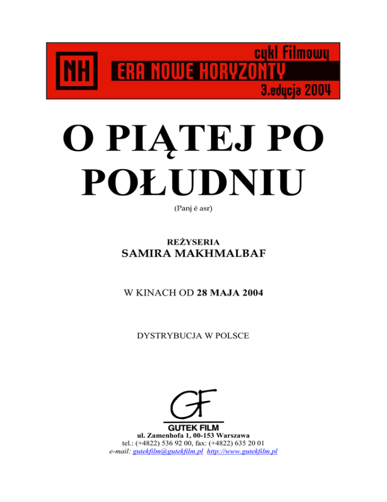 O PIĄTEJ PO POŁUDNIU (Panj é asr) REŻYSERIA SAMIRA MAKHMALBAF W KINACH OD 28 MAJA 2004 DYSTRYBUCJA W POLSCE ul. Zamenhofa 1, 00-153 Warszawa tel.: (+4822) 536 92 00, fax: (+4822) 635 20 01 e-mail: [email protected] http://www.gutekfilm.pl reżyseria Samira Makhmalbaf scenariusz Mohsen Makhmalbaf Samira Makhmalbaf zdjęcia Ebrahim Ghafori muzyka Mohammad Reza Darvishi montaż Mohsen Makhmalbaf dźwięk Faroukh Fadai występują Agheleh Rezaïe Abdolgani Yousefrazi Razi Mohebi Marzieh Amiri Noqreh ojciec poeta Leylomah producent Mohsen Makhmalbaf film wyprodukowany przez Makhmalbaf Film House Wild Bunch Bac Films nagrody Cannes 2003 – Nagroda Jury Ekumenicznego i Nagroda Jury Iran / Francja rok produkcji: 2003 czas trwania: 90 minut kolor – Dolby Digital – 1:1,85 Pierwszy film Samiry Makhmalbaf, Jabłko, został pokazany w ramach oficjalnej selekcji festiwalu w Cannes w 1998. Reżyserka miała wtedy siedemnaście lat i stała się najmłodszym filmowcem w historii canneńskiego konkursu. Dwa lata później jej Tablice wygrały na tym festiwalu Specjalną Nagrodę Jury. Teraz sukces ten powtórzył najnowszy, trzeci pełnometrażowy obraz irańskiej reżyserki, O piątej po południu. Nakręcono go pod koniec 2002 roku na przedmieściach Kabulu i jest to pierwszy film zrealizowany w Afganistanie po upadku rządu Talibów. Jego bohaterką jest Noqreh, niewiele młodsza od reżyserki dziewczyna, która chodzi do nowo otwartej szkoły i próbuje realizować swoje ambicje i marzenia mimo sprzeciwów ojca, religijnego fanatyka. Jednak Makhmalbaf w swoim filmie nie demonizuje fundamentalistów religijnych, którzy ograniczyli rolę kobiet w Afganistanie do minimum. Wręcz przeciwnie, próbuje ich zrozumieć. Pomimo zupełnie odmiennych stylów życia, ojciec i córka są wobec siebie taktowni i pełni szacunku. Noqreh wręcz ze współczuciem przygląda się ojcu, który po upadku Talibów, staje się zupełnie bezradny. Makhmalbaf pokazuje naród znajdujący się stanie zawieszenia, próbujący pozbyć się wszechobecnych wpływów Talibów, a jednocześnie niepewny swojej nowej tożsamości. O piątej po południu jest przejmującą opowieścią o zniszczonym bombami kraju, którego mieszkańcy próbują za wszelką cenę zacząć normalnie żyć. GŁOSY PRASY W O piątej po południu młodziutka Iranka Samira Makhmalbaf wraca do problemu afgańskich kobiet. Po upadku reżimu Talibów dziewczynki mogą uczyć się, nadrabiać stracony czas. Jedna z uczennic kabulskiej szkoły chce zostać prezydentem Afganistanu. To jej wewnętrzny bunt. Jej optymizm. Ale nędza i tradycja robią swoje, odzierają ją z marzeń. Makhmalbaf nawet nie oskarża ojca niepotrafiącego zaakceptować zmian obyczajowości. Jak w swoim debiutanckim Jabłku próbuje go zrozumieć. Nie można jednym dekretem zmienić przyzwyczajeń i obyczaju. Nie można też dekretem pokonać nędzy. Makhmalbaf rysuje obraz życia w Afganistanie, jakiego nie można zobaczyć w telewizyjnych newsach. Obraz kraju biednego, wyczerpanego, z pokorą znoszącego nędzę, niemogącego odbić się od dna. Kraju, w którym każdego dnia umierają marzenia. Barbara Hollender „Rzeczpospolita” O piątej po południu – pierwszy zagraniczny film nakręcony w Kabulu od czasu obalenia reżimu Talibów – jest misternym, niezwykle potężnym obrazem wygnania i tęsknoty. To piękna i wzruszająca historia o ludziach, którzy znaleźli się w samym centrum dziejowego zamętu, o nadziei walczącej wśród ruin o przetrwanie. Geoffrey Macnab, „Moving Pictures” Tytuł filmu pochodzi z hiszpańskiego wiersza Garcii Lorki traktującego o obecności śmierci przenikającej arenę, na której odbywają się walki byków. Wiążąc wiersz, wyszeptany na samym początku filmu, z losami rodziny Noqreh odkrywamy w O piątej po południu problemy wykraczające poza wąski świat szkoły bohaterki i jej wymarzonego życia, poza obecny i dawny Afganistan. Kwestie sięgające naszego związku ze światem, naturą, życiem i śmiercią. Peter Brunette, „Screen International” REŻYSERKA O SWOIM FILMIE PODCZAS KONFERENCJI PRASOWEJ NA MIĘDZYNARODOWYM FESTIWALU FILMOWYM W CANNES O Talibach Gdy przyjechałam na początku zdjęć do Kabulu, udałam się do hotelu. Kiedy do niego wchodziłam zauważyłam, że patrzy na mnie stary człowiek. Zobaczył moją twarz, odwrócił się do ściany i zamknął oczy. Nie miałam na sobie burki. Ten starzec, surowy fundamentalista, nie mógł nawet pojąć, jak można spojrzeć kobiecie prosto w twarz. Współczułam mu i zastanawiałam się, jak teraz będzie żył? Naprawdę wierzył w nauki Talibów. Wcześniej miał władzę i mógł po prostu sprawić, żebym założyła burkę. Talibowie nie byli po prostu grupą, która rządziła Afganistanem przez kilka lat, a teraz znikła. Są w ludzkiej pamięci, umysłach, kulturze Afganistanu i wielu innych wschodnich krajów – to nie jest zewnętrzna rana, którą można zabandażować. To tkwi głębiej. Jak nowotwór. Na zmiany w mentalności trzeba będzie jeszcze poczekać. O kobietach Poszłam do niedawno otwartej szkoły i zadałam kobietom, którym przecież tak długo zabraniano się kształcić, to samo pytanie, jakie pada na początku filmu: „Czy jest tu ktoś, kto chce zostać prezydentem?”. One pytanie wyśmiały, nie zdając sobie sprawy, że w ten sposób prowokowałam je do wyrażenia swoich uczuć na temat perspektyw, jakie mają w nowym Afganistanie. Noqreh jest symbolem nowego pokolenia. To optymistka śmiało spoglądająca w przyszłość. Jej ojciec zaś to religijny, pobożny fanatyk. Wierzy w męski szowinizm. Gdyby był kobietą, też by go akceptował, bowiem tak nauczyła go kultura. O aktorach Zatrudniłam głównie aktorów-amatorów, po części z wyboru, po części z musu, jako że afgańskie życie teatralne i filmowe zamarło, od kiedy kina zostały zakazane przez Talibów. Na początku nikt nie chciał zagrać roli córki. Pi
