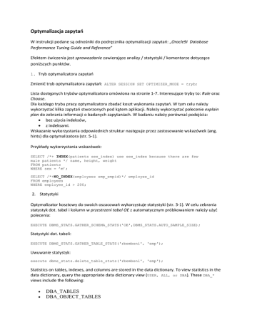 Lista dostępnych trybów optymalizatora omówiona na stronie 1‐7. Interesujące tryby to: Rule oraz Choose. Dla każdego trybu pracy optymalizatora zbadać koszt wykonania zapytań. W tym celu należy wykorzystać kilka zapytań stworzonych pod kątem aplikacji. Należy wykorzystać polecenie explain plan do zebrania informacji o badanych zapytaniach. W badaniu należy porównać podejścia: • bez użycia indeksów, • z indeksami. Wskazanie wykorzystania odpowiednich struktur następuje przez zastosowanie wskazówek (ang. hints) dla optymalizatora (str. 5‐1). Przykłady wykorzystania wskazówek: SELECT /*+ INDEX(patients sex_index) use sex_index because there are few