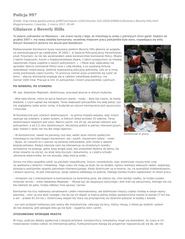 Policja 997 Źródło: http://www.gazeta.policja.pl/997/archiwum-1/2013/numer-103-102013/90914,Gliniarze-z-Beverly-Hills.html Wygenerowano: Czwartek, 2 marca 2017, 05:49 Gliniarze z Beverly Hills To jedyne uzdrowisko na Mazowszu – ale znane raczej z tego, że mieszkają tu osoby z pierwszych stron gazet. Dopiero od grudnia 2007 r. ma nową siedzibę komisariatu: wcześniej miejscem pracy policjantów była stara, rozpadająca się willa, których Konstancin Jeziorna ma akurat pod dostatkiem. Podwarszawski Konstancin bywa nazywany polskim Beverly Hills głównie ze względu na zamieszkujących go celebrytów. W 2002 r. w Gazecie Policyjnej Jerzy Paciorkowski pisał: Przyznam, że nie tak wyobrażałem sobie konstanciński komisariat Policji. Miasto z takimi tradycjami, kurort o międzynarodowej sławie, z takim przepychem za miedzą, zapomniało chyba zupełnie o swoich policjantach. (…) Może więc opłacałoby się sprzedać obecny komisariat Policji wraz z całą działką, a za uzyskaną fortunę wybudować nowoczesną, świetnie wyposażoną policyjną jednostkę, tyle że w innej, mniej prestiżowej części kurortu. Ta prorocza niemal wizja ucieleśniła się sześć lat temu – obecny komisariat znajduje się w całkiem niewillowej dzielnicy, ma niemal 1000 mkw. Pracuje w nim 31 policjantów i trzech pracowników cywilnych. PO NOWEMU, PO STAREMU Mł. asp. Sebastian Majewski, dzielnicowy, pracował jeszcze w starym budynku. – Miał swój klimat, mimo że był w fatalnym stanie – mówi. – Było tak ciasno, że każdy wiedział, z czym sąsiad ma kanapkę. Teraz większość policjantów ma swój pokój i już nie zaglądamy sobie przez ramię. A budynek po starym komisariacie jest opuszczony i niszczeje. W Konstancinie jest czterech dzielnicowych – to gmina miejsko‑wiejska, więc trzech zajmuje się miastem, a jeden wsiami, w których skład wchodzi 25 sołectw. Teraz dzielnicowym wiejskim jest sierż. Marcin Leicht: ma 25 lat, od ponad czterech jest policjantem, a od 2,5 roku dzielnicowym. Wcześniej jeździł w patrolu interwencyjnym, więc miasto (i wsie) nie ma dla niego tajemnic. – W Konstancinie, nawet na pierwszy rzut oka, widać duże różnice społeczne: mieszkają tu nie tylko bogaci biznesmeni, ale i zwykli, niezamożni ludzie – mówi. – Bywa, że czasami to ci pierwsi są bardziej niefrasobliwi, jeśli chodzi o własne bezpieczeństwo. Kiedyś zdarzyła nam się interwencja na strzeżonym osiedlu: wchodzimy na posesję, gdzie stoją drogie auta, bez przeszkód idziemy do domu, bo drzwi otwarte na oścież, na stole leżą kluczyki i dokumenty, a z piętra schodzi zdziwiona właścicielka, bo nie słyszała, żeby ktoś ją wołał… Dzielnicowi w pracy Gmina ma kilka zespołów szkół, są placówki niepubliczne, liceum i przedszkola, więc dzielnicowi muszą mieć czas na spotkania z dziećmi i młodzieżą. Tego czasu nie mają za dużo, bo na służbie, oprócz realizacji własnych zadań, wspierają dziesięciu policjantów zespołu patrolowo‑interwencyjnego. Kiedy dzielnicowi są w terenie, np. na wywiadzie środowiskowym, i dzwoni dyżurny, że jest interwencja, swoje zadania odkładają na później. Dlatego bardzo trudno zaplanować im dzień pracy. – Umawiam się z interesantami w komisariacie na konkretną porę, ale zdarza się, choć bardzo rzadko, że trzeba szybko zmieniać termin – mówi Sebastian Majewski. – Muszę być do dyspozycji dyżurnego i jeśli trafi się zatrzymany, którego nie ma kto odwieźć do pdoz, trzeba odłożyć inne sprawy i jechać. Komisariat ma trzy radiowozy oznakowane i jeden nieoznakowany, ale dzielnicowi miejscy często chodzą w swoje rejony piechotą – choć są one dość rozległe i nie da się ich obejść w trakcie jednej służby (powierzchnia miasta to ponad 17 km kw., a wsi – prawie 61 km kw.). Dzielnicowy wiejski też stara się przynajmniej raz dziennie pokazać w każdej z wiosek. – Już sam przejazd radiowozu jest ważny dla mieszkańców, zdarzają się tacy, którzy notują, o której go widzieli i potem do nas dzwonią, jeśli jakiegoś dnia go nie było – wyjaśnia sierż. Leicht. STOSUNKOWO SPOKOJNE MIASTO W maju, podczas debaty społecznej o bezpieczeństwie, konstancińscy mieszkańcy mogli się dowiedzieć, ile czasu w ich miejscowości trzeba czekać na interwencję policji. Funkcjonariusze starają się przyjechać najszybciej jak się da, ale nie zawsze się to udaje. Powód: za mało policjantów. Mieszkańcy narzekali też, że nie widzą patroli na ulicach, zwłaszcza wieczorami, i nie znają swojego dzielnicowego. – Powinno się znać swojego dzielnicowego, ale ważniejsze, żeby to on znał konkretnych mieszkańców i ich zwyczaje – mówi asp. sztab. Zbigniew Ptaszyński, komendant KP w Konstancinie‑Jeziornie. – Co do patroli na ulicach, to mamy wspólne ze strażą miejską, ale, niestety, nie jesteśmy w stanie zapewnić takiej liczby, która zadowoliłaby mieszkańców. Mamy trzy wakaty, ale nie ma na nie chętnych. Zbigniew Ptaszyński jest konstancińskim komendantem od sześciu lat i uważa, że to dość spokojne miasto: w 2012 r. było nieco ponad 1600 interwencji w mieście i 227 w sołectwach, wszczęto 469 postępowań, a wykrywalność przestępstw wyniosła 57 proc. (w powiecie piaseczyńskim wynosi ona 61,8 proc.). Nieletni dopuścili się 39 czynów karalnych, zatrzymano 102 nietrzeźwych kierowców i rowerzystów. Natomiast niemal nie do wykrycia są włamania na działkach letniskowych: właściciele stwierdzają je dopiero po dłuższym czasie, a ponadto spora część Konstancina jest zalesiona, co znacznie ułatwia „pracę” złodziejom. Dość częste są kradzieże elementów miedzianych z domów (nawet tych strzeżonych) i wycinanie drzew, nawet na posesjach. W oględzinach miejsc takiej nielegalnej wycinki pomagają strażnicy leśni – Konstancin znajduje się na terenie Chojnowskiego Parku Krajobrazowego i wydzielono tu ki