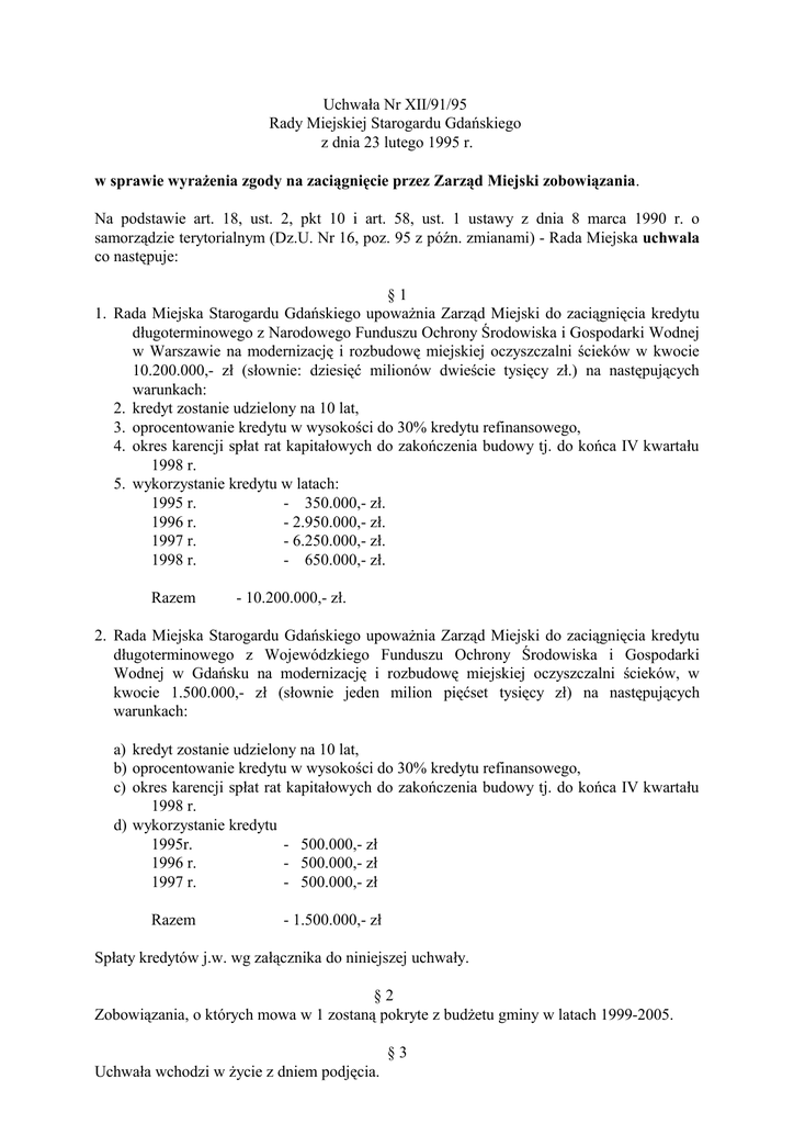 Uchwała Nr XII/91/95 Rady Miejskiej Starogardu Gdańskiego z dnia 23 lutego 1995 r. w sprawie wyrażenia zgody na zaciągnięcie przez Zarząd Miejski zobowiązania. Na podstawie art. 18, ust. 2, pkt 10 i art. 58, ust. 1 ustawy z dnia 8 marca 1990 r. o samorządzie terytorialnym (Dz.U. Nr 16, poz. 95 z późn. zmianami) - Rada Miejska uchwala co następuje: §1 1. Rada Miejska Starogardu Gdańskiego upoważnia Zarząd Miejski do zaciągnięcia kredytu długoterminowego z Narodowego Funduszu Ochrony Środowiska i Gospodarki Wodnej w Warszawie na modernizację i rozbudowę miejskiej oczyszczalni ścieków w kwocie 10.200.000,- zł (słownie: dziesięć milionów dwieście tysięcy zł.) na następujących warunkach: 2. kredyt zostanie udzielony na 10 lat, 3. oprocentowanie kredytu w wysokości do 30% kredytu refinansowego, 4. okres karencji spłat rat kapitałowych do zakończenia budowy tj. do końca IV kwartału 1998 r. 5. wykorzystanie kredytu w latach: 1995 r. - 350.000,- zł. 1996 r. - 2.950.000,- zł. 1997 r. - 6.250.000,- zł. 1998 r. - 650.000,- zł. Razem - 10.200.000,- zł. 2. Rada Miejska Starogardu Gdańskiego upoważnia Zarząd Miejski do zaciągnięcia kredytu długoterminowego z Wojewódzkiego Funduszu Ochrony Środowiska i Gospodarki Wodnej w Gdańsku na modernizację i rozbudowę miejskiej oczyszczalni ścieków, w kwocie 1.500.000,- zł (słownie jeden milion pięćset tysięcy zł) na następujących warunkach: a) kredyt zostanie udzielony na 10 lat, b) oprocentowanie kredytu w wysokości do 30% kredytu refinansowego, c) okres karencji spłat rat kapitałowych do zakończenia budowy tj. do końca IV kwartału 1998 r. d) wykorzystanie kredytu 1995r. - 500.000,- zł 1996 r. - 500.000,- zł 1997 r. - 500.000,- zł Razem - 1.500.000,- zł Spłaty kredytów j.w. wg załącznika do niniejszej uchwały. §2 Zobowiązania, o których mowa w 1 zostaną pokryte z budżetu gminy w latach 1999-2005. §3 Uchwała wchodzi w życie z dniem podjęcia. Przewodniczący Rady Miejskiej Starogardu Gdańskiego Roman Klin Uzasadnienie: Koszty realizacji rozbudowy oczyszczalni ścieków wyniosą (wg cen styczeń 1995 r.) 14.478.900 zł. Koszty uwzględniające inflację w okresie budowy wyniosą 18.623.200 zł. przy założeniu, że inflacja wyniesie w roku: 1) 1995 - 17%, 2) 1996 - 15%, 3) 1997 - 12%, 4) 1998 - 10%. Uwzględniając inflację j.w. cała inwestycja będzie finansowana z następujących środków: - kredyt NFOŚ - 10.200.000 zł, - kredyt WFOŚ - 1.500.000 zł, - dotacja z budżetu wojewody - 2.000.000 zł, - środki własne budżetu miasta - 4.923.200 zł. Środki własne z budżetu miasta stanowią dość istotne obciążenie dla budżetu i wyniosą w poszczególnych latach: - wydane do 31.12.1994 - 282.700 zł, - wydane do 31.12.1995 - 650.500 zł, - wydane do 31.12.1996 - 1.290.000 zł, - wydane do 31.12.1997 - 1.820.000 zł, - wydane do 31.12.1998 - 880.000 zł. Do kwot j.w. należy dodać obciążenie wynikające ze spłaty odsetek od kredytów zgodnie z załącznikiem. Rozbudowa oczyszczalni o część biologiczną jest niezbędną ze względu na rosnące wymagania ochrony wód. Stopień oczyszczenia ścieków w istniejącej oczyszczalni jest niedostateczny co powoduje naliczanie kar przez Wojewódzkiego Inspektora Ochrony Środowiska. Egzekucja kar jest aktualnie zawieszona na okres do półrocza 1998 r. pod warunkiem uruchomienia biologicznej oczyszczalni ścieków. Nie zrealizowanie tej inwestycji spowoduje egzekwowanie dotychczas zawieszonych kar. Załącznik nr 1 do uchwały Nr XII/91/95 z dnia 23 lutego 1995 r. Spłata rat odsetek z tytułu kredytów. Rok 1 1995 1996 1997 1998 1999 2000 2001 2002 2003 2004 2005 Razem Ogółem NFOŚiGW kredyt preferencyjny spłata (tys. zł.) odsetki (tys. zł.) 2 3 8,8 246,7 681,6 1.019,2 1.508,0 925,8 1.510,0 774,9 1.512,0 623,7 1.512,0 472,3 1.512,0 321,3 1.512,0 170,0 1.134,0 28,4 10.200,0 5.272,8 15.472,8 WFOŚ kredyt preferencyjny spłata (tys. zł.) odsetki (tys. zł.) 4 5 40,6 121,9 186,9 186,9 375,0 146,2 375,0 97,5 375,0 48,7 375,0 1.500,0 828,7 2.328,7 Przewodniczący Rady Miejskiej Starogardu Gdańskiego Roman Klin