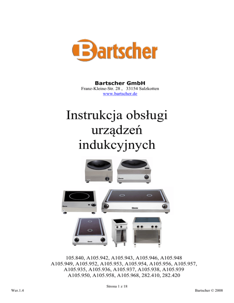 Bartscher GmbH Franz-Kleine-Str. 28 , 33154 Salzkotten www.bartscher.de Instrukcja obsługi urządzeń indukcyjnych 105.840, A105.942, A105.943, A105.946, A105.948 A105.949, A105.952, A105.953, A105.954, A105.956, A105.957, A105.935, A105.936, A105.937, A105.938, A105.939 A105.950, A105.958, A105.968, 282.410, 282.420 Strona 1 z 18 Wer.1.4 Bartscher © 2008 Spis treści Strona 1 1.1 Sprawy ogólne Zastosowanie 3 3 2 2.1 2.2 Opis produktu Produkty Dane techniczne 3 3 4 2.2.1. Obsługa i kontrola 2.2.2. Dane techniczne urządzeń 2.2.3. Warunki działania 4 4 4 Instalacja Dane elektryczne urządzeń 5 3.1.1. 3.1.2. 3.1.3. 3.1.4. 5 5 5 5 3 3.1 Urządzenia wg mocy (2,5 kW, 3 kW) Urządzenia wg mocy (3,5 kW) Urządzenia wg mocy (5 kW) Urządzenia wg mocy (7 kW, 8 kW) 3.2 3.3 3.4 Wymagania instalacyjne Zalecenia instalacyjne Zalecenia instalacyjne dla modelu do zabudowy 6 6 6-7 4 4.1 Uruchomienie Montaż 7 7-8 5 Test działania 9 6 6.1 Obsługa Proces gotowania 10 10 7 7.1 7.2 7.3 7.4 7.5 7.6 7.7 7.8 7.9 Przepisy dotyczące bezpieczeństwa Opis symboli ostrzegawczych Zagrożenia wynikające z nieprzestrzegania przepisów BHP Bezpieczne użytkowanie Przepisy dotyczące bezpieczeństwa personelu obsługi Niewłaściwa obsługa Zmiany / części zamienne Rozpoznawanie naczynia Nadzorowanie strefy grzewczej Emisja hałasu 11 11 11 12 12 13 13 13 13 13 8 Wyłączenie z eksploatacji 13 9 9.1 Lokalizacja / usuwanie usterek Przegląd komunikatów o błędach na wyświetlaczu 14-15 16 10 Czyszczenie 17 11 Utrzymanie 18 12 Utylizacja 18 Strona 2 z 18 Wer.1.4 Bartscher © 2008 1. Sprawy ogólne Niniejsza instrukcja obsługi zawiera podstawowe informacje, które należy uwzględniać podczas montażu, użytkowania i utrzymania. Przed rozpoczęciem instalacji i uruchomieniem zarówno monter, jak i personel obsługi powinni przeczytać całą instrukcję, która następnie powinna być przechowywana w pobliżu urządzenia, aby zawsze można było z niej skorzystać. 1.1 Zastosowanie Indukcyjne urządzenia do gotowania służą do przygotowywania posiłków. Mogą być stosowane do gotowania, podtrzymywania temperatury, flambirowania, grillowania itp. potraw. Uwaga, w przypadku korzystania z urządzeń indukcyjnych należy stosować specjalne naczynia. Nie należy stosować tak zwanych produktów NO-NAME. Dno naczynia musi być magnetyczne. W razie potrzeby można to sprawdzić za pomocą magnesu. 2. Opis produktu 2.1 Produkty Modele BM . A105.942, A105.943, A105.954, 282 410, 282.420, Modele BI A105.946, A105.948, A105.949, A105.952, A105.953, A105.956, A105.957 Modele BW 105.840, A105.935, A105.936, A105.937, A105.938 - Zwarta budowa modułowa - Łatwy montaż - Łatwość serwisowania - Prostota obsługi za pomocą obrotowej gałki - Zwarta elektronika mocy umożliwia łatwą i bezpieczną eksploatację - Maksymalne bezpieczeństwo eksploatacji dzięki funkcjom ochronnym i kontrolnym - Niewielkie wymiary zewnętrzne - Niewielki ciężar Strona 3 z 18 Wer.1.4 Bartscher © 2008 2.2 2.2.1 Dane techniczne Obsługa i kontrola Lampka „praca lub rozpoznawanie naczynia” 2V DC/ca. 10mA (czerwona LED) Regulator mocy – potencjometr 0 Ohm – 10 kOhm Wielkości S x G x W Powierzchnia Ceran 105.840 330 x 380 x 175 mm Zagłębienie wok A105.942,.943,.954 340 x 420 x 100 mm 290 x 290 mm A105.946,.948,.949 400 x 455 x 120 mm 350 x 350 mm A105.956,.957 400 x 655 x 120 mm 350 x 560 mm A105.952,.953 700 x 455 x 120 mm 650 x 350 mm A105.935,.936,.937 400 x 455 x 180 mm Zagłębienie wok A105.938 500 x 555 x 235 mm Zagłębienie wok A105.950 400 x 400 mm 350 x 350 mm A105.958 400 x 700 mm 350 x 650 mm A105.968 700 x 700 mm 650 x 650 mm 282.410 400 x 700 x 860-900 mm 350 x 605 mm 282.420 800 x 700 x 860-900 mm 650 x 605 mm 2.2.2 Techniczne dane urządzeń Urządzenie Napięcie Moc Ciężar 105.840 1 x 230 V 3.0 kW A105.942,.943,.954 1 x 230 V 2.5, 3.0, 3,5 kW A105.949 3 x 400 V 5 kW A105.946,A105.948 1 x 230 V 3.0, 3.5 kW A105.937 3 x 400 V 5kW A105.935,A105.936 1 x 230 V 3.0, 3.5 kW A105.938 3 x 400 V 8 kW 19 kg A105.950 3 x 400 V 5 kW 12 kg A105.958 3 x 400 V 7, 10 kW 21 kg A105.968 3 x 400 V 20 kW 40 kg 282.410 3 x 400 V 10 kW 50 kg 282.420 3 x 400 V 20 kW 80 kg 2.2.3 8,5 kg 9 kg 13 kg 11-13 kg 14 kg 11-13 kg Warunki działania - maks. odchyłka napięcia w sieci od znamionowego +5%/-10% - częstotliwość - Klasa ochronności IP 43 - min. średnica naczynia 12cm 50/60 Hz Strona 4 z 18 Wer.1.4 Bartscher © 2008 3 Instalacja 3.1 Dane elektryczne urządzeń 3.1.1. Urządzenia wg mocy (2,5 kW, 3 kW) 1-fazowe pole indukcyjne (napięcie 230 V +5% / -10%) Przyłącze Faza N Kolor czarny niebieski Częstotliwość 50 Hz / 60 Hz częstotliwość robocza 22-35 kHz PE Bezpiecznik brak bezp. sterujący 1 X 400mA T (zwłoczny) żółto/zielony 3.1.2. Urządzenia wg mocy (3,5 kW) 1-fazowe pole indukcyjne (napięcie 230 V +5% / -10%) Przyłącze Faza Kolor czarny, brązowy lub 1 N niebieski lub 2 Częstotliwość 50 Hz / 60 Hz częstotliwość robocza 22-35 kHz PE Bezpiecznik 2 X 20A FF (super szybki) bezp. sterujący 2 X 160mA T (zwłoczny) żółto/zielony 3.1.3. Urządzenia wg mocy (5 kW) 3-fazowe pole indukcyjne (napięcie 400 V +5% / -10%) Przyłącze Faza N Kolor czarny, brązowy lub 1,2 ,3 niebieski lub 4 Częstotliwość 50 Hz / 60 Hz częstotliwość robocza 22-35 kHz PE Bezpiecznik 3 X 12,5A FF (super szybki) 2 X 100mA T (zwłoczny) żółto/zielony 3.1.4. Urządzenia wg mocy (7 kW, 8 kW) 3-fazowe pole indukcyjne (napięcie 400 V +5% / -10%) Przyłącze Faza N Kolor czarny, brązowy lub 1,2 ,3 niebieski lub 4 Częstotliwość 50 Hz / 60 Hz częstotliwość robocza 22-35 kHz PE Bezpiecznik 3 X 16A FF (super szybki) 2 X 100mA T (zwłoczny) żółto/zielony Otoczenie - maks. temperatura otoczenia użytkowanie >+5°C do +35°C - przechowywanie >-20°C do +70°C maks. wilgotność względna przechowywanie >10% do 90% użytkowanie >30% do 90% Strona 5 z 18 Wer.1.4 Bartscher © 2008 3.2 Wymagania instalacyjne Urządzenie indukcy