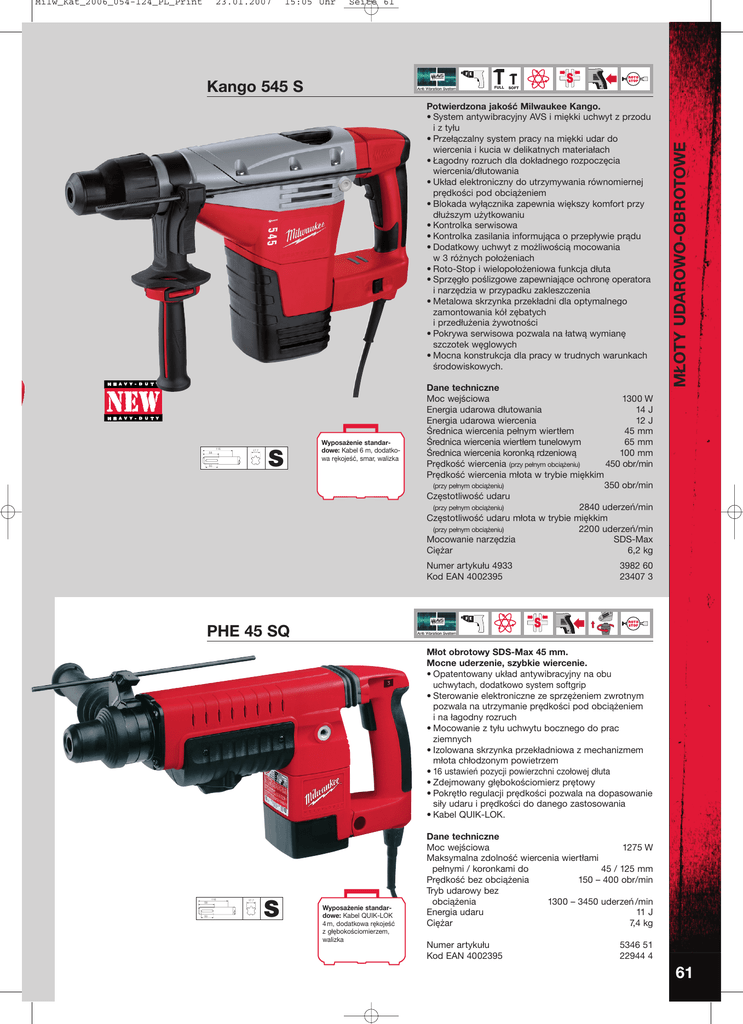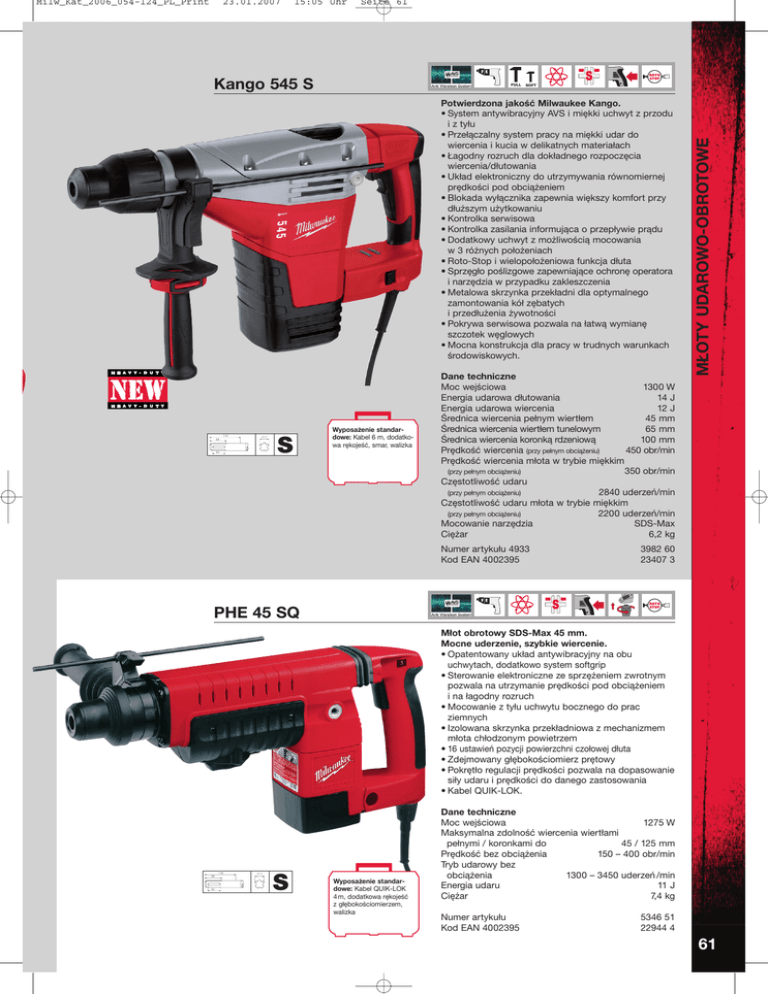 23.01.2007 15:05 Uhr Seite 61 Kango 545 S FULL SOFT Potwierdzona jakość Milwaukee Kango. • System antywibracyjny AVS i miękki uchwyt z przodu i z tyłu • Przełączalny system pracy na miękki udar do wiercenia i kucia w delikatnych materiałach • Łagodny rozruch dla dokładnego rozpoczęcia wiercenia/dłutowania • Układ elektroniczny do utrzymywania równomiernej prędkości pod obciążeniem • Blokada wyłącznika zapewnia większy komfort przy dłuższym użytkowaniu • Kontrolka serwisowa • Kontrolka zasilania informująca o przepływie prądu • Dodatkowy uchwyt z możliwością mocowania w 3 różnych położeniach • Roto-Stop i wielopołożeniowa funkcja dłuta • Sprzęgło poślizgowe zapewniające ochronę operatora i narzędzia w przypadku zakleszczenia • Metalowa skrzynka przekładni dla optymalnego zamontowania kół zębatych i przedłużenia żywotności • Pokrywa serwisowa pozwala na łatwą wymianę szczotek węglowych • Mocna konstrukcja dla pracy w trudnych warunkach środowiskowych. 116 58 17.7 50 S Wyposażenie standardowe: Kabel 6 m, dodatkowa rękojeść, smar, walizka Dane techniczne Moc wejściowa 1300 W Energia udarowa dłutowania 14 J Energia udarowa wiercenia 12 J Średnica wiercenia pełnym wiertłem 45 mm Średnica wiercenia wiertłem tunelowym 65 mm Średnica wiercenia koronką rdzeniową 100 mm Prędkość wiercenia (przy pełnym obciążeniu) 450 obr/min Prędkość wiercenia młota w trybie miękkim (przy pełnym obciążeniu) 350 obr/min Częstotliwość udaru (przy pełnym obciążeniu) 2840 uderzeń/min Częstotliwość udaru młota w trybie miękkim (przy pełnym obciążeniu) 2200 uderzeń/min Mocowanie narzędzia SDS-Max Ciężar 6,2 kg Numer artykułu 4933 Kod EAN 4002395 MŁOTY UDAROWO-OBROTOWE Milw_Kat_2006_054-124_PL_Print 3982 60 23407 3 PHE 45 SQ Młot obrotowy SDS-Max 45 mm. Mocne uderzenie, szybkie wiercenie. • Opatentowany układ antywibracyjny na obu uchwytach, dodatkowo system softgrip • Sterowanie elektroniczne ze sprzężeniem zwrotnym pozwala na utrzymanie prędkości pod obciążeniem i na łagodny rozruch • Mocowanie z tyłu uchwytu bocznego do prac ziemnych • Izolowana skrzynka przekładniowa z mechanizmem młota chłodzonym powietrzem • 16 ustawień pozycji powierzchni czołowej dłuta • Zdejmowany głębokościomierz prętowy • Pokrętło regulacji prędkości pozwala na dopasowanie siły udaru i prędkości do danego zastosowania • Kabel QUIK-LOK. 116 58 50 17.7 S Wyposażenie standardowe: Kabel QUIK-LOK 4 m, dodatkowa rękojeść z głębokościomierzem, walizka Dane techniczne Moc wejściowa 1275 W Maksymalna zdolność wiercenia wiertłami pełnymi / koronkami do 45 / 125 mm Prędkość bez obciążenia 150 – 400 obr/min Tryb udarowy bez obciążenia 1300 – 3450 uderzeń /min Energia udaru 11 J Ciężar 7,4 kg Numer artykułu Kod EAN 4002395 5346 51 22944 4 61