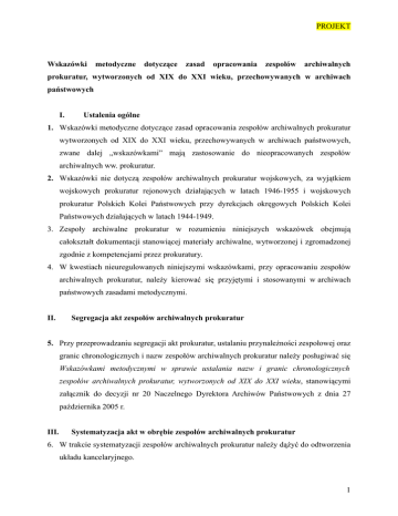 PROJEKT Wskazówki metodyczne dotyczące zasad opracowania zespołów archiwalnych prokuratur, wytworzonych od XIX do XXI wieku, przechowywanych w archiwach państwowych I. Ustalenia ogólne 1. Wskazówki metodyczne dotyczące zasad opracowania zespołów archiwalnych prokuratur wytworzonych od XIX do XXI wieku, przechowywanych w archiwach państwowych, zwane dalej „wskazówkami” mają zastosowanie do nieopracowanych zespołów archiwalnych ww. prokuratur. 2. Wskazówki nie dotyczą zespołów archiwalnych prokuratur wojskowych, za wyjątkiem wojskowych prokuratur rejonowych działających w latach 1946-1955 i wojskowych prokuratur Polskich Kolei Państwowych przy dyrekcjach okręgowych Polskich Kolei Państwowych działających w latach 1944-1949. 3. Zespoły archiwalne prokuratur w rozumieniu niniejszych wskazówek obejmują całokształt dokumentacji stanowiącej materiały archiwalne, wytworzonej i zgromadzonej zgodnie z kompetencjami przez prokuratury. 4. W kwestiach nieuregulowanych niniejszymi wskazówkami, przy opracowaniu zespołów archiwalnych prokuratur, należy kierować się przyjętymi i stosowanymi w archiwach państwowych zasadami metodycznymi. II. Segregacja akt zespołów archiwalnych prokuratur 5. Przy przeprowadzaniu segregacji akt prokuratur, ustalaniu przynależności zespołowej oraz granic chronologicznych i nazw zespołów archiwalnych prokuratur należy posługiwać się Wskazówkami metodycznymi w sprawie ustalania nazw i granic chronologicznych zespołów archiwalnych prokuratur, wytworzonych od XIX do XXI wieku, stanowiącymi załącznik do decyzji nr 20 Naczelnego Dyrektora Archiwów Państwowych z dnia 27 października 2005 r. III. Systematyzacja akt w obrębie zespołów archiwalnych prokuratur 6. W trakcie systematyzacji zespołów archiwalnych prokuratur należy dążyć do odtworzenia układu kancelaryjnego. 1 PROJEKT 7. Przy systematyzacji akt w obrębie zespołu archiwalnego prokuratury zaleca się stosowanie poniższego schematu układu akt: 1. akta ogólne/administracja prokuratora 2. pomoce kancelaryjne 3. akta spraw prokuratorskich 8. W przypadku występowania innych serii akt (np. wydziałów zamiejscowych), niż wymienione w punkcie 7, należy kierować się Wskazówkami metodycznymi w sprawie ustalania nazw i granic chronologicznych zespołów archiwalnych prokuratur, wytworzonych od XIX do XXI wieku, stanowiącymi załącznik do decyzji nr 20 Naczelnego Dyrektora Archiwów Państwowych z dnia 27 października 2005 r. 9. W przypadku sukcesji czynnej akta sprawy należy włączyć do zespołu archiwalnego prokuratury, w której zakończono postępowanie w sprawie. 10. W przypadku, gdy pomoc kancelaryjna prowadzona była dla więcej niż jednej prokuratury, należy włączyć ją do zespołu archiwalnego prokuratury, której dotyczy większość spraw. IV. Brakowanie 11. Nie przewiduje się brakowania. V. Opracowywanie archiwalnych pomocy ewidencyjno-informacyjnych 12. Przy sporządzaniu archiwalnych pomocy ewidencyjno-informacyjnych należy kierować się obowiązującymi przepisami dotyczącymi ich opracowania. 13. Pomoce ewidencyjno-informacyjne sporządza się w systemie informatycznym. 14. Jako uzupełnienie pomocy ewidencyjno-informacyjnych zaleca się opracować indeksy: a) osobowy, b) geograficzny, c) przedmiotowy. 15. Decyzję w sprawie sporządzania indeksu podejmuje komisja metodyczna archiwum. 16. Podczas formułowania tytułów jednostek archiwalnych należy kierować się następującymi zasadami: 2 PROJEKT 16.1.obok oryginalnego zapisu kancelaryjnego należy umieścić uzupełnienia dotyczące określenia czynu zabronionego i miejsce jego popełnienia. Ponadto należy zamieścić nazwy podmiotów oraz nazwiska osób, których sprawa dotyczy. 17. Daty skrajne jednostki wyznaczają: data najwcześniejszego pisma i data ostatniego pisma w jednostce. Daty załączników i zapisków kancelaryjnych (np. informacji o wypożyczeniu akt, sporządzeniu kopii, odpisów, wyciągów) nie mają wpływu na datację jednostki. 18. Elementy opisu jednostki archiwalnej zawiera schemat ogólny, patrz załącznik. Literatura1 Źródła publikowane: Dla zespołów archiwalnych prokuratur z terenów, które do 1918 r. wchodziły w skład monarchii Habsburgów (1850-1918) (załącznik nr 1) 1. Kaiserliches Patent vom 29 Juli 1853, womit für den ganzen Umfang des Reiches, mit Ausnahme der Militärgränze, eine neue Straffprocess-Ordnung erlassen, und bestimmt wird, dass der Tag, an welchem dieselbe in den einzelnen Kronländern in Wirksamkeit zu treten hat, nachträglich festgesetzt werden wird, Reichsgesetzblatt 1853, Nr. 151, s. 833-953. 2. Ustawa z dnia 23 maja 1873 zaprowadzająca kodeks postępowania karnego, Dziennik Ustaw Państwa 1873, Nr. 119, s. 397-501. 3. Rozporządzenie Ministra Sprawiedliwości z dnia 19 listopada 1873 zawierające Skazówkę czyli Przepisy o wykonaniu kodeksu postępowania karnego z dnia 23 maja 1873, Dziennik Ustaw Państwa nr 119 za porozumieniem się z Ministrem Spraw Wewnętrznych wydane, Dz.U.P. 1873, nr 152, s. 611-686. 4. Rozporządzenie Ministra Sprawiedliwości z dnia 5 maja 1897, którem wydają się postanowienia uzupełniające w przedmiocie prowadzenia czynności w prokuratoryach państwa, Dz.U.P. 1897, Nr 144, s. 871-878. 1 Literatura ujęta w niniejszych wskazówkach obejmuje tylko te źródła i opracowania, które nie zostały ujęte w załącznikach nr 1-7 do Decyzji Nr 20 NDAP z dnia 27 października 2005 r. w sprawie wprowadzenia wskazówek metodycznych w sprawie ustalania nazw i granic chronologicznych zespołów archiwalnych prokuratur, wytworzonych od XIX do XXI w., przechowywanych w archiwach państwowych. 3 PROJEKT dla zespołów archiwalnych prokuratorów działających na terenie Księstwa Warszawskiego i Królestwa Polskiego (1808-1915) (załącznik nr 3) 1. Instrukcja Ministra Sprawiedliwości z dnia 13 maja 1808 r. – Organizacja sądownictwa cywilnego - Zbiór Przepisów Administracyjny