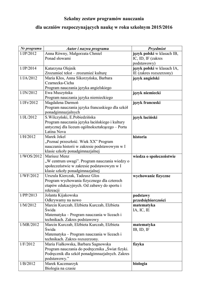 Szkolny zestaw programów nauczania dla uczniów rozpoczynających naukę w roku szkolnym 2015/2016 Nr programu 1/JP/2012 1/JP/2014 Autor i nazwa programu Anna Równy, Małgorzata Chmiel Ponad słowami Katarzyna Olejnik Zrozumieć tekst – zrozumieć kulturę 1/JA/2012 Maria Kłos, Anna Sikorzyńska, Barbara Czarnecka-Cicha Program nauczania języka angielskiego 1/JN/2012 Ewa Muszyńska Program nauczania języka niemieckiego 1/JFr/2012 Magdalena Darmoń Program nauczania języka francuskiego dla szkół ponadgimnazjalnych 1/JŁ/2012 S.Wilczyński, E.Pobiedzińska Program nauczania języka łacińskiego i kultury antycznej dla liceum ogólnokształcącego – Porta Latina Nova 1/H/2012 Marek Jekel „Poznać przeszłość. Wiek XX” Program nauczania historii w zakresie podstawowym w I klasie szkoły ponadgimnazjalnej 1/WOS/2012 Mariusz Menz „W centrum uwagi”. Program nauczania wiedzy o społeczeństwie w zakresie podstawowym w I klasie szkoły ponadgimnazjalnej 1/WF/2012 Urszula Kierczak, Tadeusz Glos Program wychowania fizycznego dla czterech etapów edukacyjnych. Od zabawy do sportu i rekreacji 1/PP/2013 Jolanta Kijakowska Odkrywamy na nowo 1/M/2012 Marcin Kurczab, Elżbieta Kurczab, Elżbieta Świda Matematyka – Program nauczania w liceach i technikach. Zakres podstawowy 1/MR/2012 Marcin Kurczab, Elżbieta Kurczab, Elżbieta Świda Matematyka – Program nauczania w liceach i technikach. Zakres rozszerzony. 1/F/2012 Maria Fiałkowska, Barbara Sagnowska Program nauczania do podręcznika „Świat fizyki. Podręcznik dla szkół ponadgimnazjalnych. Zakres podstawowy.” 1/B/2012 Marek Kaczmarzyk Biologia na czasie Przedmiot język polski w klasach IB, IC, ID, IF (zakres podstawowy) język polski w klasach IA, IE (zakres rozszerzony) język angielski język niemiecki język francuski język łaciński historia wiedza o społeczeństwie wychowanie fizyczne podstawy przedsiębiorczości matematyka IA, IC, IE matematyka IB, ID, IF fizyka biologia 1/WOK/2013 Monika Bokiniec, Barbara Forysiewicz, Jacek Michałowski, Natalia Mrozowiak – Nastrożna, Grzegorz Nazaruk, Magda Sacha, Grażyna Świętochowska Spotkania z kulturą 1/CH/2012 Romuald Hassa, Aleksandra Mrzigod, Janusz Mrzigod To jest chemia – zakres podstawowy 1/G/2012 Radosław Uliszak, Krzysztof Weidermann Oblicza geografii wiedza o kulturze 1/Inf/2012 informatyka 1/EB/2012 1/R/2012 Grażyna Koba Informatyka dla szkół ponadgimnazjalnych – zakres podstawowy Anna Nowak – Kowal Edukacja dla bezpieczeństwa. Program nauczania dla szkół ponadgimnazjalnych Komisja Wychowania Katolickiego Konferencji Episkopatu Polski (przewodniczący: ks. bp Marek Mendyk) chemia geografia edukacja dla bezpieczeństwa religia Przedmioty uzupełniające i przedmioty realizowane w zakresie rozszerzonym (od klasy drugiej) Nr programu Autor i nazwa programu 2/CH/2013 Maria Litwin, Szarlota Styka - Wlazło, Joanna Szymońska To jest chemia 1 – zakres podstawowy 2/B/2013 Marek Guzik, Ewa Jastrzębska, Ryszard Kozik, Renata Matuszewska, Ewa Pyłka – Gutowska, Władysław Zamachowski Biologia na czasie 1 podręcznik dla liceum i technikum – zakres rozszerzony 2/G/2013 Roman Malarz, Marek Więckowski Oblicza geografii 1 – zakres rozszerzony 2/FIZ/2013 Agnieszka Byczuk, Krzysztof Byczuk, Zuzanna Suwald, Stanisław Suwald Zrozumieć fizykę Wydawnictwo Nowa Era 2/PRZ/2013 Mirosław Galikowski, Romuald Hassa, Marek Kaczmarzyk, Aleksandra Mrzigod, Janusz Mrzigod, Marek Więckowski Przyroda 2/HiS/2013 Marcin Markowicz, Olga Pytlińska, Agata Wyroda Histoia i społeczeństwo. Ojczysty panteon i ojczyste spory 2/WOS/2013 Mariusz Menz W centrum uwagi – zakres rozszerzony 2/H/2013 Robert Śniegocki Zrozumieć przeszłość dla zakresu rozszerzonego Przedmiot chemia klasy IIB, IIC biologia klasy IIB, IIC geografia klasy IIA, IIC, IIF fizyka klasy IID przyroda klasy IIB, IIC historia i społeczeństwo klasy IIB, IIC, IID, IIF wiedza o społeczeństwie klasy IIE, IIF historia klasy IIA, IIE Szkolny zestaw programów nauczania dla uczniów klas drugich w roku szkolnym 2013/2014 przedmioty uzupełniające i przedmioty realizowane w zakresie rozszerzonym Nr programu 2/CH/2013 Autor i nazwa programu Maria Litwin, Szarlota Styka – Wlazło, Joanna Szymońska To jest chemia 1 – zakres rozszerzony 2/B/2013 Marek Guzik, Ewa Jastrzębska, Ryszard Kozik, Renata Matuszewska, Ewa Pyłka – Gutowska, Władysław Zamachowski Biologia na czasie 1 podręcznik dla liceum i technikum – zakres rozszerzony 2/G/2013 Roman Malarz, Marek Więckowski Oblicza geografii 1 – zakres rozszerzony 2/FIZ/2013 Agnieszka Byczuk, Krzysztof Byczuk, Zuzanna Suwald, Stanisław Suwald Zrozumieć fizykę Wydawnictwo Nowa Era 2/INF/2013 Grażyna Koba Informatyka dla szkół ponadgimnazjalnych – zakres rozszerzony 2/PRZ/2013 Mirosław Galikowski, Romuald Hassa, Marek Kaczmarzyk, Aleksandra Mrzigod, Janusz Mrzigod, Marek Więckowski Przyroda 2/HiS/2013 Marcin Markowicz, Olga Pytlińska, Agata Wyroda Historia i społeczeństwo. Ojczysty panteon i ojczyste spory 2/WOS/2013 Mariusz Menz W centrum uwagi – zakres rozszerzony 2/H/2013 Robert Śniegocki Zrozumieć przeszłość dla zakresu rozszerzonego Przedmiot Chemia klasy IIB, IIC Biologia klasy IIB, IIC Geografia klasy IIA, IIF, IIC Fizyka i astronomia klasy IIB, IID Informatyka klasy IID Przyroda klasy IIE Historia klasy IIB, IIC, IID, IIF Wiedza o społeczeństwie klasy IIE, IIF Historia klasy IIA, IIE Szkolny zestaw programów nauczania dla uczniów rozpoczynających naukę w roku szkolnym 2013/2014 Nr programu 1/JP/2012 Autor i nazwa programu Anna Równy, Małgorzata Chmiel Ponad słowami 1/JP/2013 Ewa Jaskółowa Świat do przeczytania 1/JA/2012 Maria Kłos, Anna Sikorzyńska, Barbara Czarnecka-Cicha Program nauczania języka angielskiego 1/JN/2012 Ewa Muszyńska Program nauczania języka niemieckiego 1/JN/2013 Anna Jaroszewska Program nauczania języka niemieckiego 1/JFr/2012 Magdalena Darmoń Program nauczania języka francu