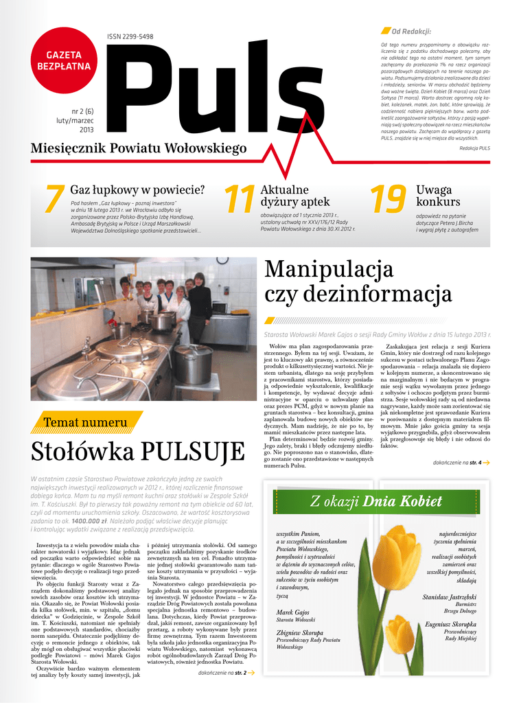 Puls Od Redakcji: ISSN 2299-5498 GAZETA BEZPŁATNA nr 2 (6) luty/marzec 2013 Od tego numeru przypominamy o obowiązku rozliczenia się z podatku dochodowego polecamy, aby nie odkładać tego na ostatni moment, tym samym zachęcamy do przekazania 1% na rzecz organizacji pozarządowych działających na terenie naszego powiatu. Podsumujemy działania zrealizowane dla dzieci i młodzieży, seniorów. W marcu obchodzić będziemy dwa ważne święta, Dzień Kobiet (8 marca) oraz Dzień Sołtysa (11 marca). Warto dostrzec ogromną rolę kobiet, koleżanek, matek, żon, babć, które sprawiają, że codzienność nabiera piękniejszych barw, warto podkreślić zaangażowanie sołtysów, którzy z pasją wypełniają swój społeczny obowiązek na rzecz mieszkańców naszego powiatu. Zachęcam do współpracy z gazetą PULS, znajdzie się w niej miejsce dla wszystkich. Miesięcznik Powiatu Wołowskiego 7 Gaz łupkowy w powiecie? Pod hasłem „Gaz łupkowy – poznaj inwestora” w dniu 18 lutego 2013 r. we Wrocławiu odbyło się zorganizowane przez Polsko-Brytyjska Izbę Handlową, Ambasadę Brytyjską w Polsce i Urząd Marszałkowski Województwa Dolnośląskiego spotkanie przedstawicieli... 11 Aktualne dyżury aptek obowiązujące od 1 stycznia 2013 r., ustalony uchwałą nr XXV/176/12 Rady Powiatu Wołowskiego z dnia 30.XI.2012 r. Redakcja PULS 19 Uwaga konkurs odpowiedz na pytanie dotyczące Petera J.Bircha i wygraj płytę z autografem Manipulacja czy dezinformacja Starosta Wołowski Marek Gajos o sesji Rady Gminy Wołów z dnia 15 lutego 2013 r. Temat numeru Stołówka PULSUJE W ostatnim czasie Starostwo Powiatowe zakończyło jedną ze swoich największych inwestycji realizowanych w 2012 r., której rozliczenie finansowe dobiega końca. Mam tu na myśli remont kuchni oraz stołówki w Zespole Szkół im. T. Kościuszki. Był to pierwszy tak poważny remont na tym obiekcie od 60 lat, czyli od momentu uruchomienia szkoły. Oszacowano, że wartość kosztorysowa zadania to ok. 1400.000 zł. Należało podjąć właściwe decyzje planując i kontrolując wydatki związane z realizacją przedsięwzięcia. Inwestycja ta z wielu powodów miała charakter nowatorski i wyjątkowy. Idąc jednak od początku warto odpowiedzieć sobie na pytanie: dlaczego w ogóle Starostwo Powiatowe podjęło decyzję o realizacji tego przedsięwzięcia. Po objęciu funkcji Starosty wraz z Zarządem dokonaliśmy podstawowej analizy sowich zasobów oraz kosztów ich utrzymania. Okazało się, że Powiat Wołowski posiada kilka stołówek, min. w szpitalu, „domu dziecka” w Godzięcinie, w Zespole Szkół im. T. Kościuszki, natomiast nie spełniały one podstawowych standardów, chociażby norm sanepidu. Ostatecznie podjęliśmy decyzję o remoncie jednego z obiektów, tak aby mógł on obsługiwać wszystkie placówki podległe Powiatowi – mówi Marek Gajos Starosta Wołowski. Oczywiście bardzo ważnym elementem tej analizy były koszty samej inwestycji, jak i później utrzymania stołówki. Od samego początku zakładaliśmy pozyskanie środków zewnętrznych na ten cel. Ponadto utrzymanie jednej stołówki gwarantowało nam tańsze koszty utrzymania w przyszłości – wyjaśnia Starosta. Nowatorstwo całego przedsięwzięcia polegało jednak na sposobie przeprowadzenia tej inwestycji. W jednostce Powiatu – w Zarządzie Dróg Powiatowych została powołana specjalna jednostka remontowo – budowlana. Dotychczas, kiedy Powiat przeprowadzał, jakiś remont, zawsze organizowany był przetarg, a roboty wykonywane były przez firmę zewnętrzną. Tym razem Inwestorem była szkoła jako jednostka organizacyjna Powiatu Wołowskiego, natomiast wykonawcą robót ogólnobudowlanych Zarząd Dróg Powiatowych, również jednostka Powiatu. dokończenie na str. 2 Wołów ma plan zagospodarowania przestrzennego. Byłem na tej sesji. Uważam, że jest to kluczowy akt prawny, a równocześnie produkt o kilkusettysięcznej wartości. Nie jestem urbanistą, dlatego na sesję przybyłem z pracownikami starostwa, którzy posiadają odpowiednie wykształcenie, kwalifikacje i kompetencje, by wydawać decyzje administracyjne w oparciu o uchwalany plan oraz prezes PCM, gdyż w nowym planie na gruntach starostwa – bez konsultacji, gmina zaplanowała budowę nowych obiektów medycznych. Mam nadzieję, że nie po to, by mamić mieszkańców przez następne lata. Plan determinować będzie rozwój gminy. Jego zalety, braki i błędy odczujemy niedługo. Nie poproszono nas o stanowisko, dlatego zostanie ono przedstawione w następnych numerach Pulsu. Zaskakująca jest relacja z sesji Kuriera Gmin, który nie dostrzegł od razu kolejnego sukcesu w postaci uchwalonego Planu Zagospodarowania – relacja znalazła się dopiero w kolejnym numerze, a skoncentrowano się na marginalnym i nie będącym w programie sesji wątku wywołanym przez jednego z sołtysów i ochoczo podjętym przez burmistrza. Sesje wołowskiej rady są od niedawna nagrywane, każdy może sam zorientować się jak niekompletne jest sprawozdanie Kuriera w porównaniu z dostępnym materiałem filmowym. Mnie jako gościa gminy ta sesja wyjątkowo przygnębiła, gdyż obserwowałem jak przegłosowuje się błędy i nie odnosi do faktów. dokończenie na str. 4 Z okazji Dnia Kobiet wszystkim Paniom, a w szczególności mieszkankom Powiatu Wołowskiego, pomyślności i wytrwałości w dążeniu do wyznaczonych celów, wielu powodów do radości oraz sukcesów w życiu osobistym i zawodowym, życzą Marek Gajos Starosta Wołowski Zbigniew Skorupa Przewodniczący Rady Powiatu Wołowskiego najserdeczniejsze życzenia spełnienia marzeń, realizacji osobistych zamierzeń oraz wszelkiej pomyślności, składają Stanisław Jastrzębski Burmistrz Brzegu Dolnego Eugeniusz Skorupka Przewodniczący Rady Miejskiej 2 Puls Miesięcznik Powiatu Wołowskiego nr 2 (6) luty/marzec 2013 Kronika policyjna Temat numeru Stołówka PULSUJE Nowa metoda oszustów… na montera dokończenie z