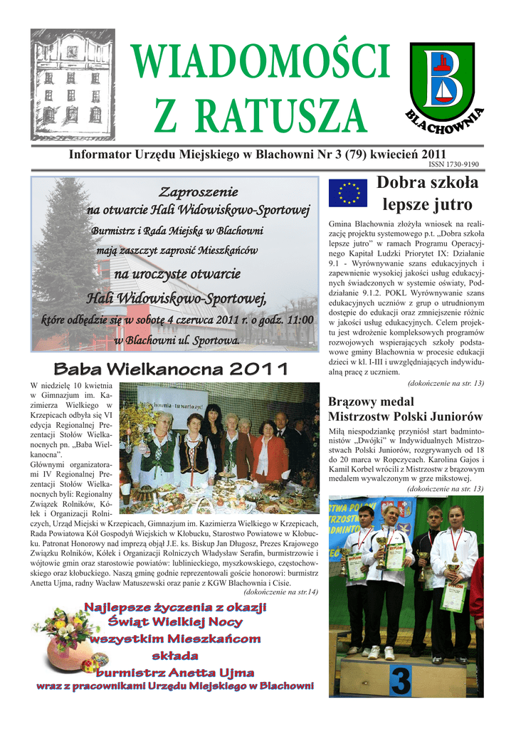 WIADOMOŚCI Z RATUSZA Informator Urzędu Miejskiego w Blachowni Nr 3 (79) kwiecień 2011 ISSN 1730-9190 Zaproszenie na otwarcie Hali Widowiskowo-Sportowej Burmistrz i Rada Miejska w Blachowni mają zaszczyt zaprosić Mieszkańców na uroczyste otwarcie Hali Widowiskowo-Sportowej, które odbędzie się w sobotę 4 czerwca 2011 r. o godz. 11:00 w Blachowni ul. Sportowa. Baba Wielkanocna 2011 W niedzielę 10 kwietnia w Gimnazjum im. Kazimierza Wielkiego w Krzepicach odbyła się VI edycja Regionalnej Prezentacji Stołów Wielkanocnych pn. „Baba Wielkanocna”. Głównymi organizatorami IV Regionalnej Prezentacji Stołów Wielkanocnych byli: Regionalny Związek Rolników, Kółek i Organizacji Rolniczych, Urząd Miejski w Krzepicach, Gimnazjum im. Kazimierza Wielkiego w Krzepicach, Rada Powiatowa Kół Gospodyń Wiejskich w Kłobucku, Starostwo Powiatowe w Kłobucku. Patronat Honorowy nad imprezą objął J.E. ks. Biskup Jan Długosz, Prezes Krajowego Związku Rolników, Kółek i Organizacji Rolniczych Władysław Serafin, burmistrzowie i wójtowie gmin oraz starostowie powiatów: lublinieckiego, myszkowskiego, częstochowskiego oraz kłobuckiego. Naszą gminę godnie reprezentowali goście honorowi: burmistrz Anetta Ujma, radny Wacław Matuszewski oraz panie z KGW Blachownia i Cisie. (dokończenie na str.14) Najlepsze życzenia z okazji Świąt Wielkiej Nocy wszystkim Mieszkańcom składa burmistrz Anetta Ujma wraz z pracownikami Urzędu Miejskiego w Blachowni Dobra szkoła lepsze jutro Gmina Blachownia złożyła wniosek na realizację projektu systemowego p.t. „Dobra szkoła lepsze jutro” w ramach Programu Operacyjnego Kapitał Ludzki Priorytet IX: Działanie 9.1 - Wyrównywanie szans edukacyjnych i zapewnienie wysokiej jakości usług edukacyjnych świadczonych w systemie oświaty, Poddziałanie 9.1.2. POKL Wyrównywanie szans edukacyjnych uczniów z grup o utrudnionym dostępie do edukacji oraz zmniejszenie różnic w jakości usług edukacyjnych. Celem projektu jest wdrożenie kompleksowych programów rozwojowych wspierających szkoły podstawowe gminy Blachownia w procesie edukacji dzieci w kl. I-III i uwzględniających indywidualną pracę z uczniem. (dokończenie na str. 13) Brązowy medal Mistrzostw Polski Juniorów Miłą niespodziankę przyniósł start badmintonistów „Dwójki” w Indywidualnych Mistrzostwach Polski Juniorów, rozgrywanych od 18 do 20 marca w Ropczycach. Karolina Gajos i Kamil Korbel wrócili z Mistrzostw z brązowym medalem wywalczonym w grze mikstowej. (dokończenie na str. 13) W Krzyżu miłości nauka foto Alina Bensz Rok duszpasterski 2010-2011 w archidiecezji częstochowskiej, zgodnie z wolą abp Stanisława Nowaka metropolity częstochowskiego, jest obchodzony jako Rok Peregrynacji Krzyża we wszystkich parafiach i wspólnotach archidiecezji. Krzyż z relikwiami nawiedza każdą parafię, a jego nawiedzinom towarzyszą sześciodniowe misje, które mają na celu odnowienie w ochrzczonych łaski wierności Krzyżowi Chrystusowemu, wolę wytrwania przy nim na wzór Maryi oraz chęć głoszenia i obrony krzyża w życiu indywidualnym, rodzinnym i społecznym - czytamy w Dekrecie dotyczącym peregrynacji krzyża świętego oraz misji ją poprzedzających. Peregrynacji Krzyża i Misjom jej towarzyszącym przyświeca hasło a zarazem zawołanie biskupie naszego ks. abp Stanisława Nowaka „Chcę pod Krzyżem stać przy Tobie”. Fragmenty drzewa świętego, na którym umarł Jezus Chrystus zawitały także do parafii w gminie Blachownia: 7 marca - Św. Franciszka z Asyżu, 16 marca - Św. Michała Archanioła i 31 marca - Najświętszego Zbawiciela. Do tej uroczystości wierni przygotowywali się przez Misje Ewangelizacyjne, w trakcie których miała miejsce m. in. intronizacja Biblii i odnowienie przyrzeczeń chrzcielnych. Towarzyszyły im dwa znaki: Biblia i Krzyż. Uroczystości zgromadziły rzesze mieszkańców wraz z duchowieństwem dekanatu blachowieńskiego. Krzyż przywiózł specjalnie przygotowany na tę okazję samochód – kaplica krzyża. Udekorowanymi odświętnie trasami przemarszu procesji, relikwie krzyża do kościołów parafialnych nieśli ich proboszczowie. W każdej parafii obecny był jeden z Księży Biskupów, który przewodniczył Eucharystii, wygłosił naukę oraz udzielił błogosławieństwa na życie wierne Ewangelii i Krzyżowi. W czasie doby, w której obecny był w parafii peregrynujący 31 marca mszy św. na powitanie relikwii Krzyż trwały całonocne czuwania modlitewne mieszkańców. (f) w parafii Najświętszego Zbawiciela przewodniczył ks. abp Stanisław Nowak Katolicki Klub Turystyki Aktywnej w Blachowni Jesteśmy nieformalnym klubem ludzi, którzy uwielbiają aktywnie spędzać wolny czas. W ramach naszych pasji uciekamy od wszechobecnej tv, wyłączamy komputery i szukamy kontaktu z naturą. Wykorzystujemy do tego celu wszelkie dostępne nam formy aktywnego wypoczynku. Kiedy jest okazja, wybieramy się na górskie wycieczki, biegamy i spacerujemy po okolicznych lasach, a już maniactwem niektórych z nas jest jazda na rowerze – to potrafi prawie każdy. Większość posiada rowery (super - wyczynowe nie są potrzebne), a okolice piękne, dlatego szkoda oglądać je zza szyby samochodu. Nasze zainteresowania wychodzą poza sport amatorski, staramy się także działać na polu kulturalnym, promowaniu młodych talentów oraz organizowaniu wystaw i małych form teatralnych. Nasze działania są organizowane w duchu uniwersalnych wartości chrześcijańskich. Zależy nam, aby poza wspomnieniami z wyjazdów pozostały cenne przemyślenia i refleksje na przyszłość. (ze strony internetowej www.kkta.pl) Niezmiennie zapraszamy w każdą niedzielę na godzinkę aktywnego relaksu. Prawie w południe, bo o godzinie 12.30, wyruszamy na leśne ścieżki z niewielkiego parkingu, tuż za mostkiem, na drodze prowadzącej do Cisia. Mile widziani będą również piechurzy, bo i w taki sposób odczujemy przyjemność z 